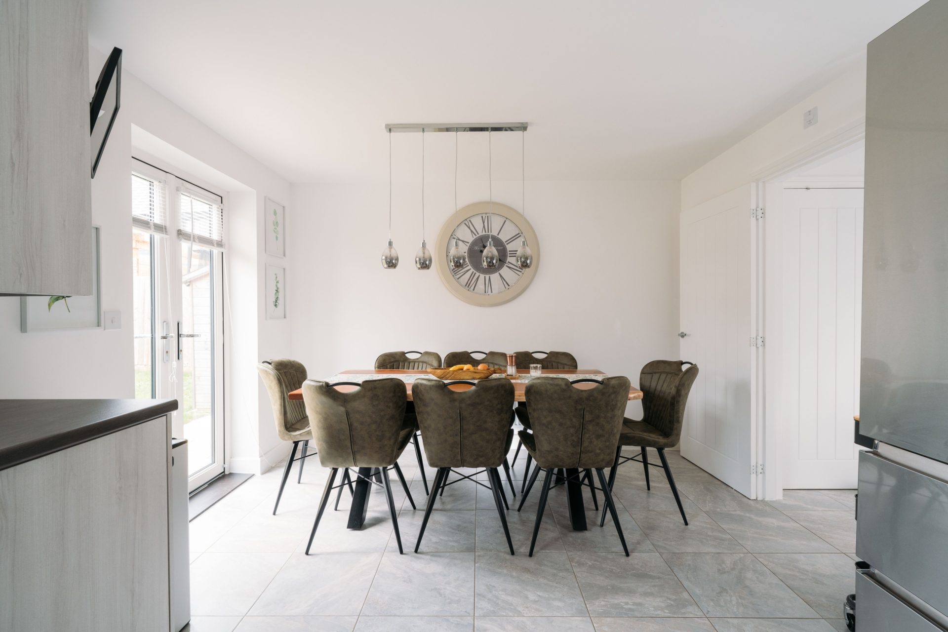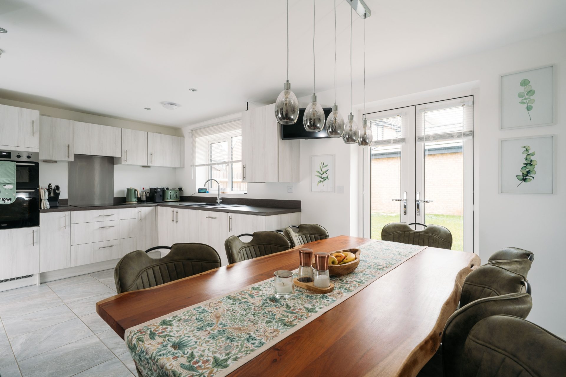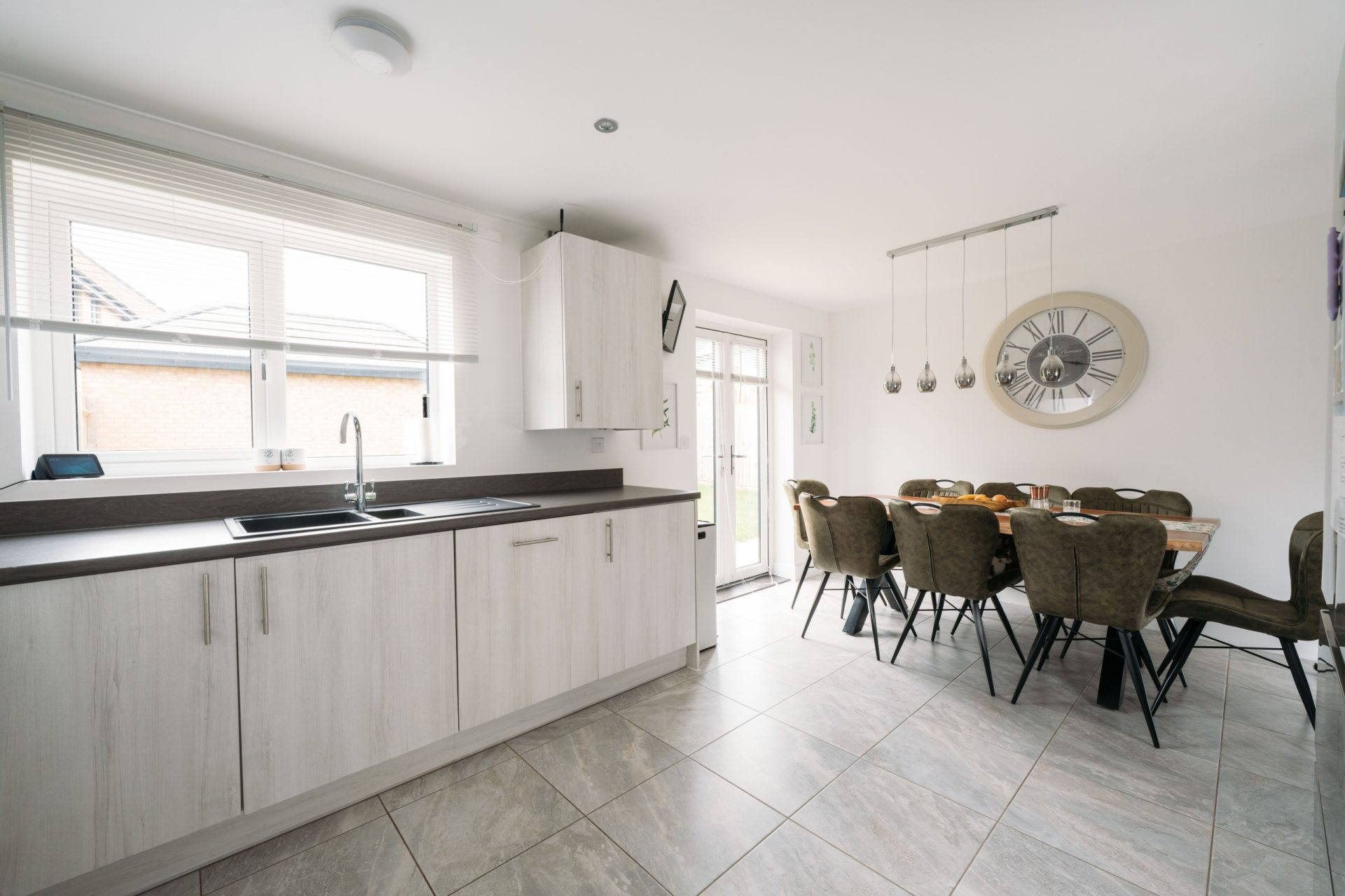 To the rear, the house opens into a generous kitchen/dining room, designed for modern family life. The kitchen is fitted with a range of contemporary wall and base units, complemented by generous worktop space and integrated appliances including a double oven. A window above the sink brings in further light, while the dining area comfortably accommodates a full-sized table. French doors lead directly out to the rear garden, creating a seamless indoor/outdoor flow during warmer months.