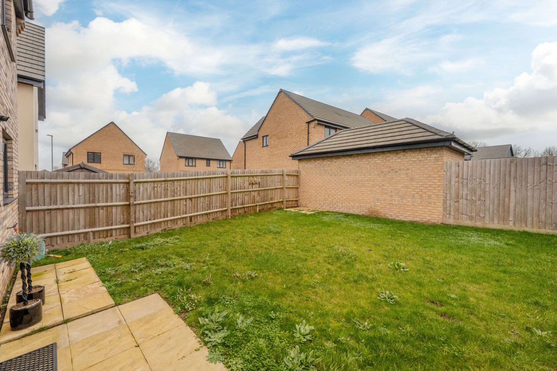 The rear garden is fully enclosed and mainly laid to lawn, offering a safe and secure outdoor space. A paved seating area provides a natural spot for outdoor dining, with side access via a gate and a useful timber shed for storage.