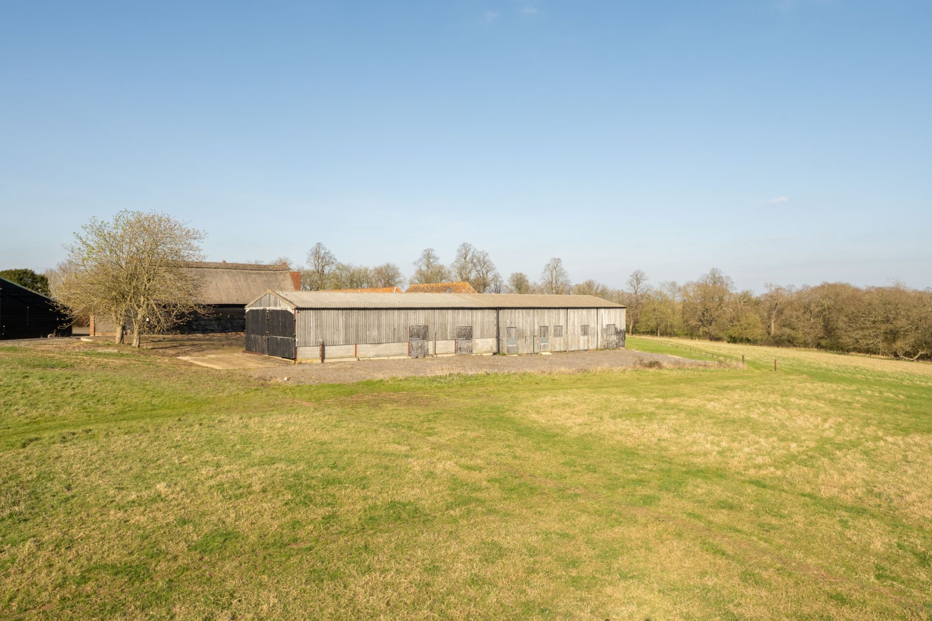 The thatched barn is a charming Grade II listed structure of featherboard construction with a pitched thatched roof. It is believed to have been a former threshing barn