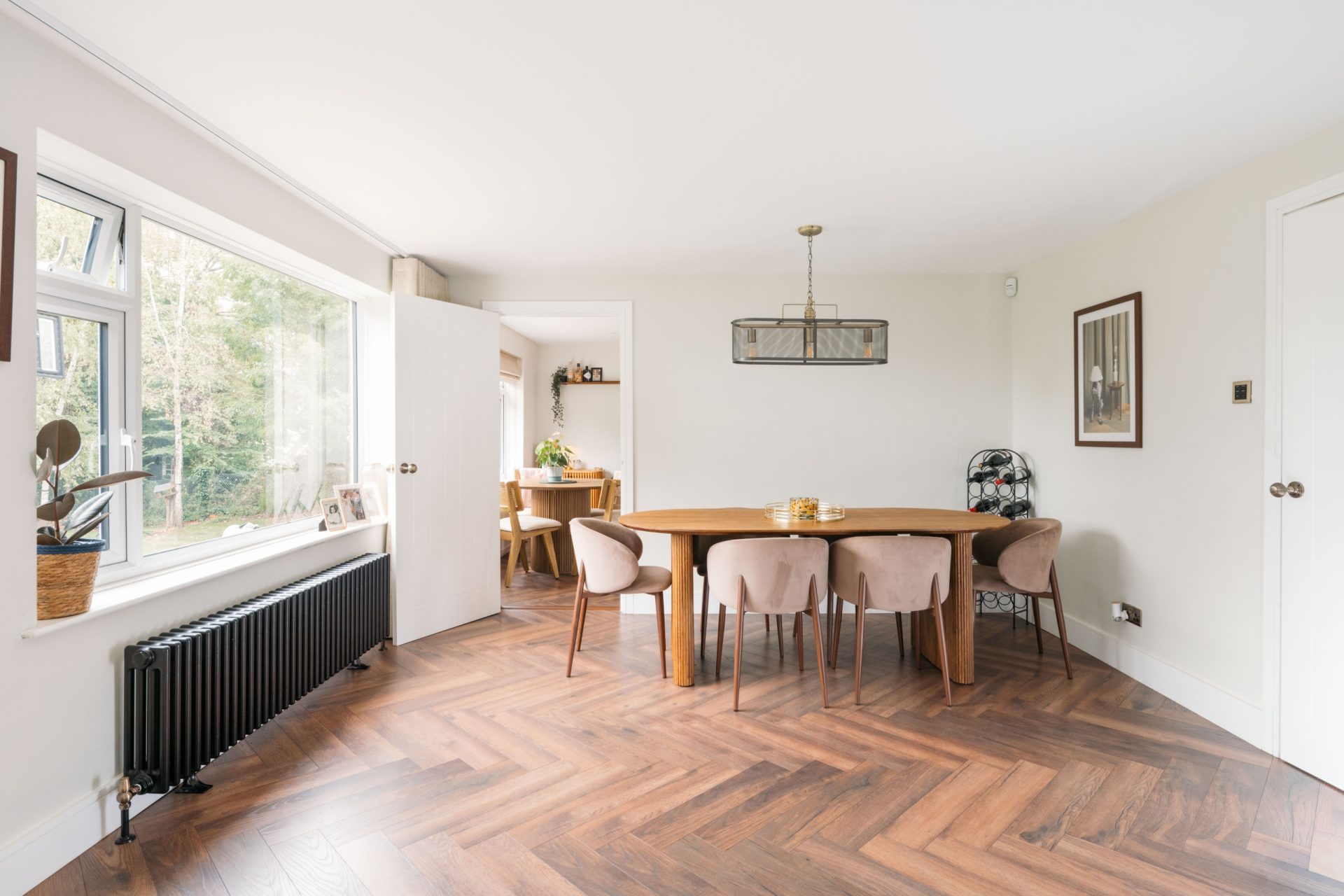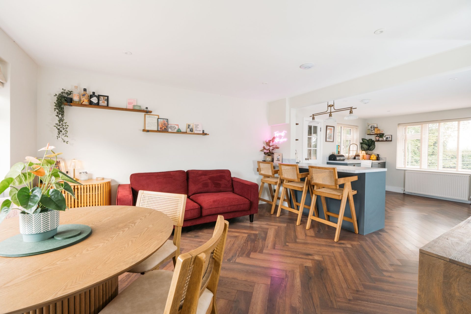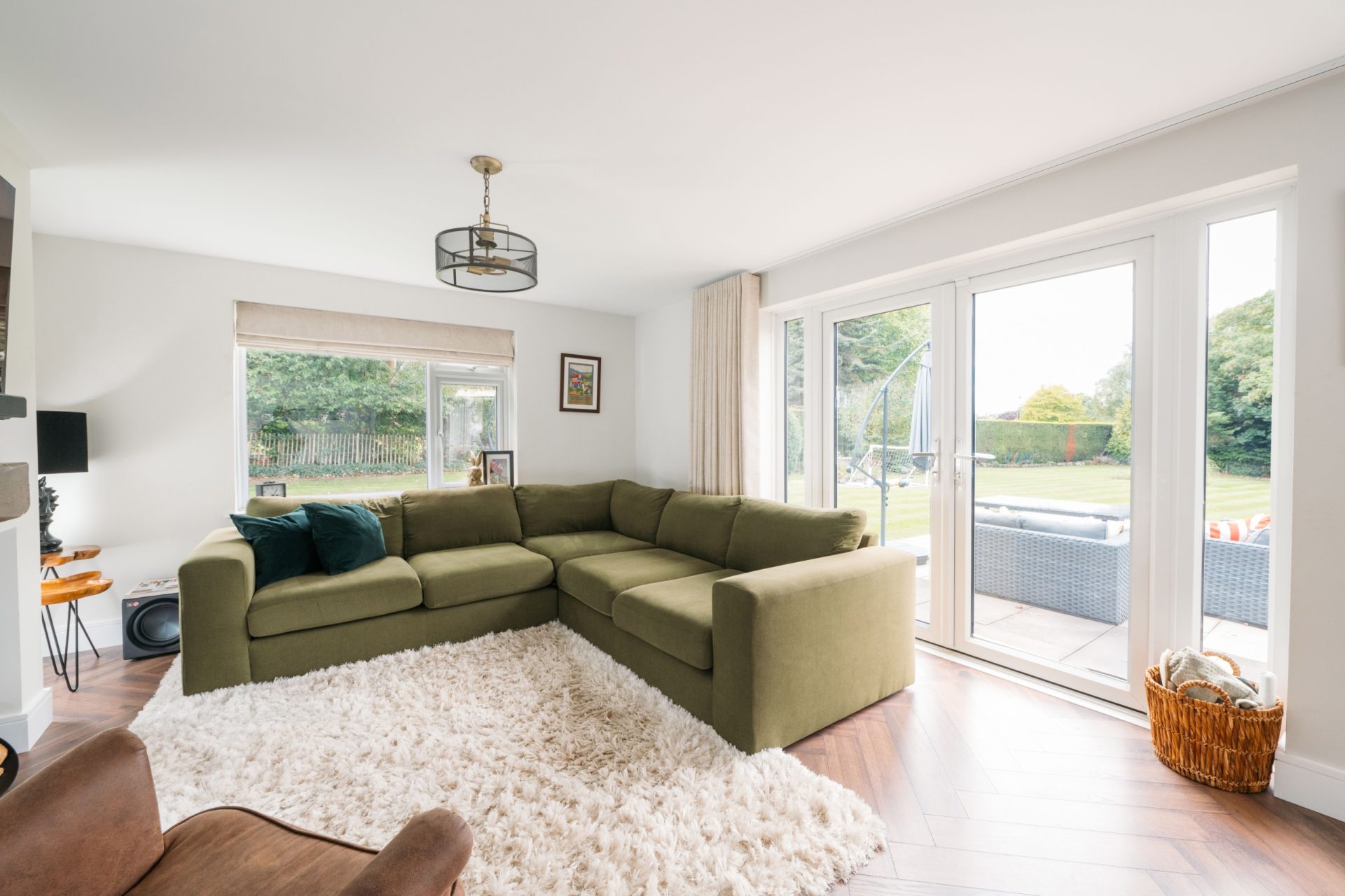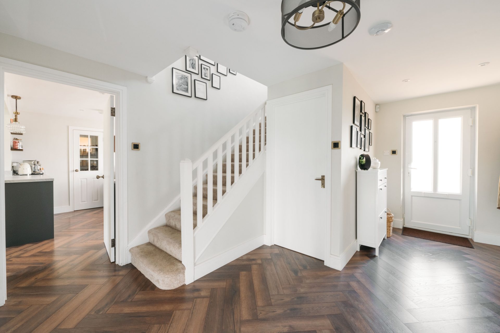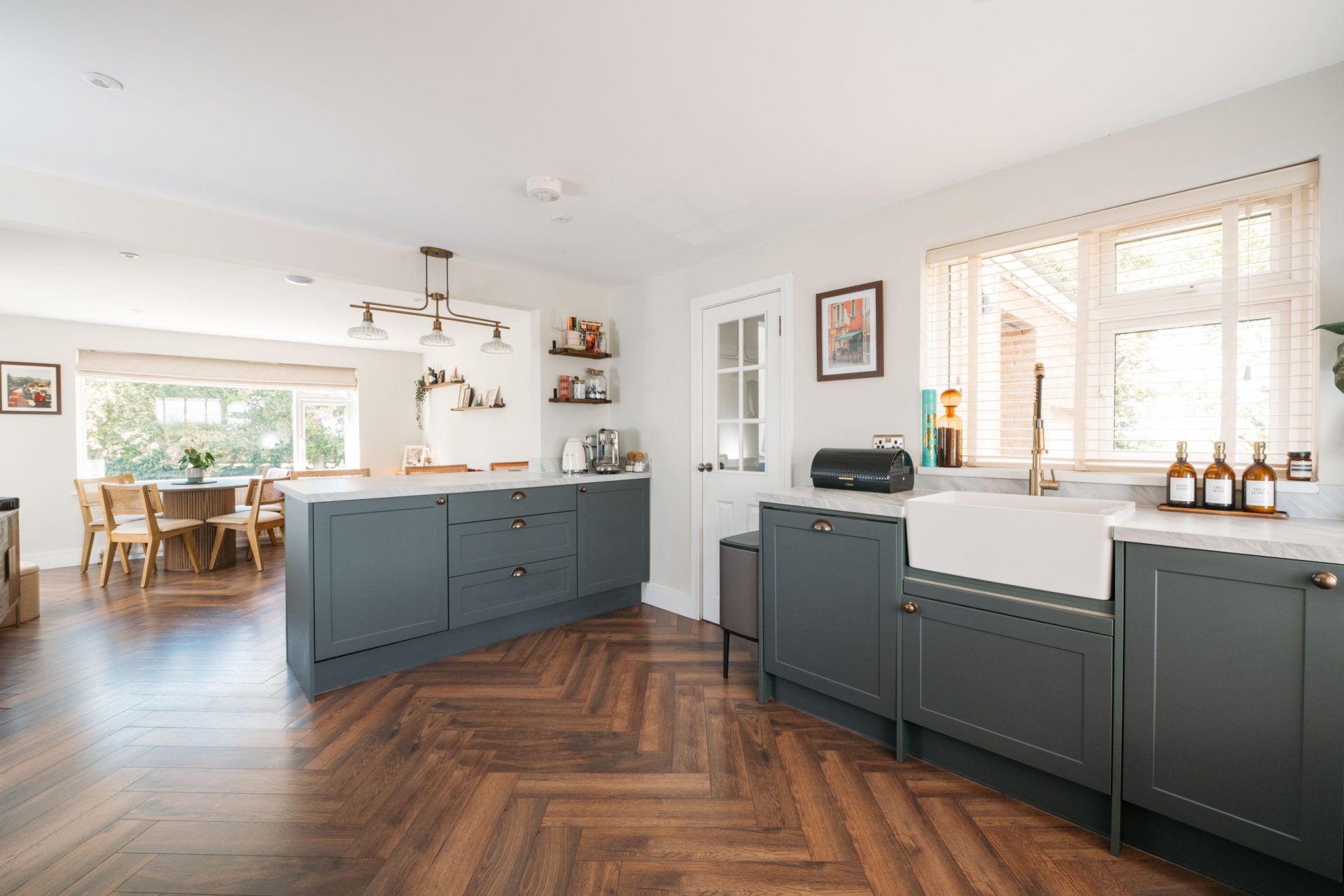 The ground floor is centred around a bright and spacious entrance hall with warm herringbone flooring and a modern staircase that sets the tone for the rest of the house. From here, the accommodation flows into a beautifully designed kitchen, dining and family room, which has been finished with a farmhouse influence and a contemporary edge. The kitchen is fitted with deep green cabinetry, complemented by marble-effect work surfaces and a traditional butler sink beneath a large window overlooking the garden. A dedicated pantry provides excellent storage, while the layout ensures the space is both practical and inviting.