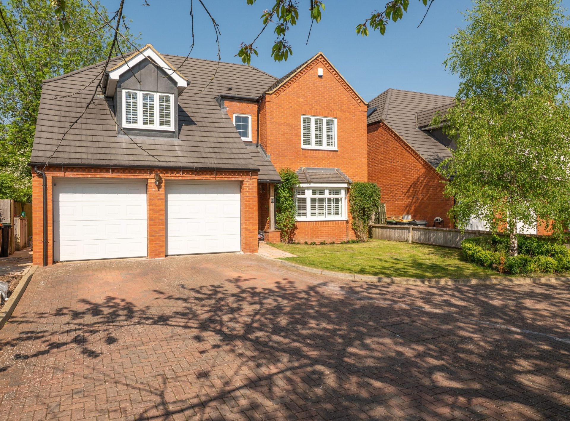 The front of the property features a block-paved driveway with space for three vehicles, leading to the double garage. The landscaped frontage creates an attractive approach.