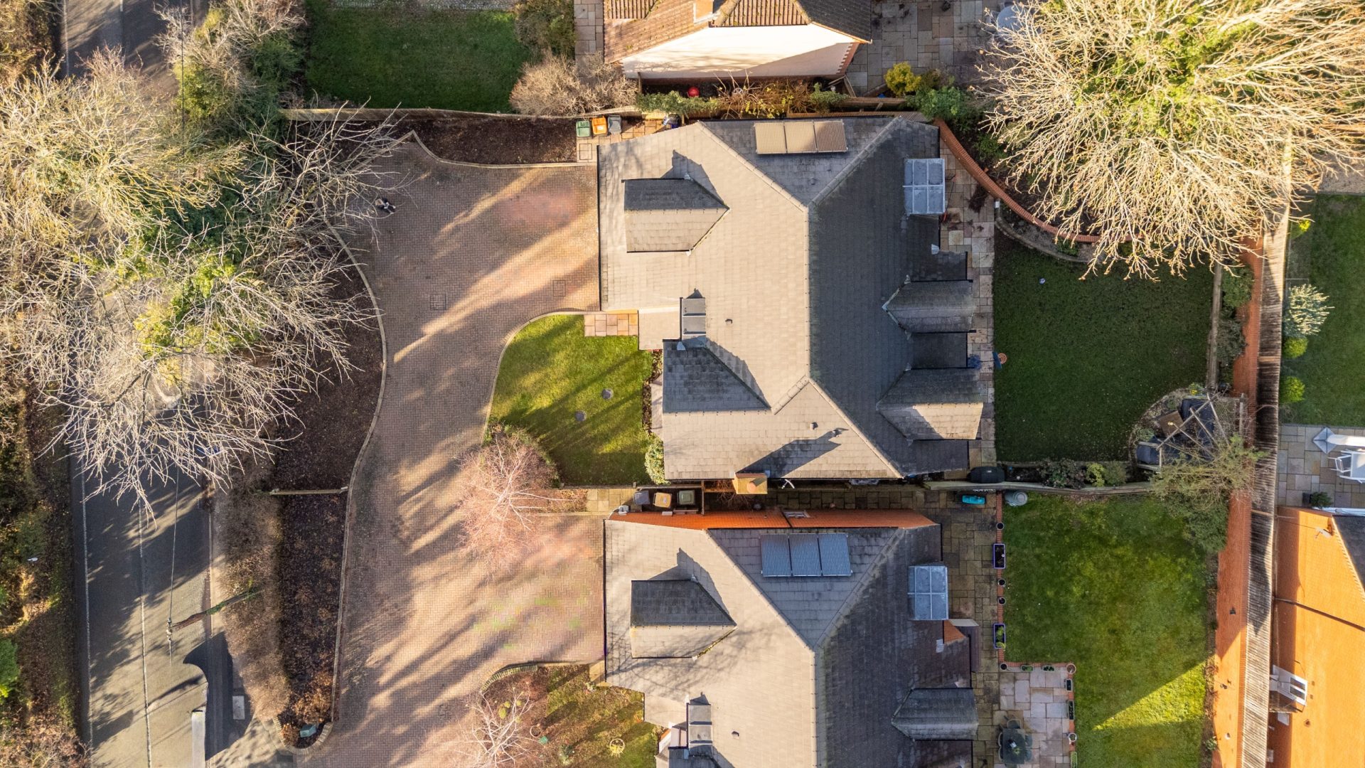 At the rear, the garden is designed for both form and function. A well-maintained lawn is bordered by raised flower beds. Outdoor lighting allows the space to be enjoyed into the evening, and a broad patio area wraps around the rear of the house, accessible via bifold and French doors from the kitchen and dining room.
