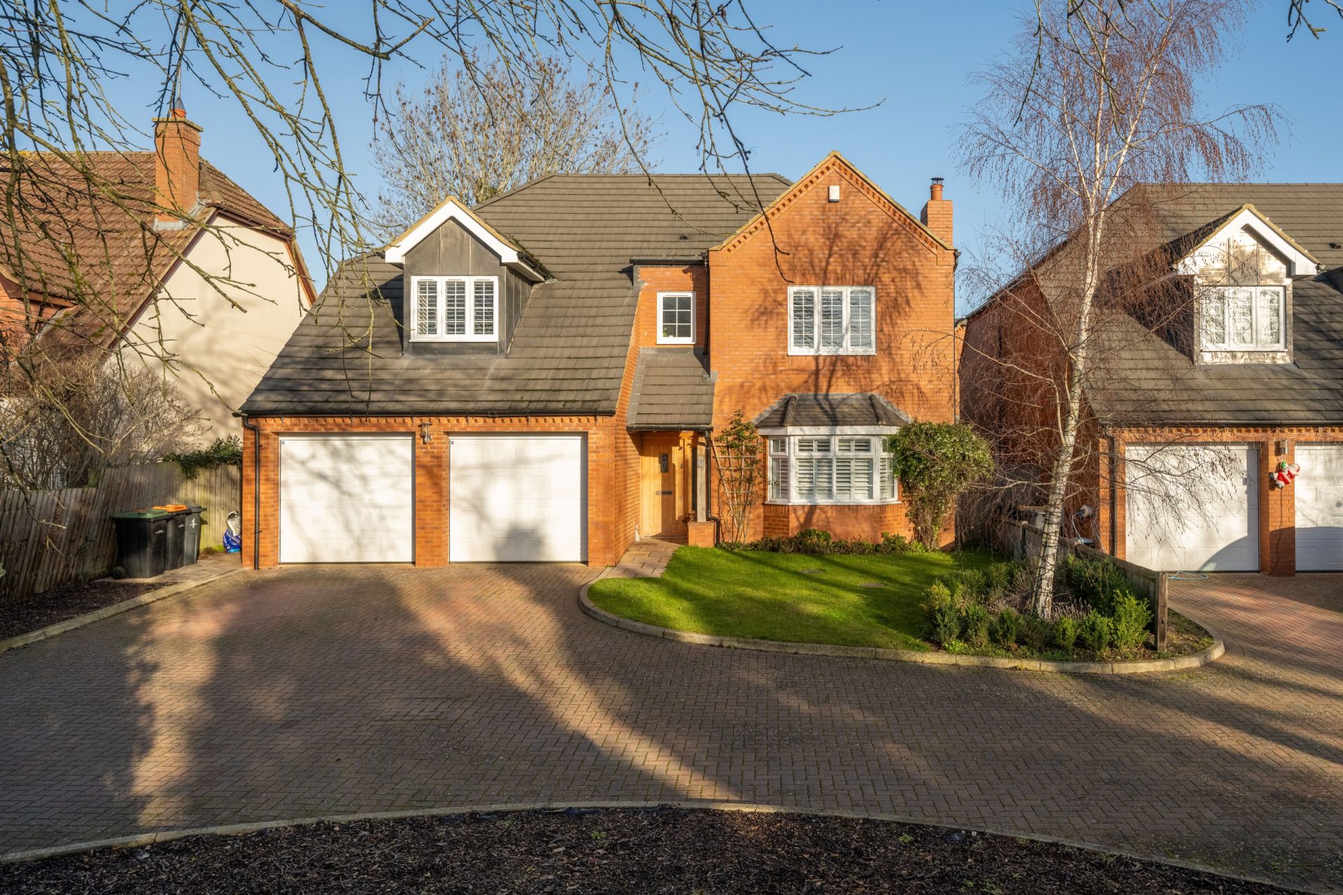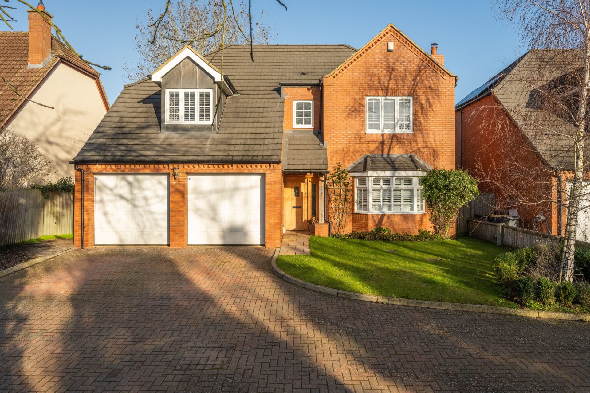The front of the property features a block-paved driveway with space for three vehicles, leading to the double garage. The landscaped frontage creates an attractive approach.