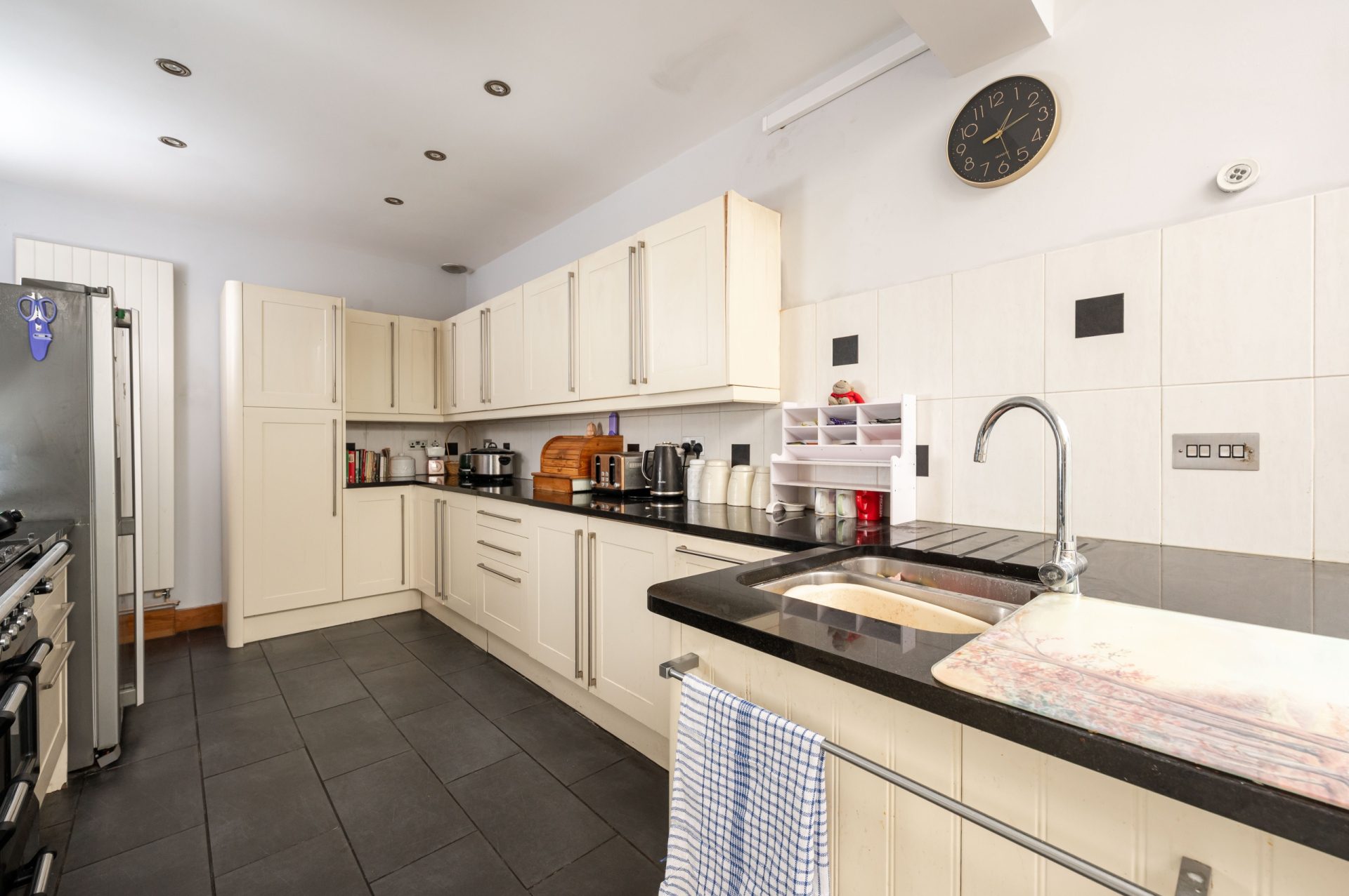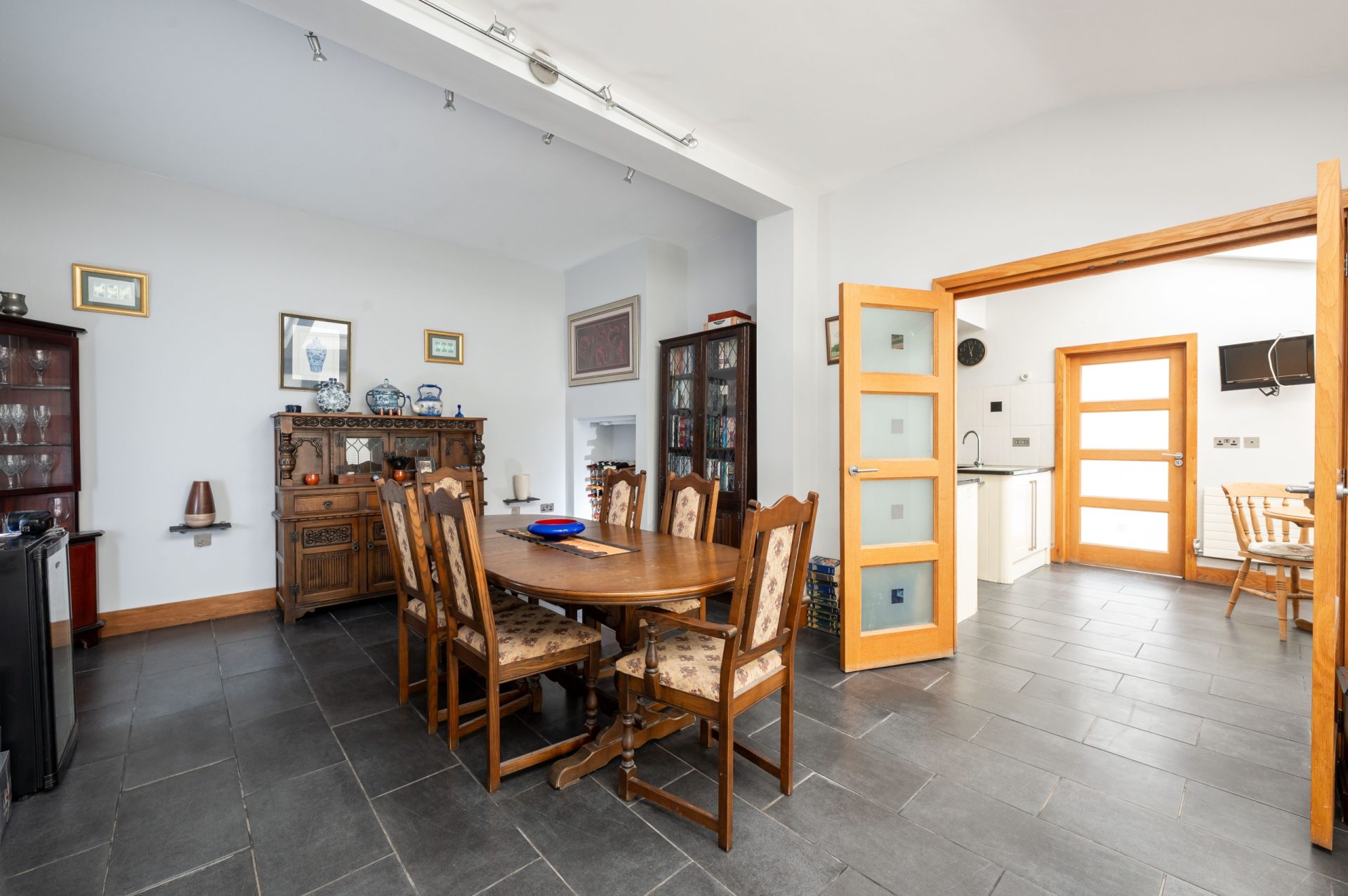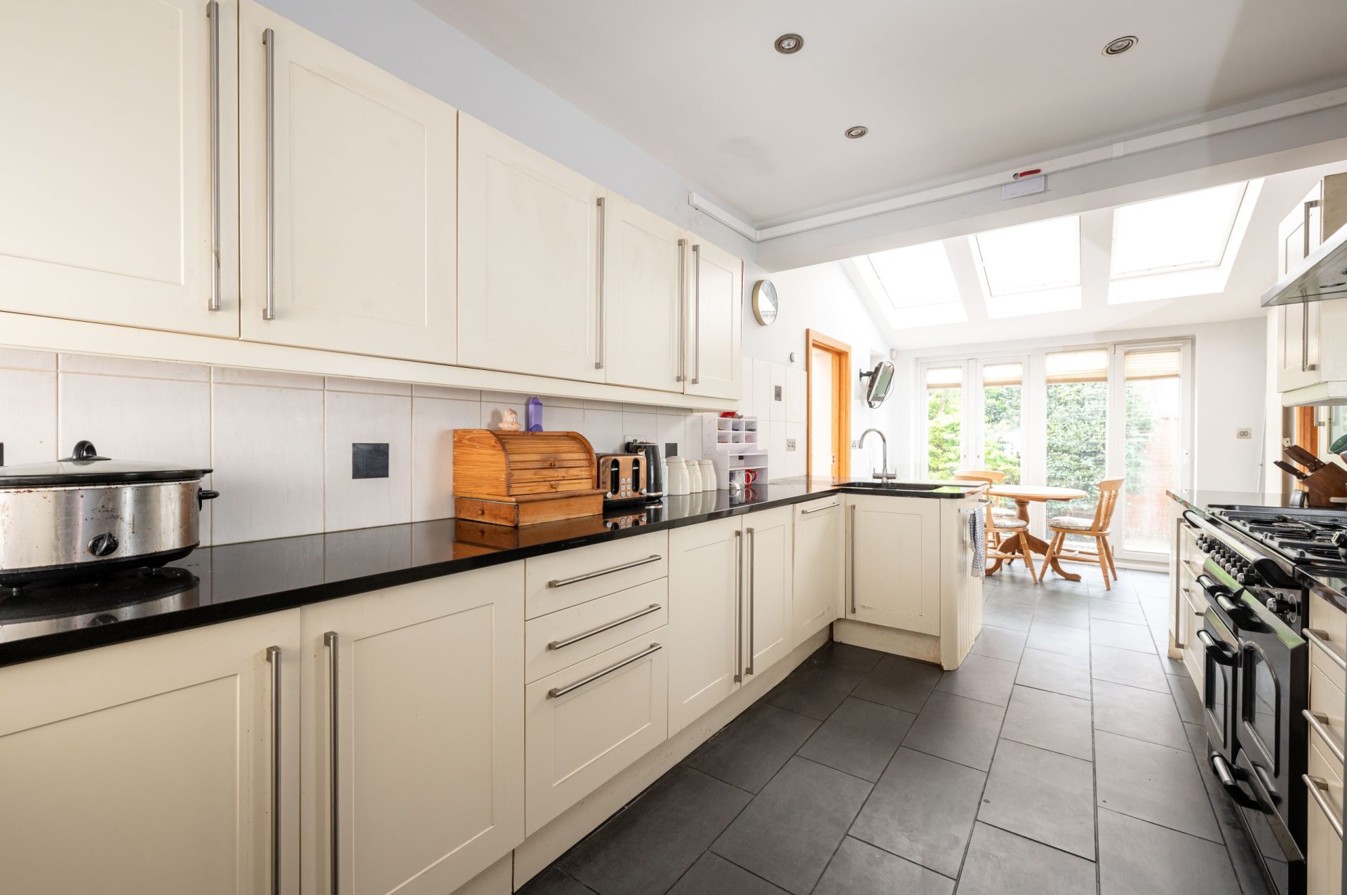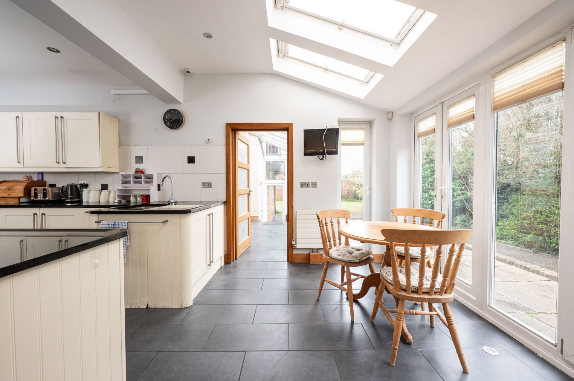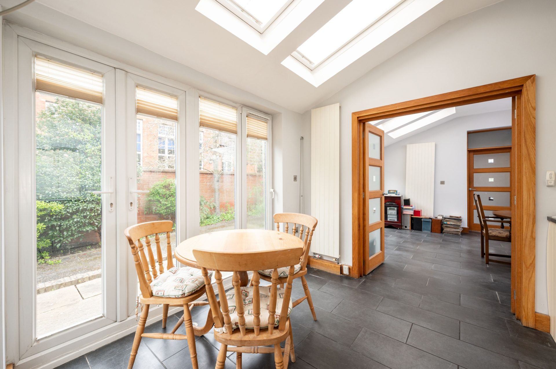 To the rear, the house opens into the kitchen and dining space, forming the home's central hub. The kitchen provides generous storage and preparation space, with a layout that flows naturally into a bright dining area beneath rooflights and alongside full-height glazing. This space benefits from excellent natural light and direct access to the garden. The Kitchen is further enhanced by a large utility room.