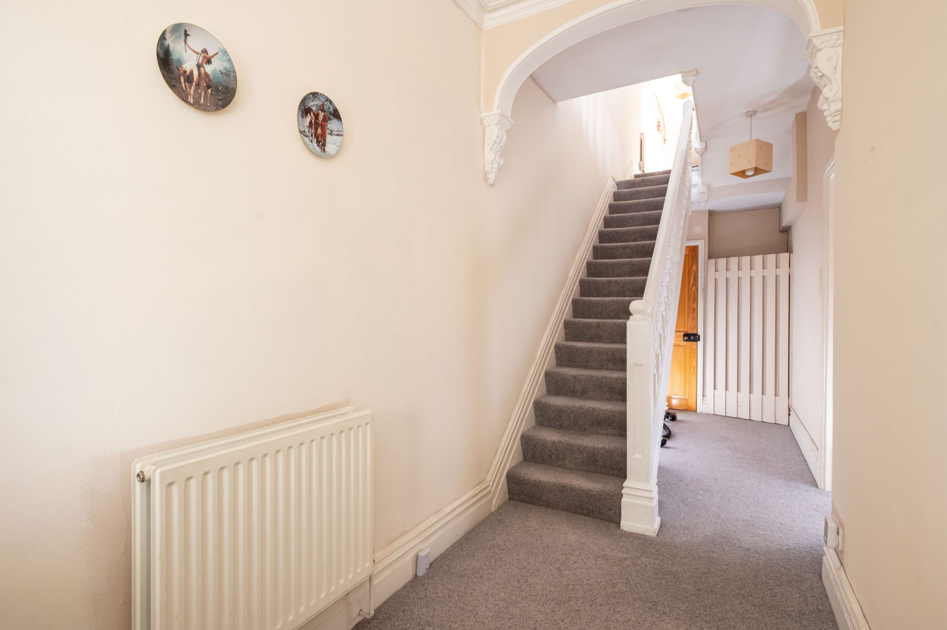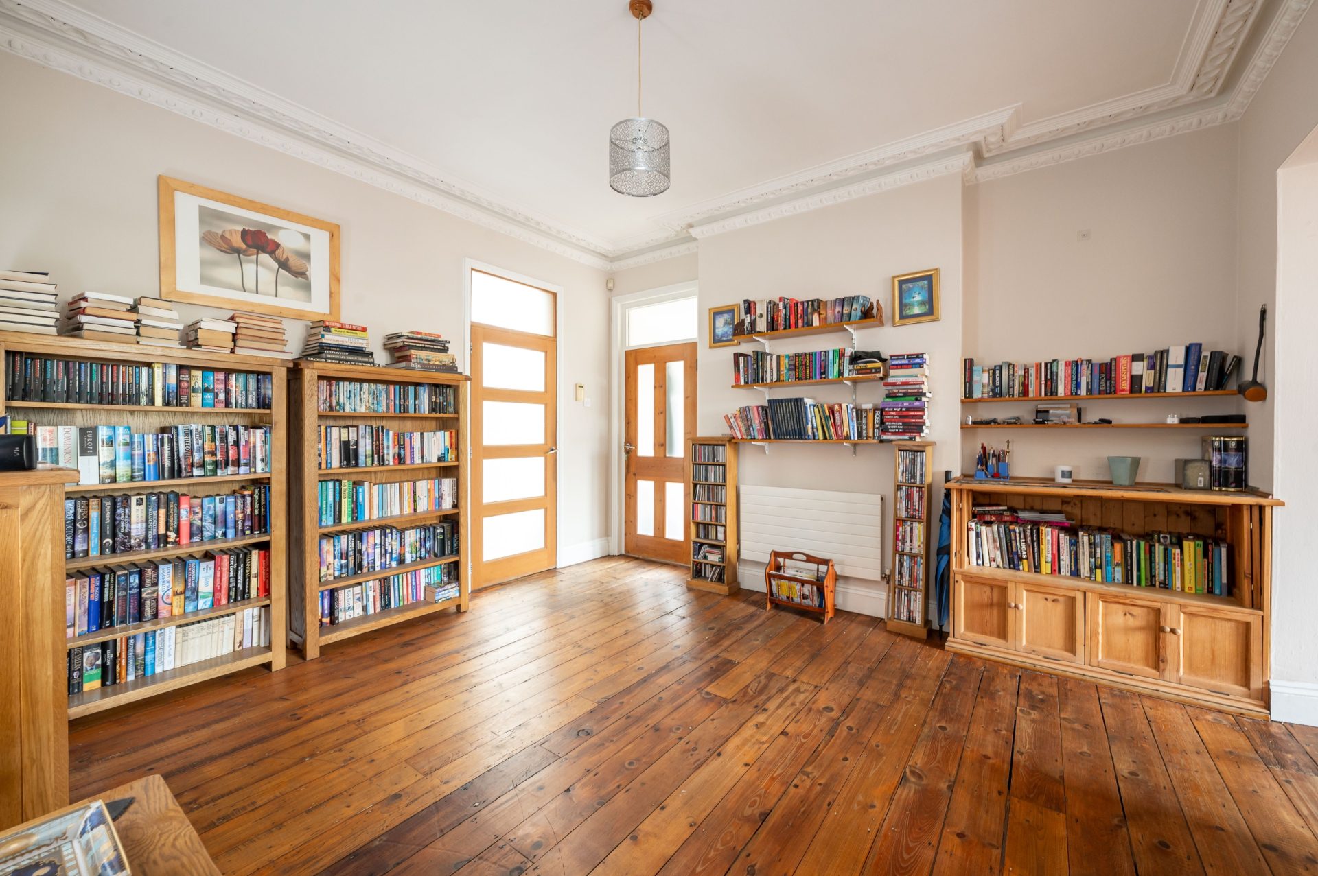 The property is entered via a central hallway, where the proportions and ceiling height immediately reflect the home’s period origins.