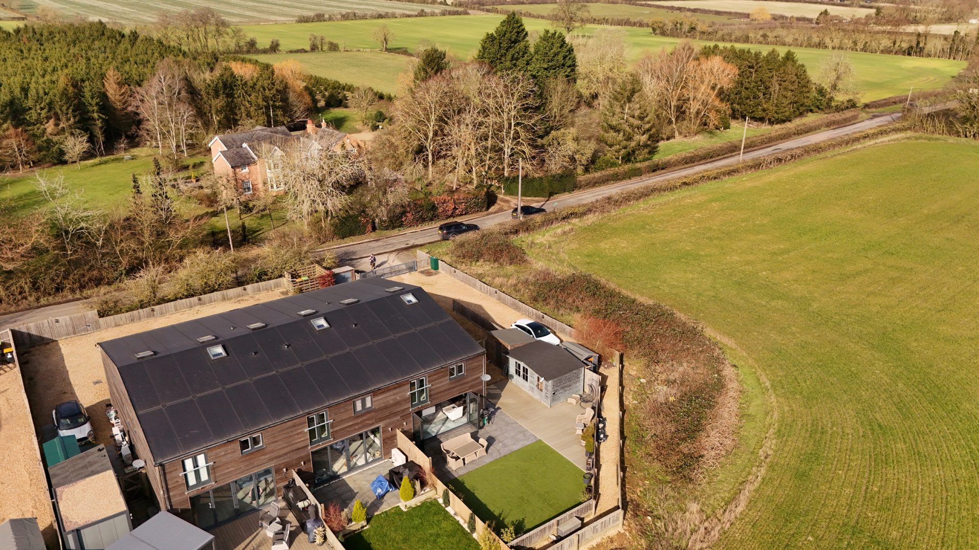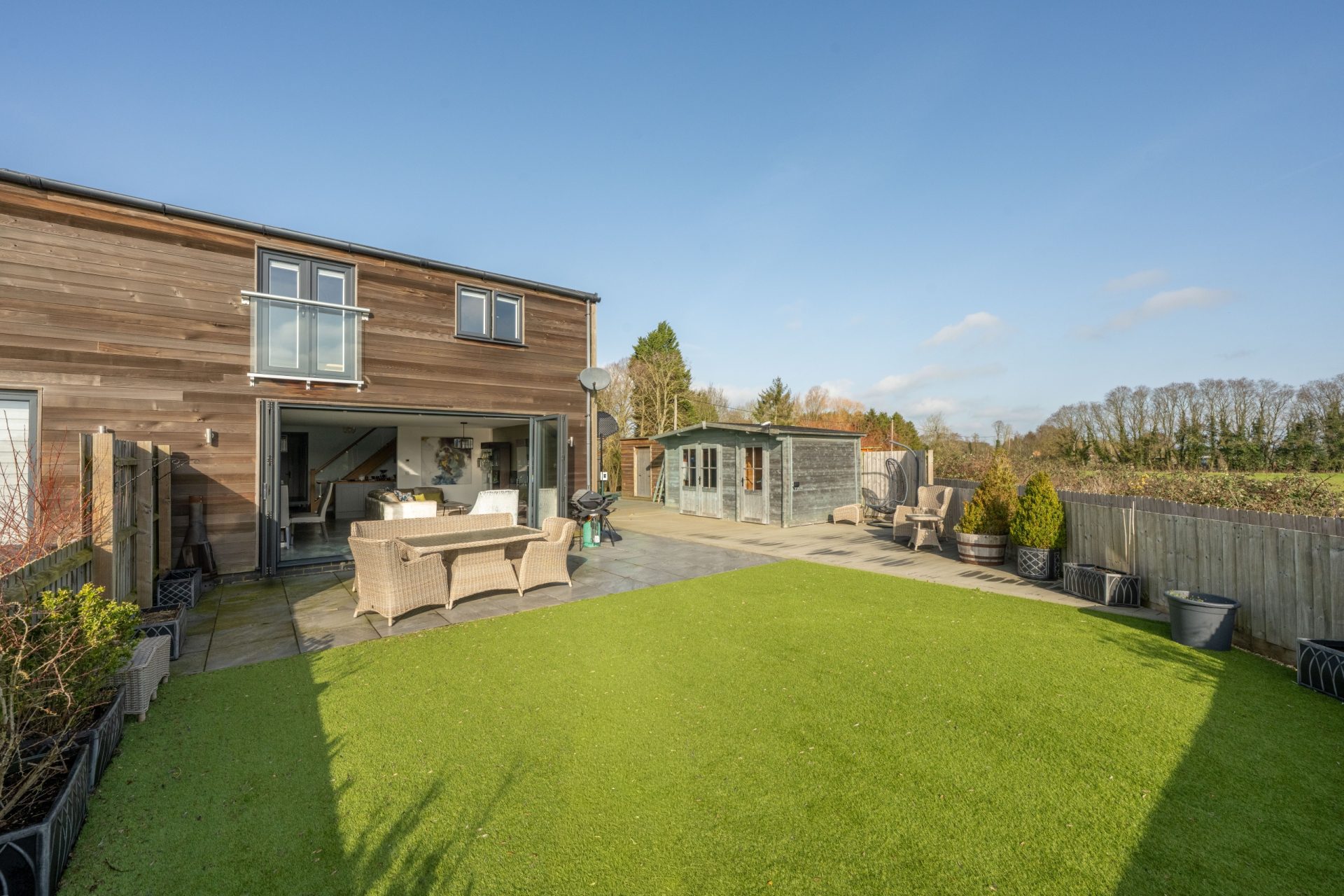 Constructed with cedar-clad elevations and clean architectural lines, the property offers a modern interpretation of rural living. Expansive glazing, a dramatic double-height gallery and full-width bi-fold doors define the interior, creating a home characterised by light, volume and connection to the surrounding landscape. The accommodation is arranged over two floors and offers flexible living as either three or four bedrooms, with underfloor heating throughout the ground floor and generous off-road parking for four vehicles.