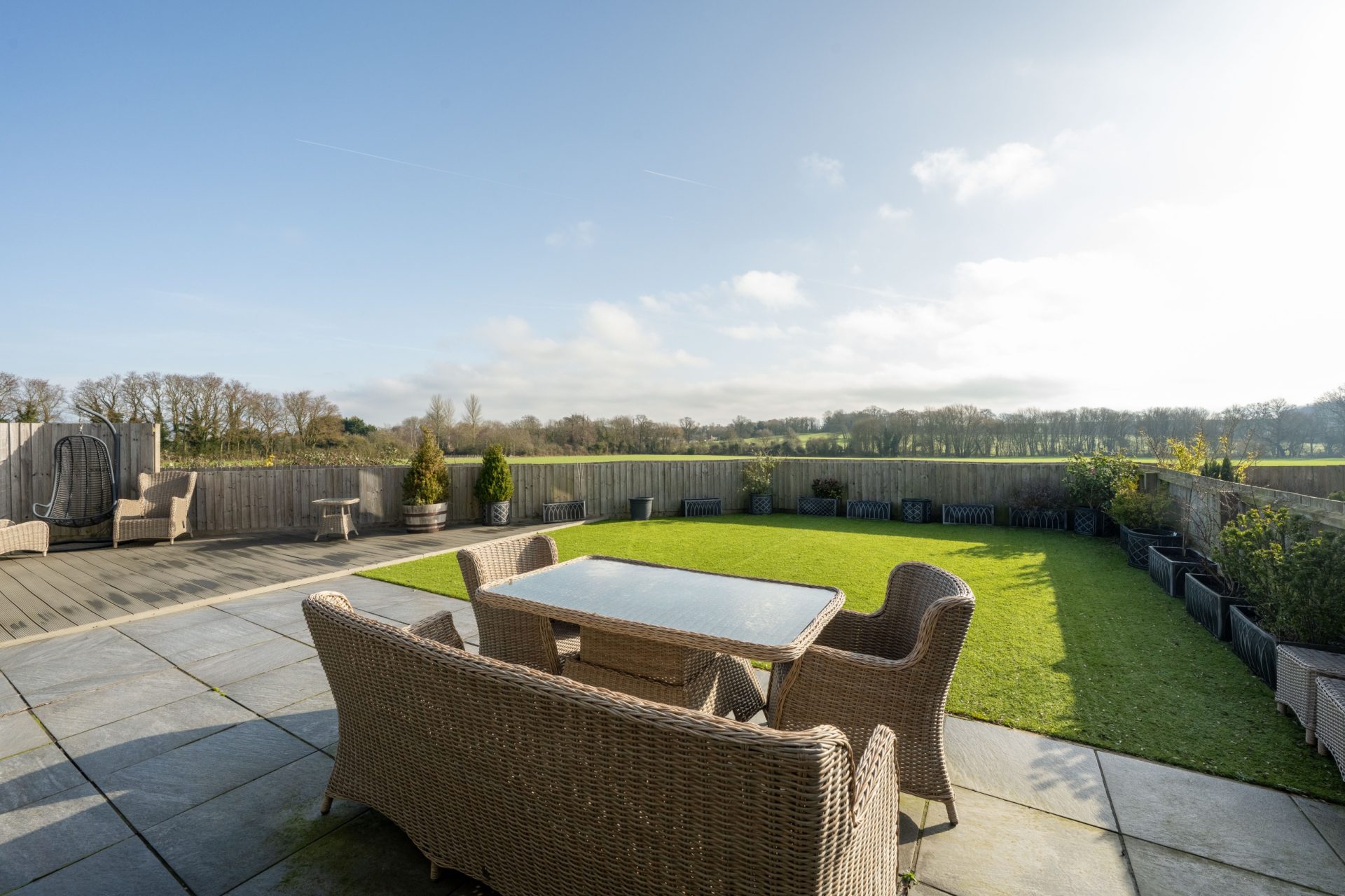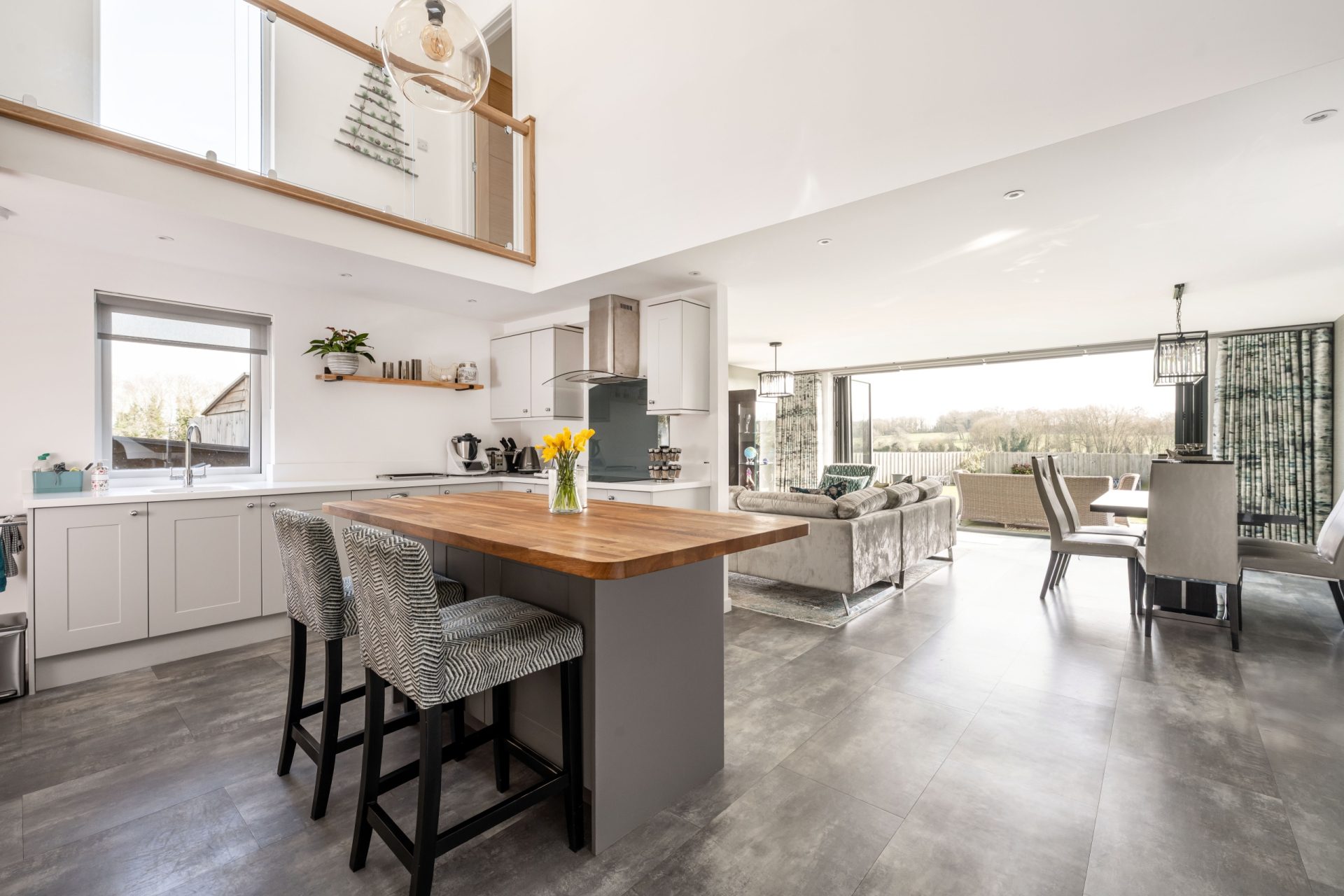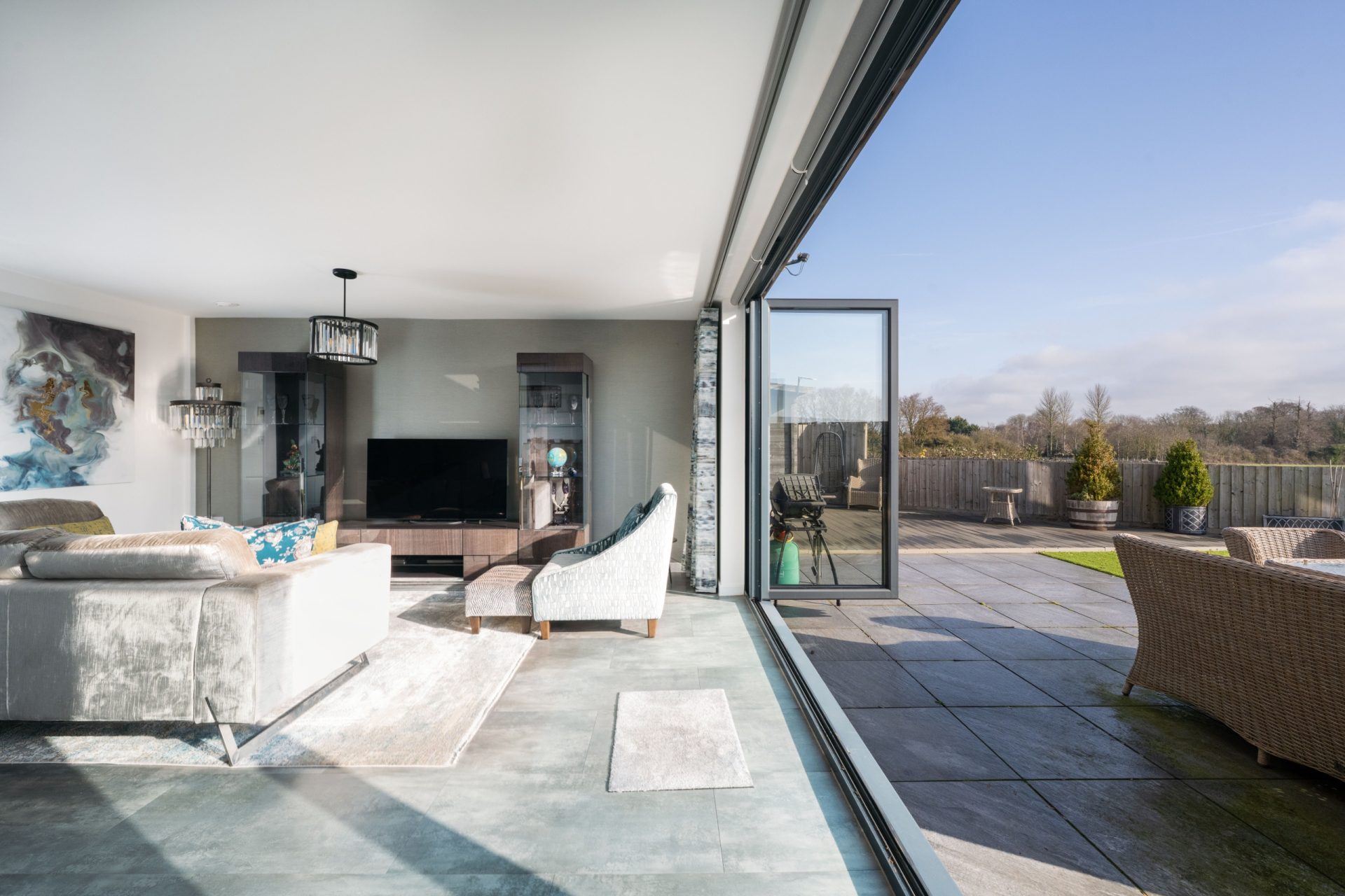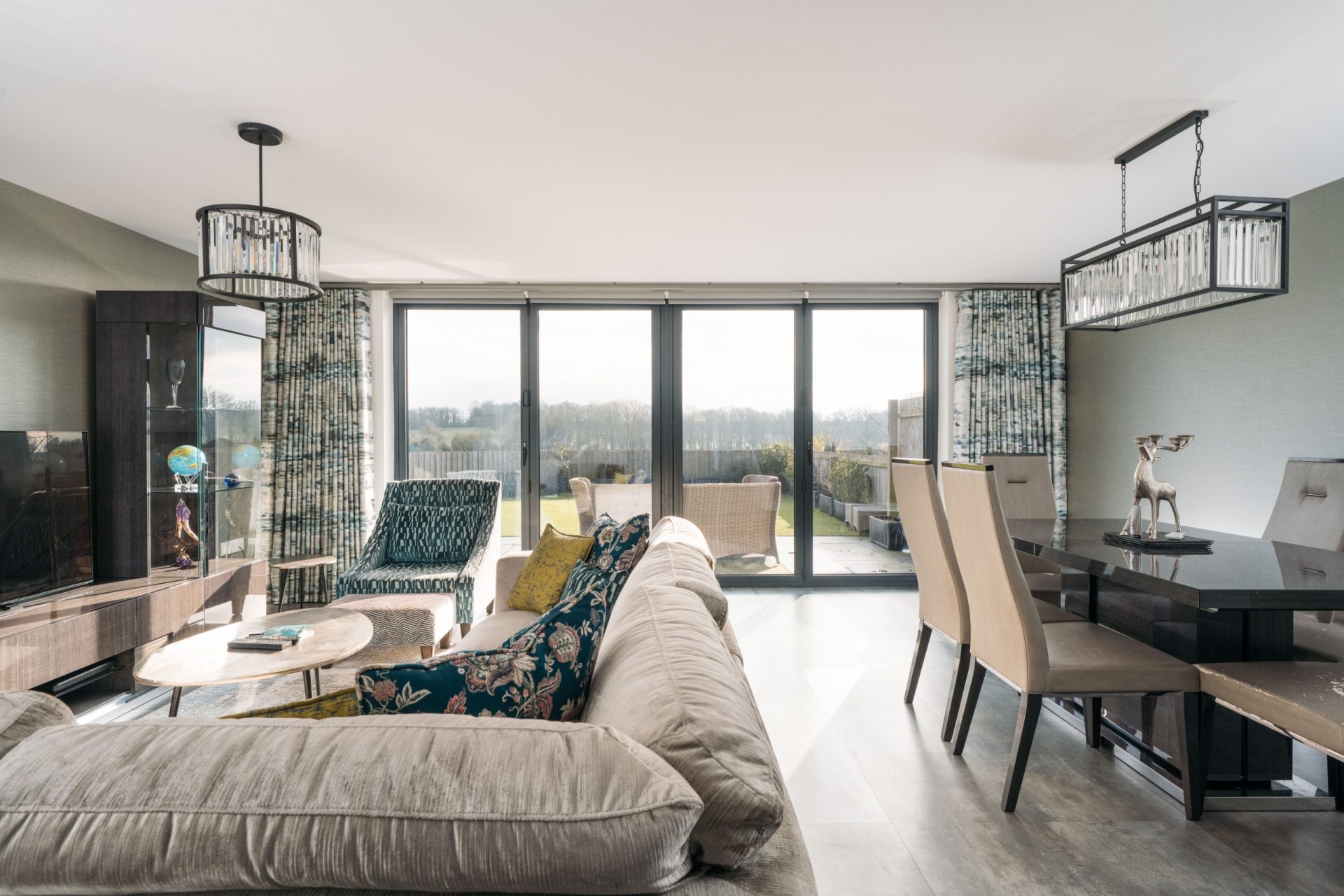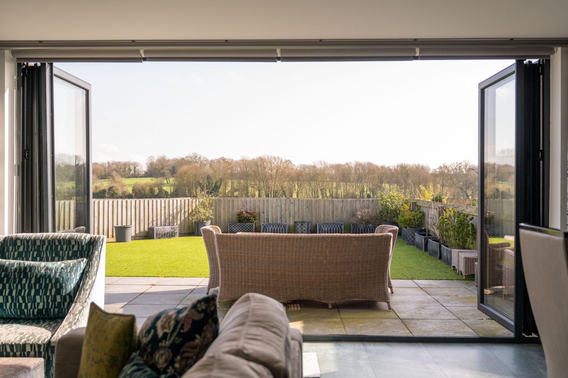 Full-width bi-fold doors span the rear elevation, framing open countryside views and allowing the paved terrace to become a natural extension of the living space during warmer months. The proportions comfortably accommodate both sitting and dining areas, with a layout suited equally to everyday family living and entertaining.