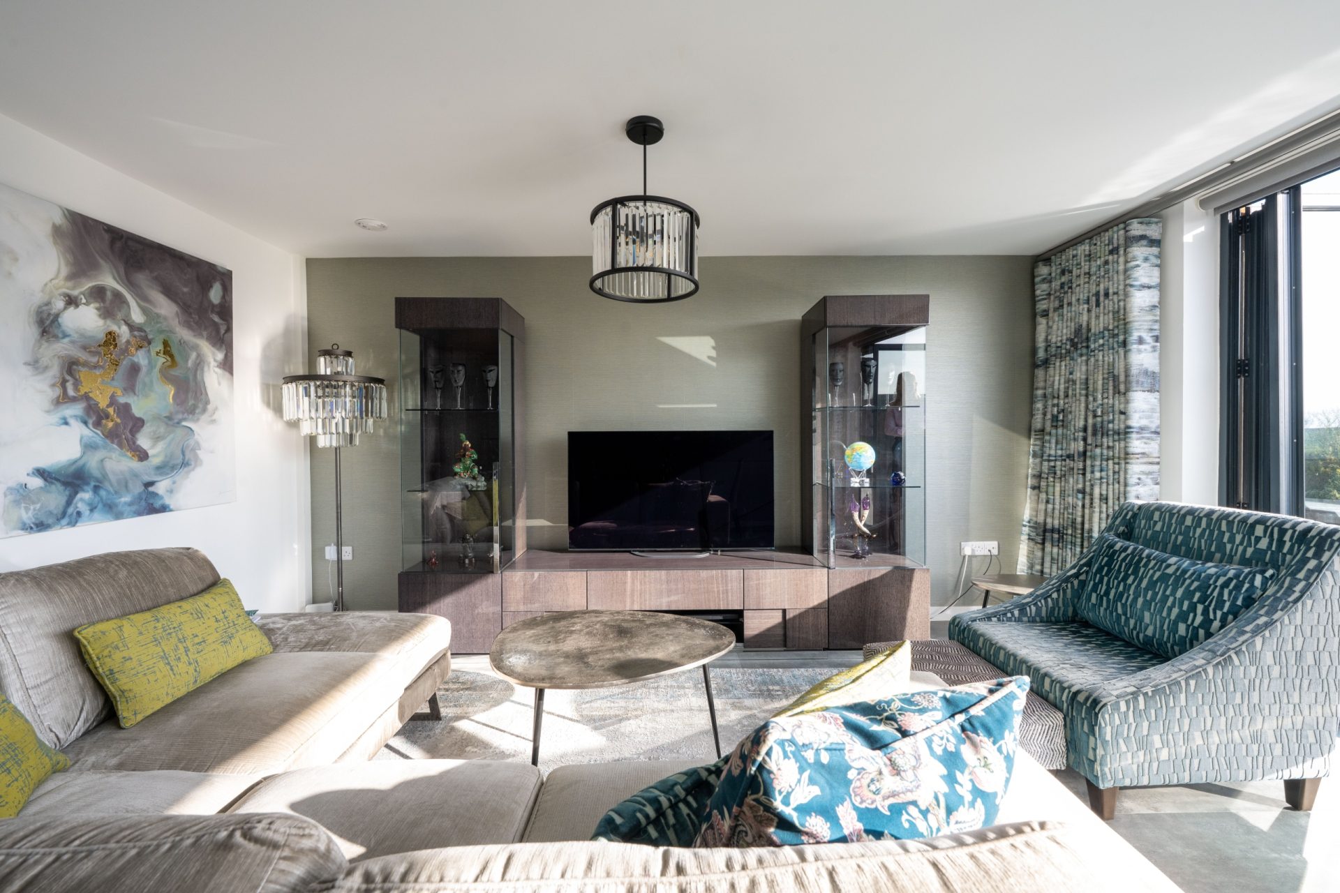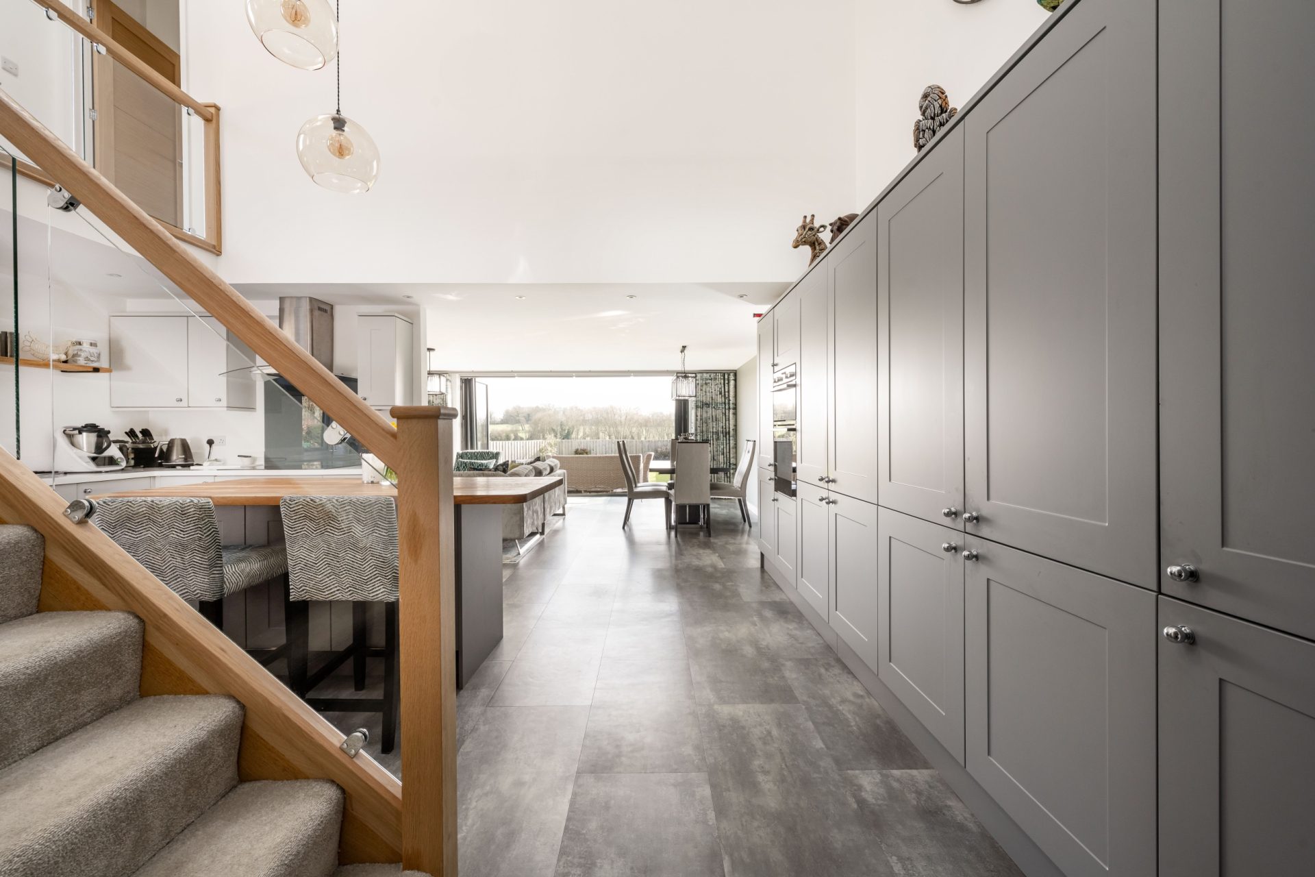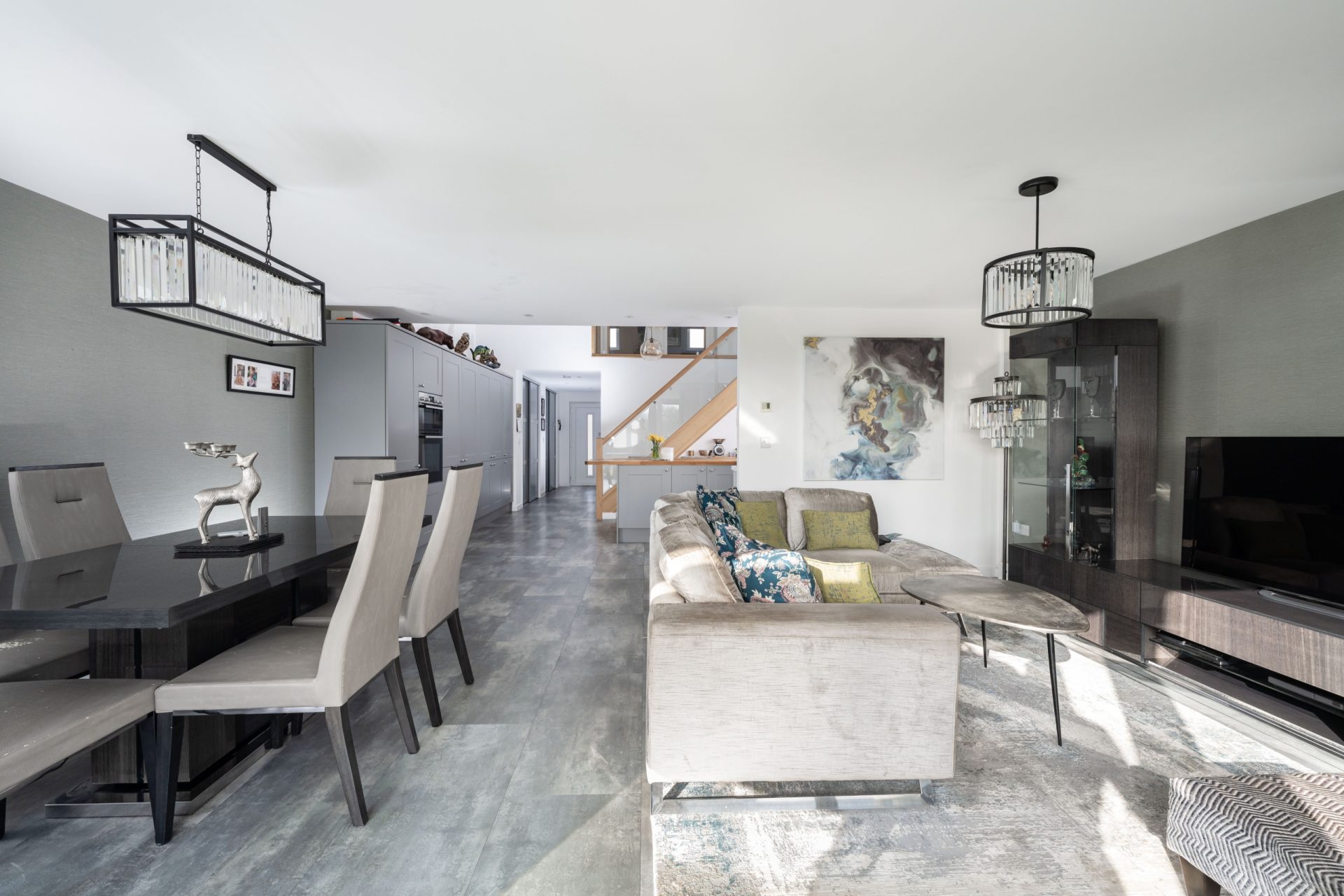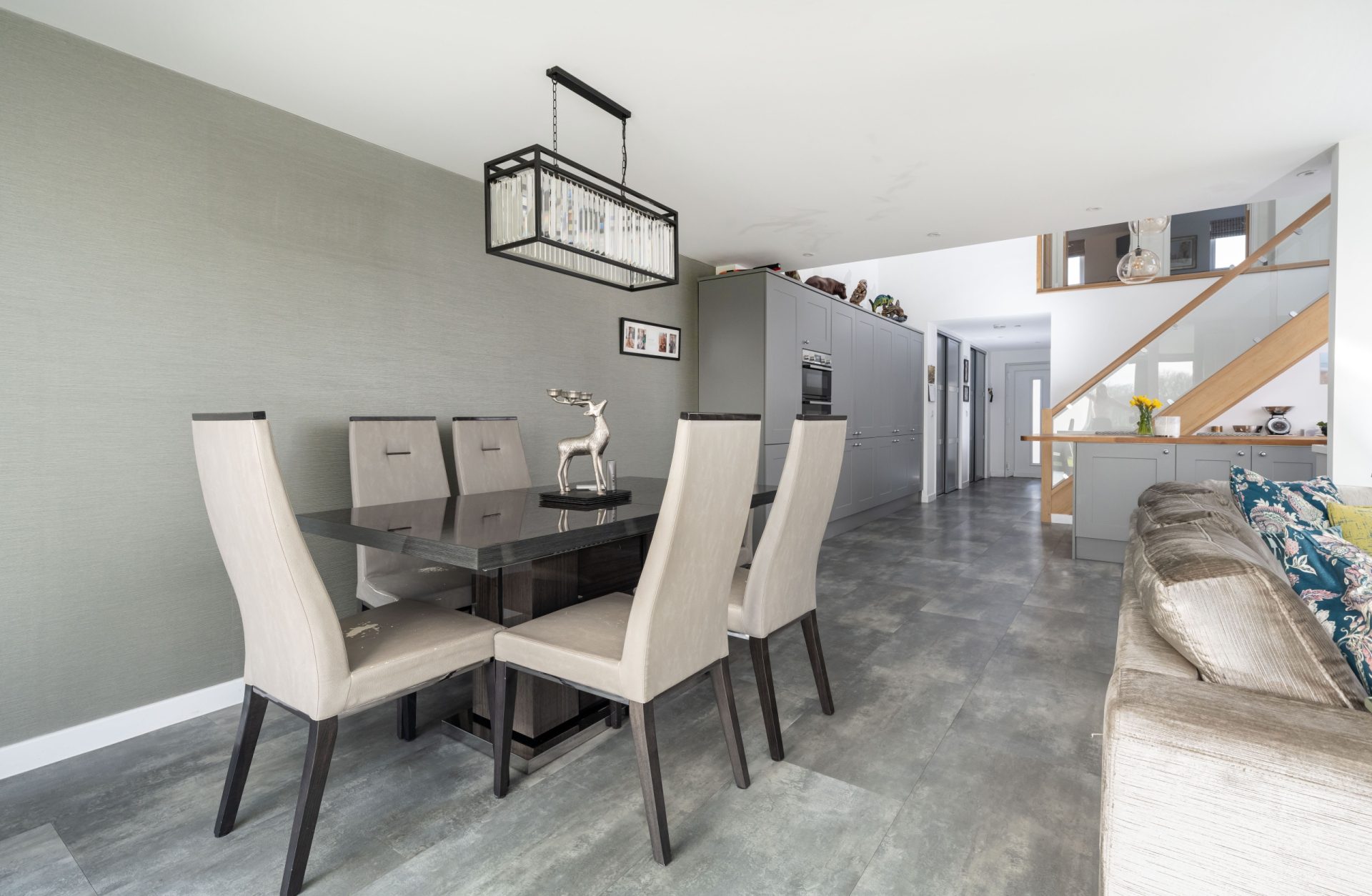 The ground floor centres around an impressive open-plan reception and dining space extending over 19 ft in width. Large-format tiled flooring runs seamlessly throughout and benefits from underfloor heating, enhancing both comfort and the clean architectural aesthetic.