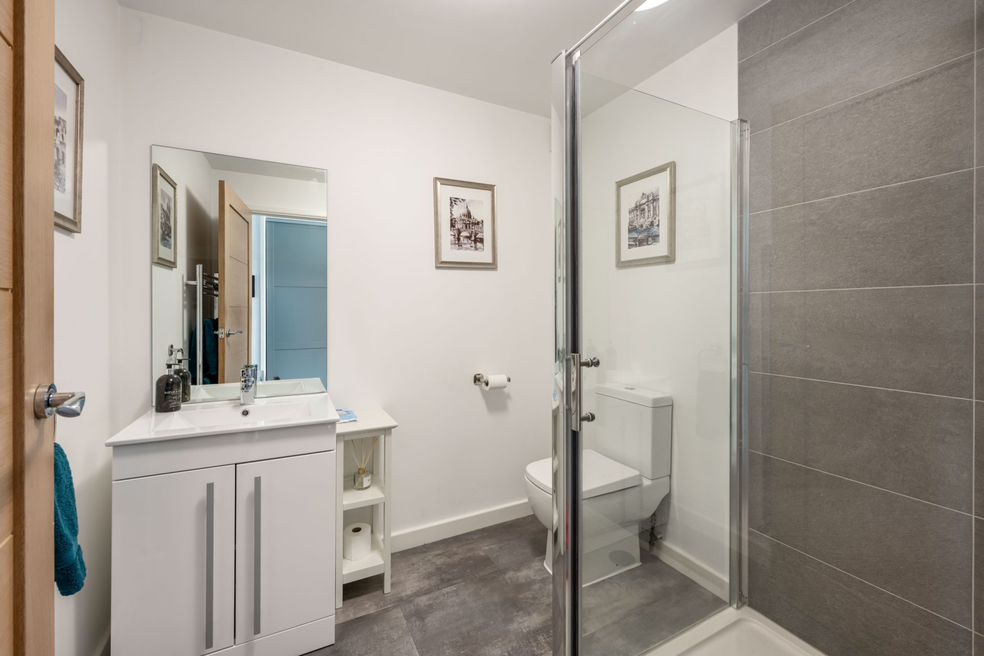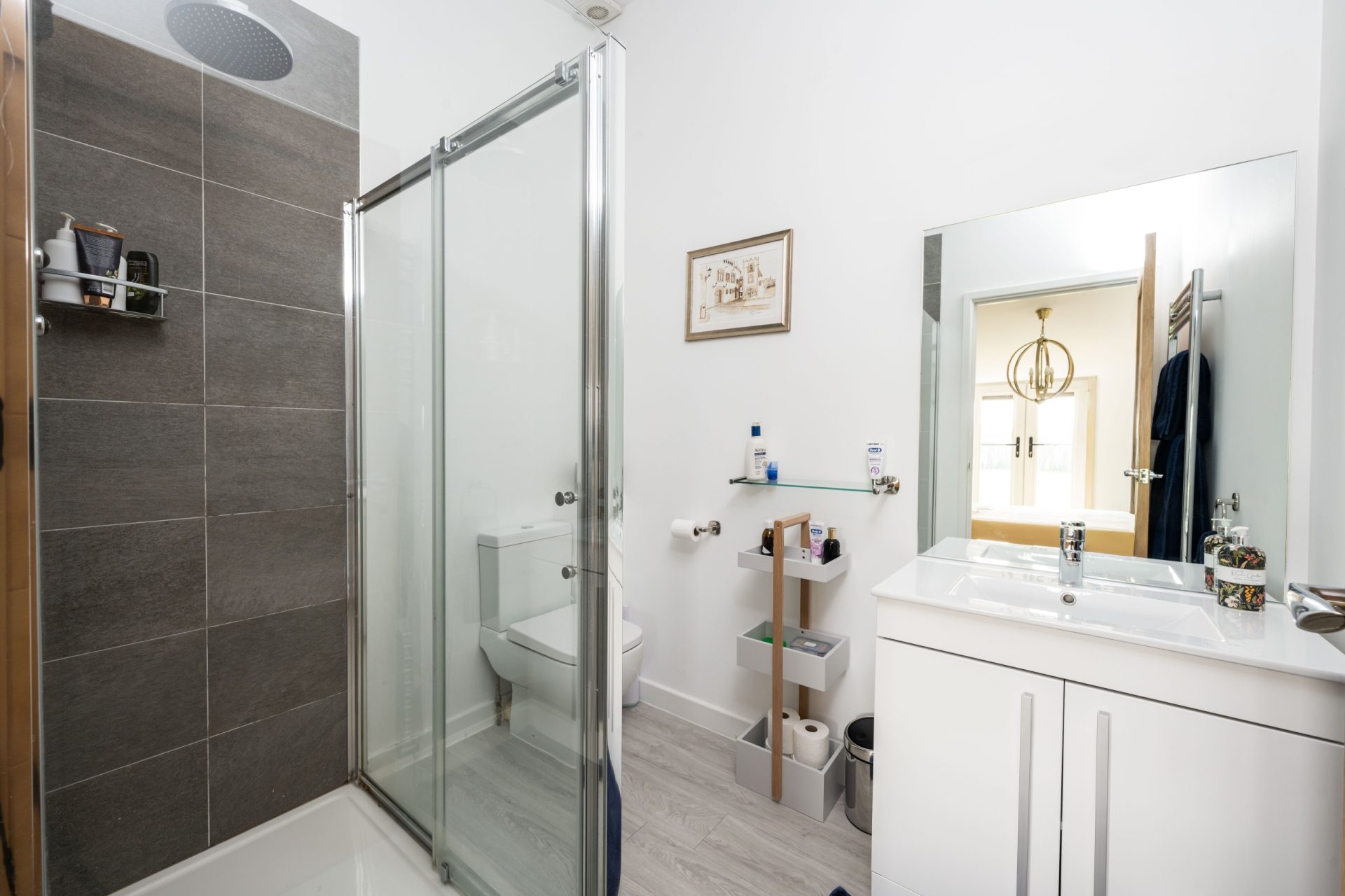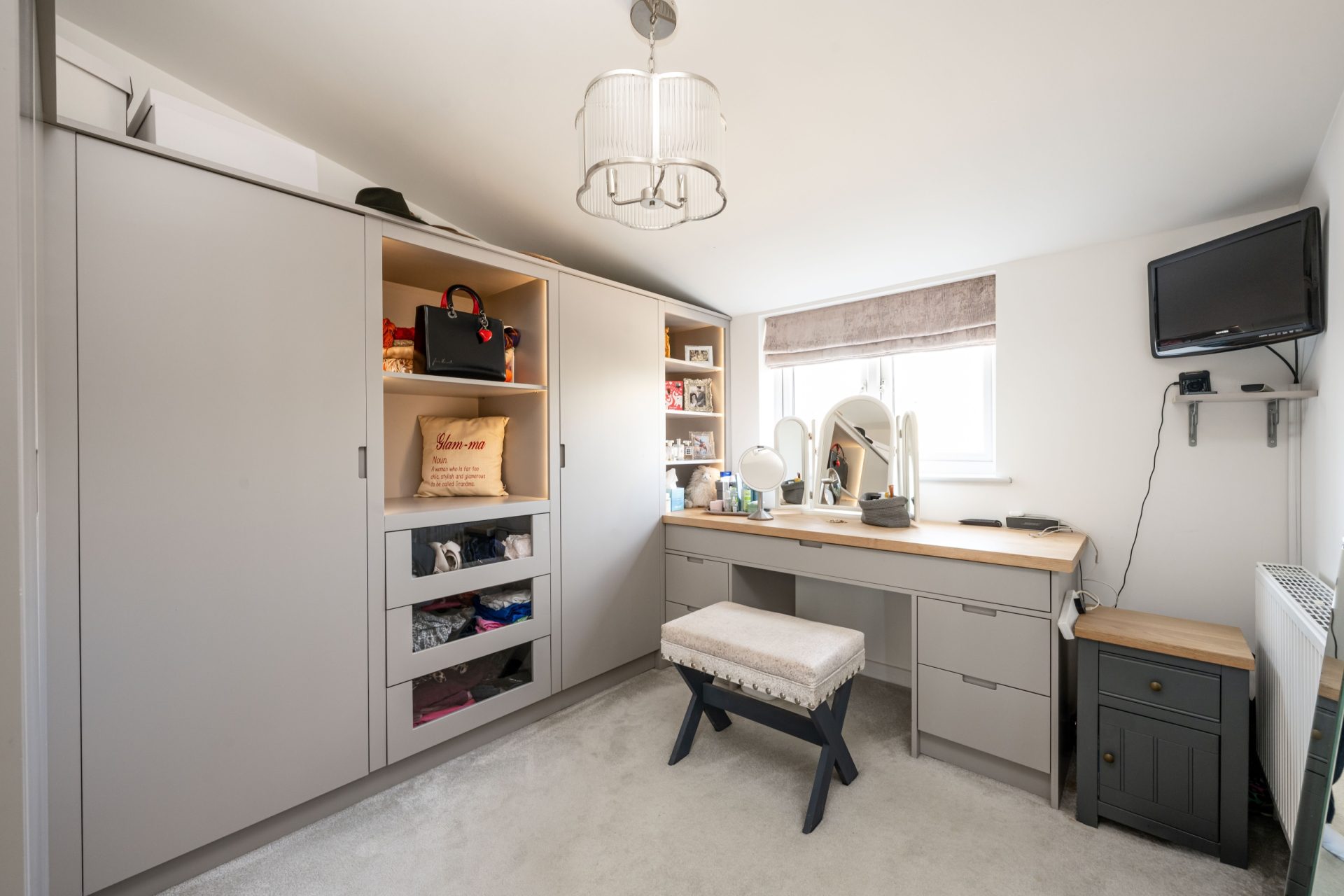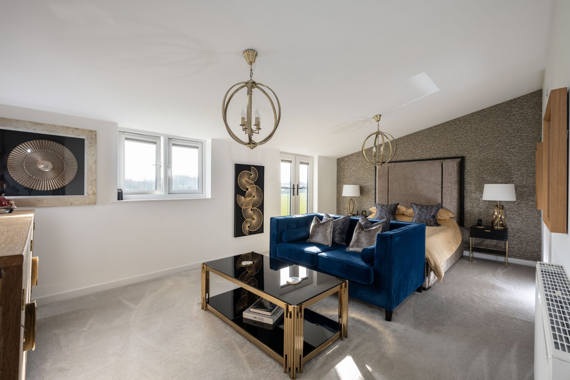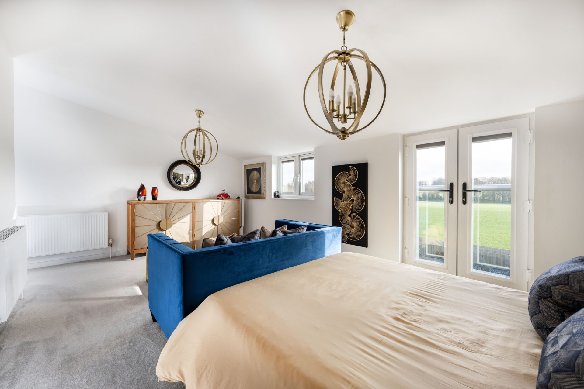 The principal bedroom suite is positioned to the rear and enjoys elevated countryside views via French doors with a Juliet balcony. Generous in scale, the room is complemented by a dedicated dressing room with fitted cabinetry and a contemporary en suite shower room.