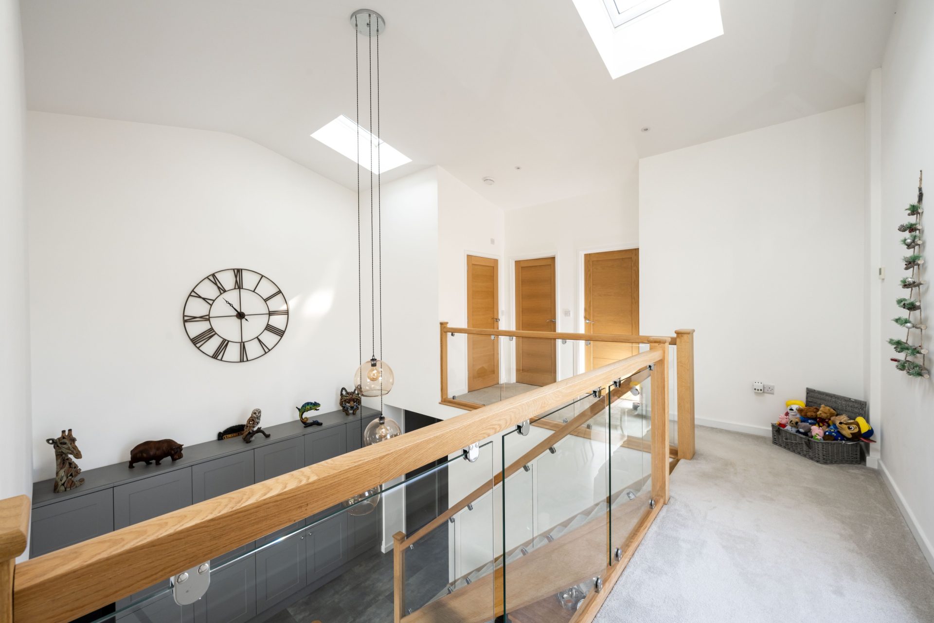 The staircase rises to a bright gallery landing with oak handrails and glass balustrade, overlooking the kitchen below and reinforcing the home’s sense of vertical volume and openness. Roof lights above draw additional natural light into the centre of the property.