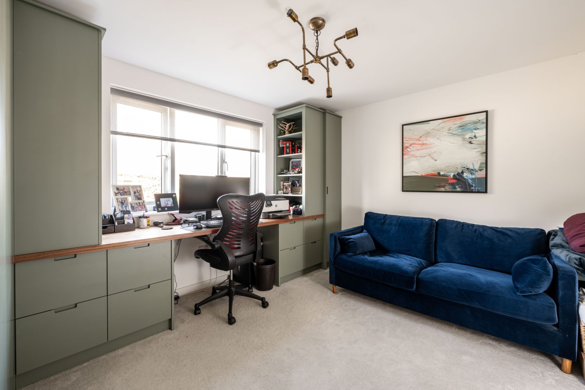 To the front of the property, a separate study provides valuable flexibility. Currently fitted with a range of bespoke cabinetry and workspace, this room could equally function as a fourth bedroom. Positioned adjacent to a ground floor shower room, it offers ideal accommodation for guests or multi-generational living.