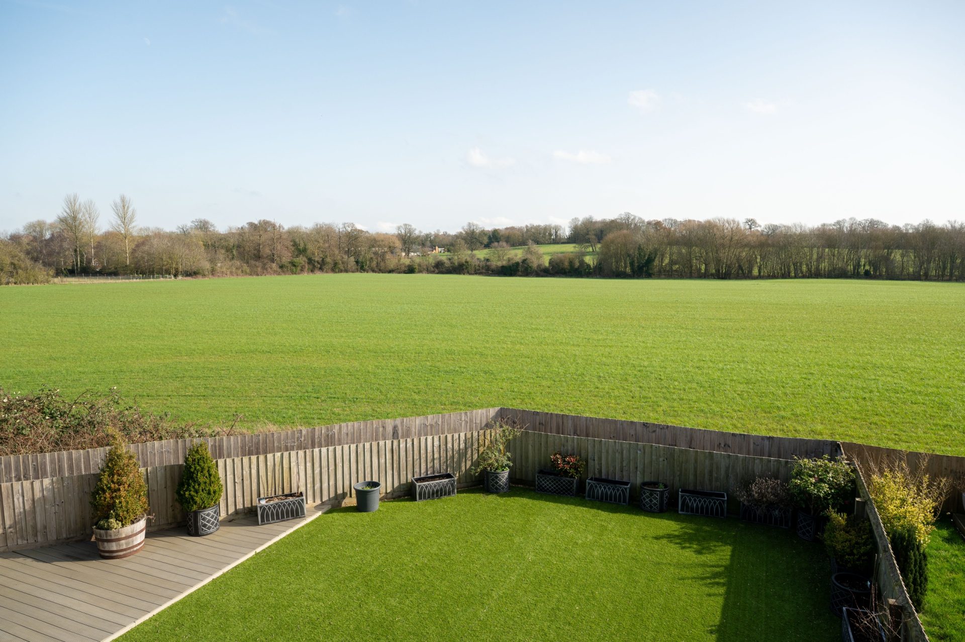 To the rear, a full-width paved terrace spans the property and is directly accessed from the main reception space. Beyond lies a level lawn enclosed by timber fencing with planted borders and raised beds. The uninterrupted countryside backdrop is a defining feature, offering far-reaching rural views and a strong sense of openness rarely found within village settings.