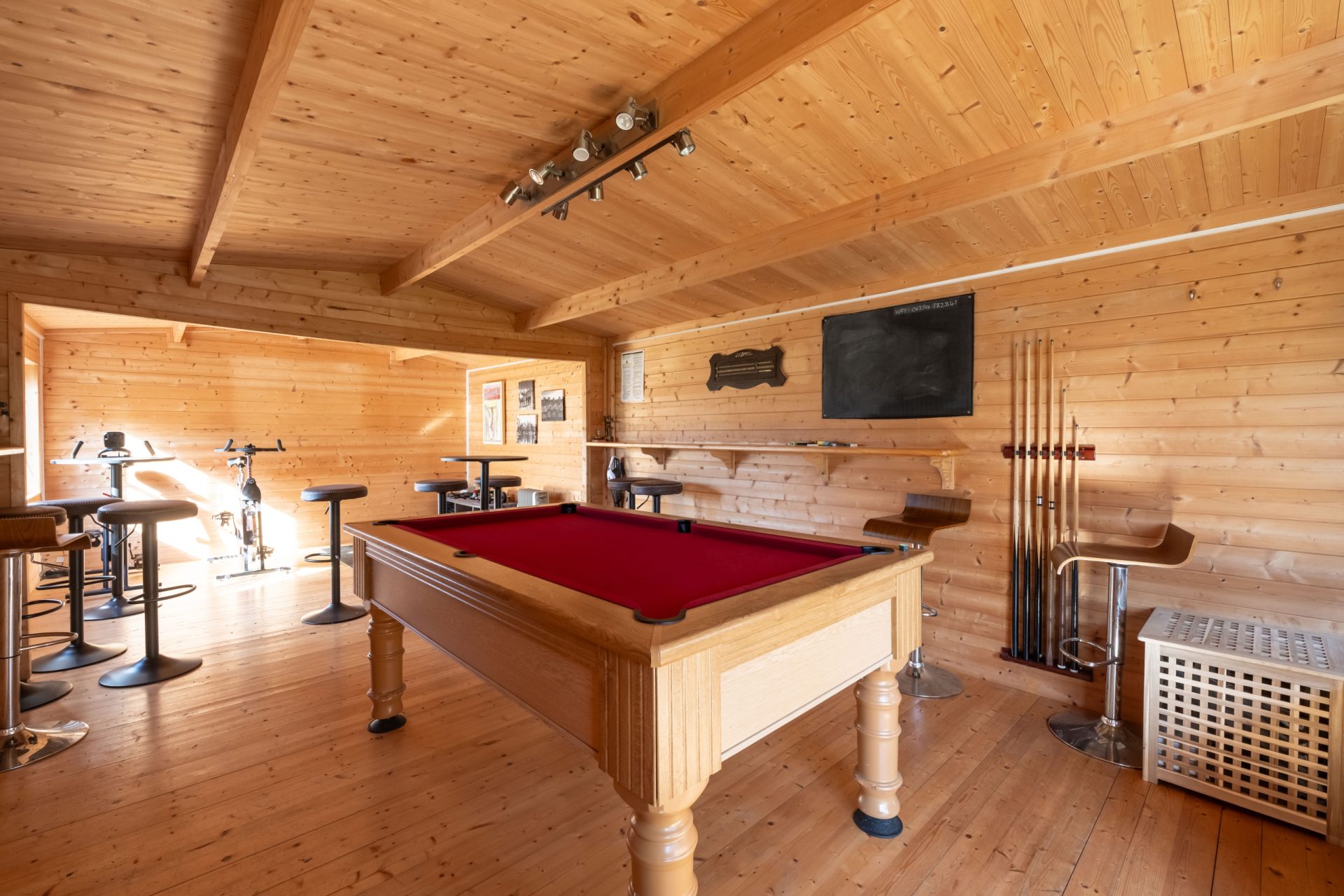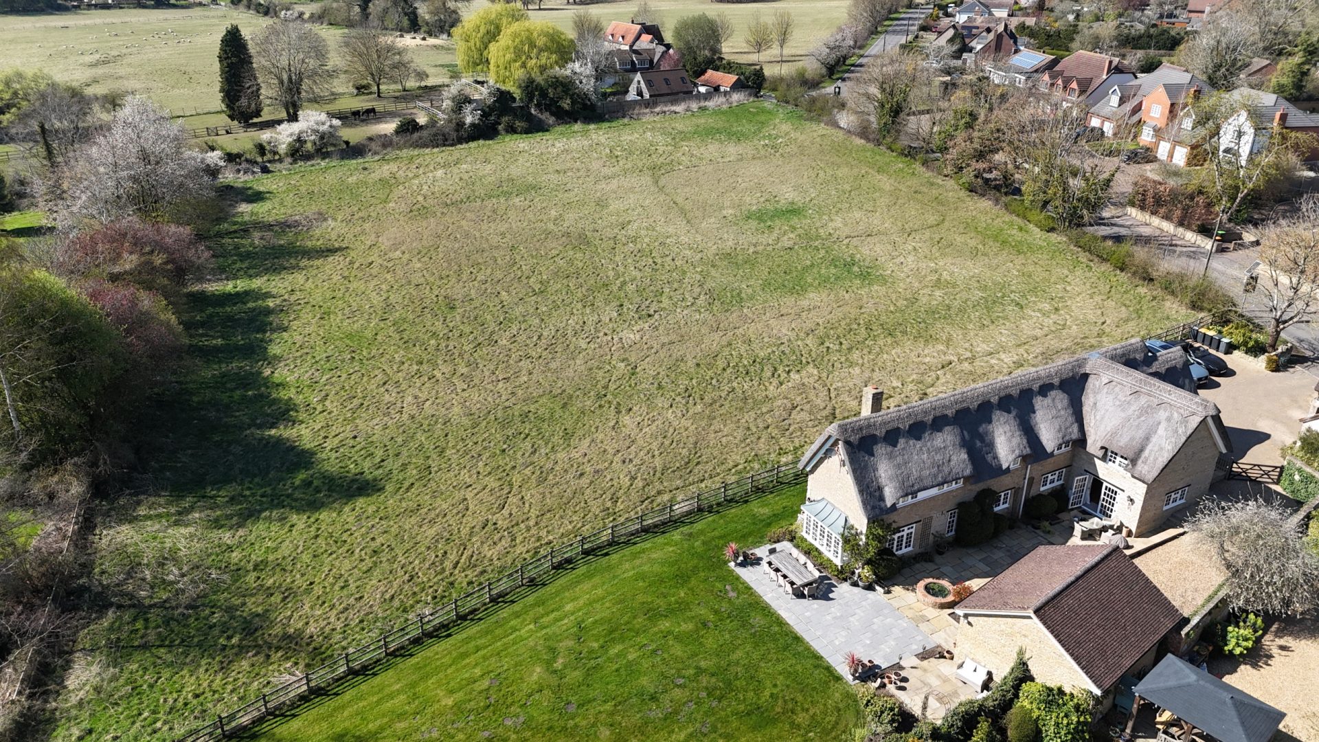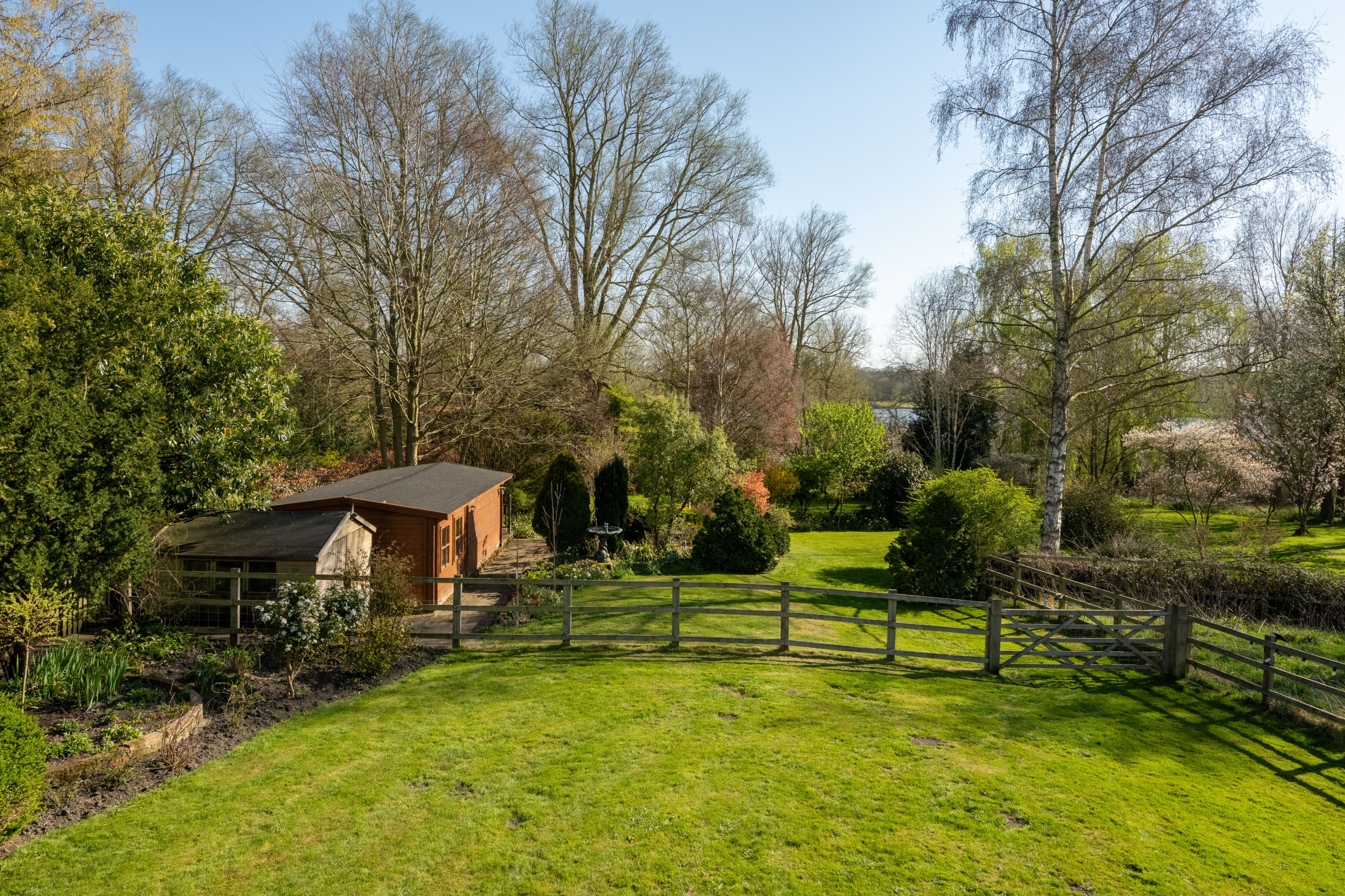 The main garden is laid mostly to lawn with mature shrubs and established borders. A five-bar gate and fence run along the boundary, opening into a larger lawned area at the lower part of the plot. This section includes a substantial storage shed and an outbuilding currently used as a games room, which could easily be converted into a gym or studio.
