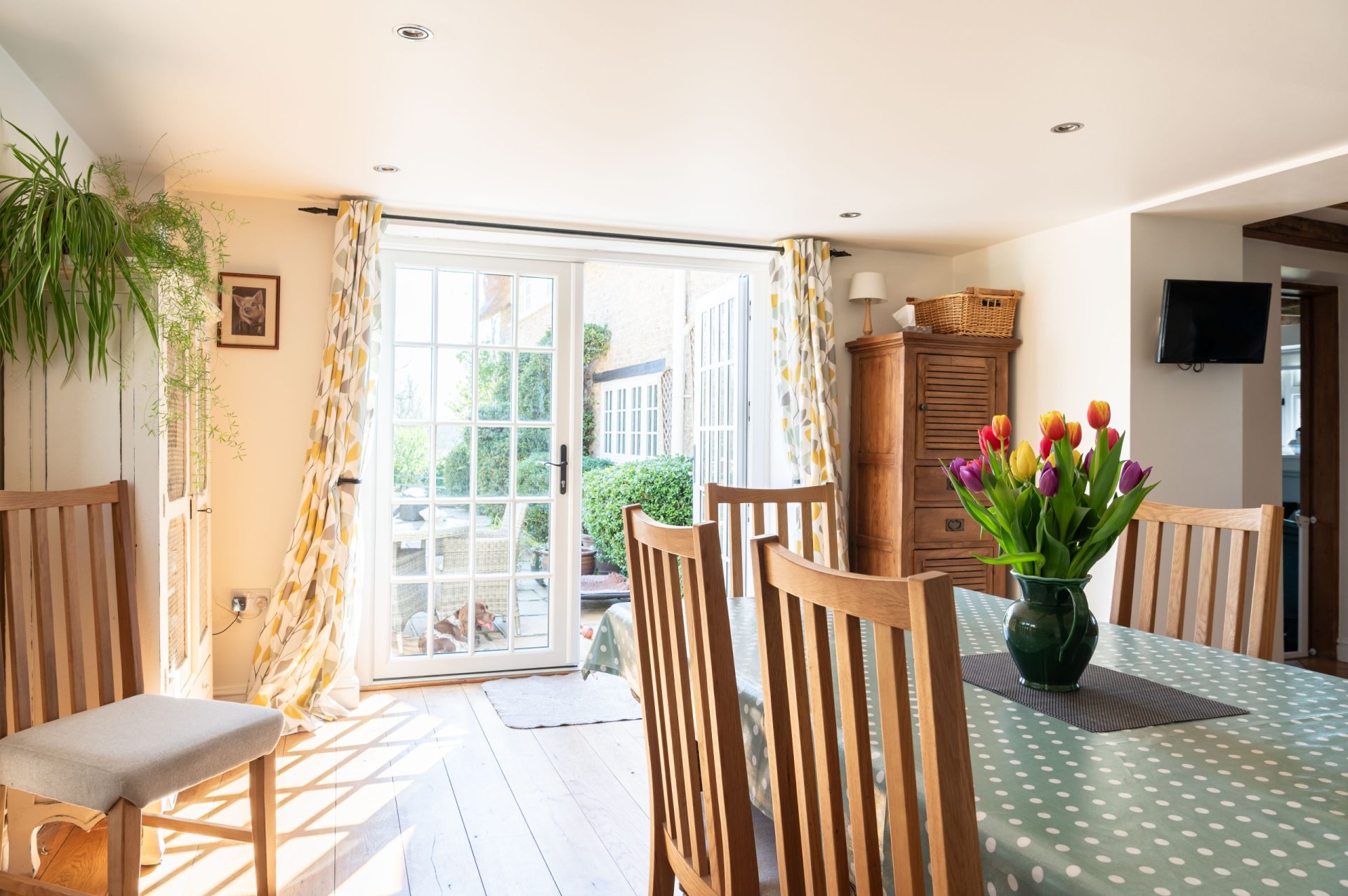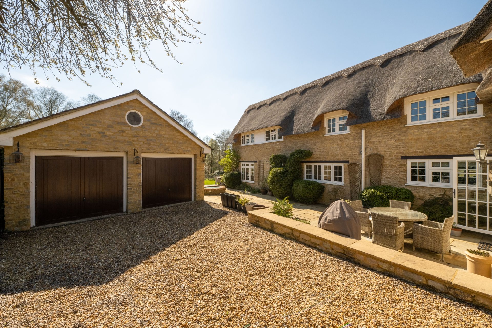 The property is accessed via a private driveway shared with one neighbouring property, offering parking for four vehicles at the front and an additional private gated driveway leading to the detached double garage with further space for two cars. A French door from the dining room opens onto a charming patio area featuring a covered well. Steps lead to a further terrace with wonderful views over the formal gardens and open countryside beyond.