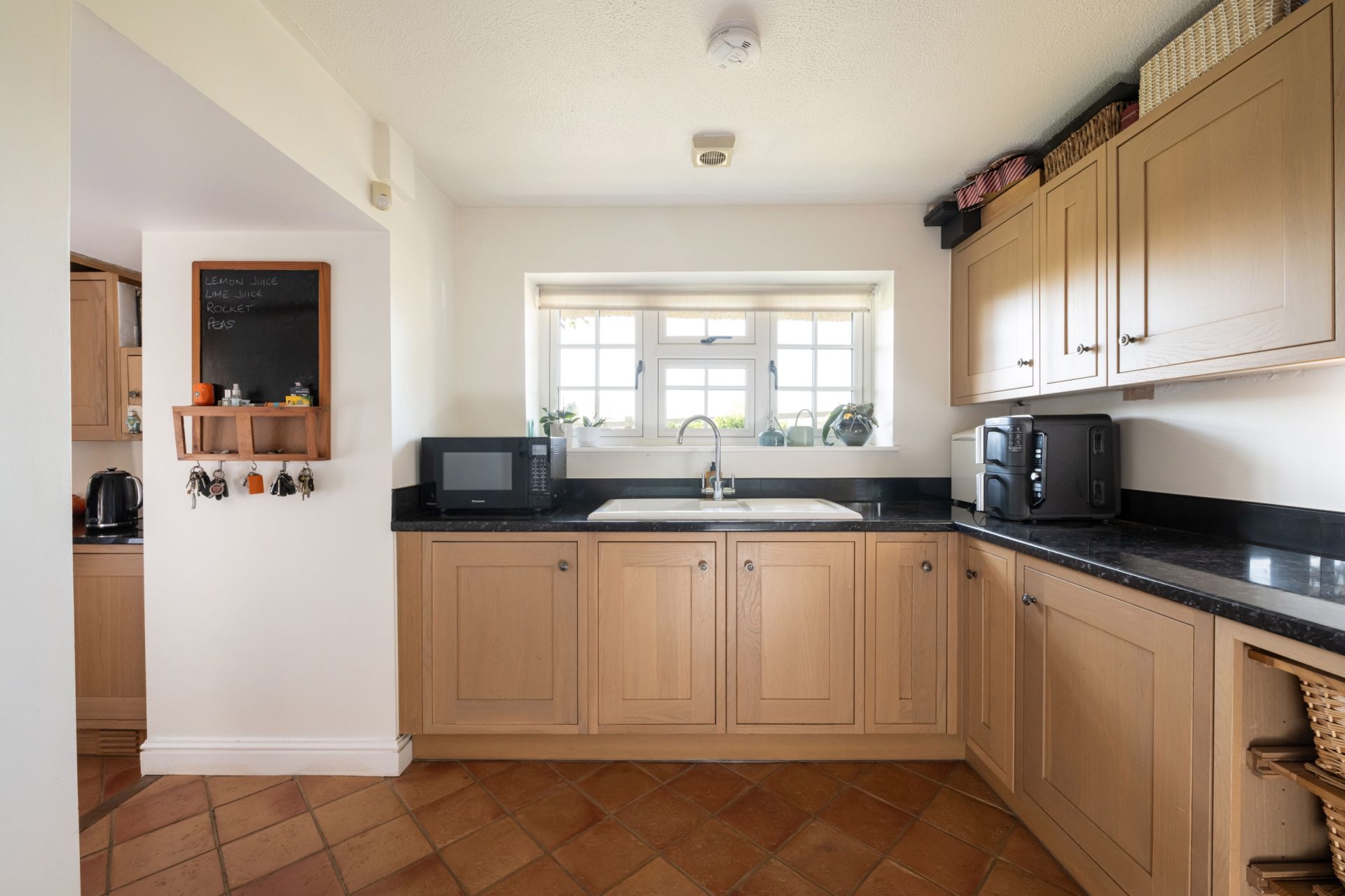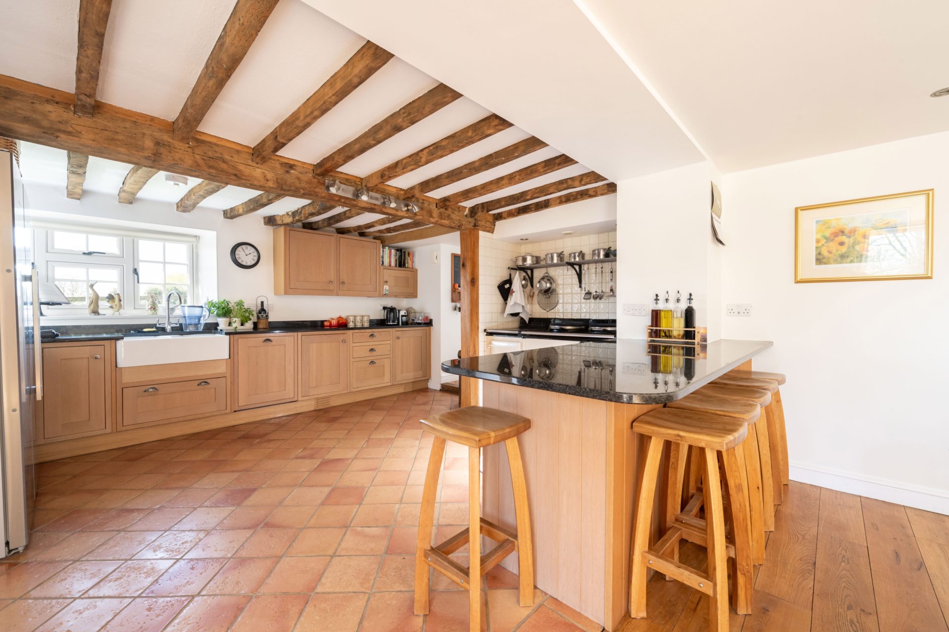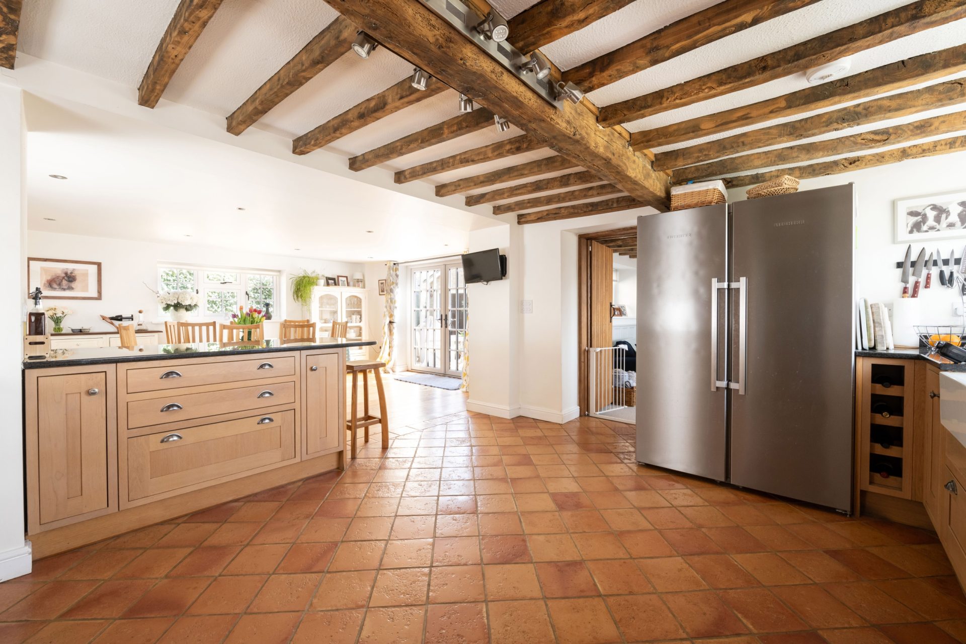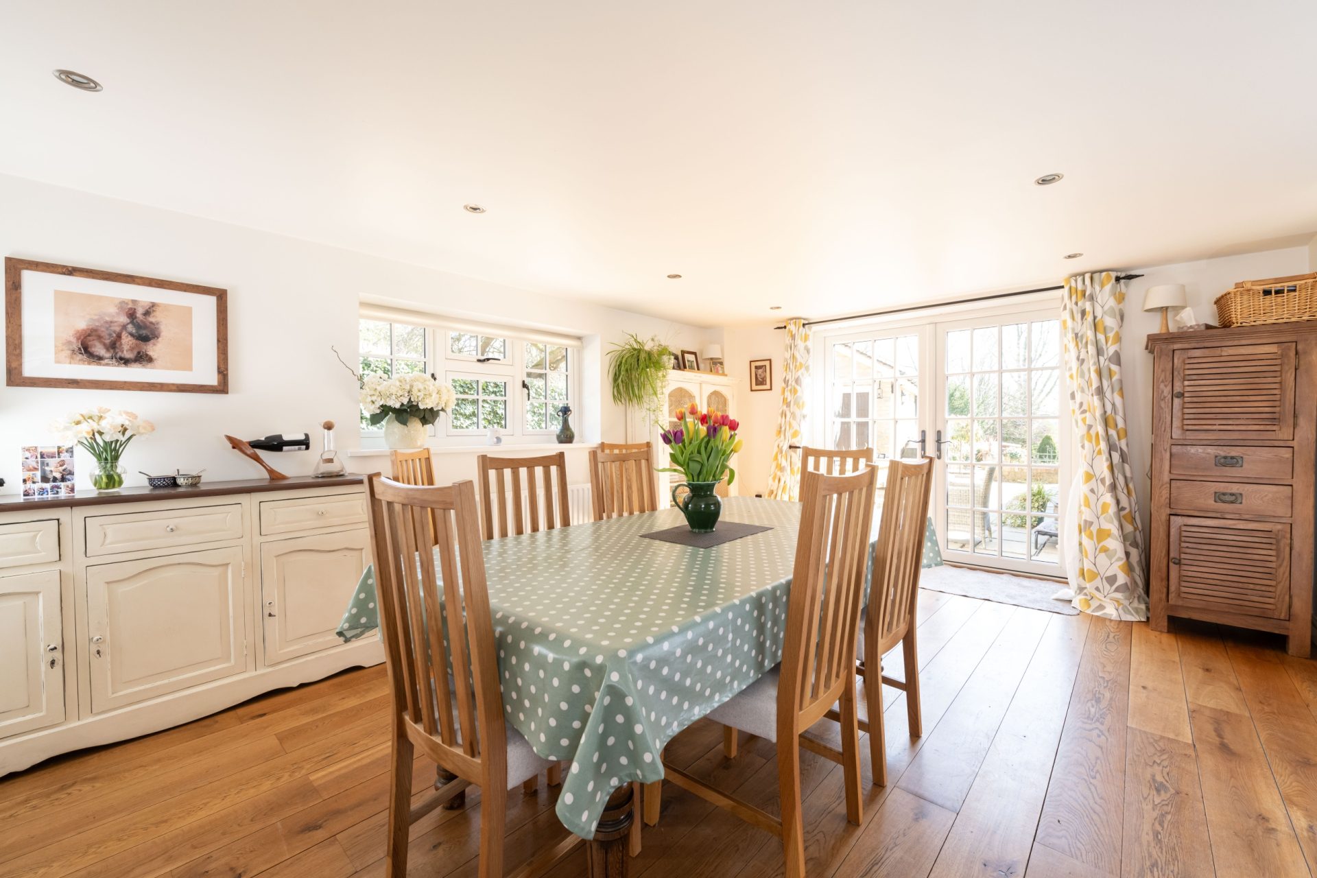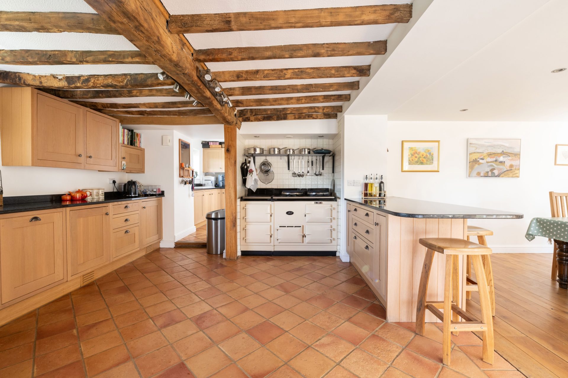 The formal front entrance sits centrally within the house and opens to a series of well-appointed reception rooms. The heart of the home is the spacious open-plan kitchen and dining area. The kitchen features a generous range of shaker-style wall and base units with dark granite work surfaces and a four-door Aga in a classic cream finish. A peninsula subtly separates the kitchen from the dining space, which easily accommodates a large dining table and is flooded with natural light thanks to French doors opening to the patio terrace. Finished with oak flooring, this space is ideal for entertaining.