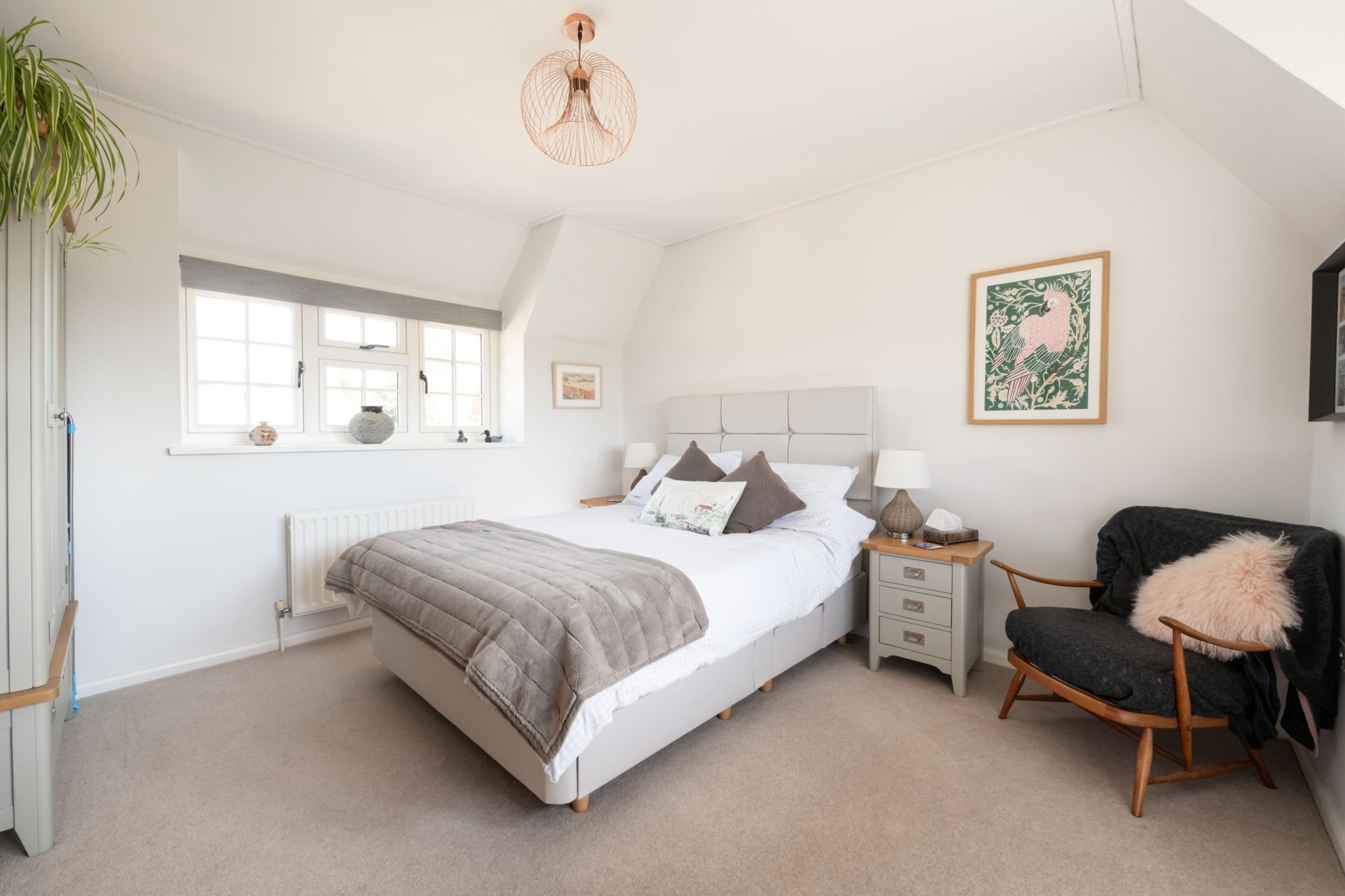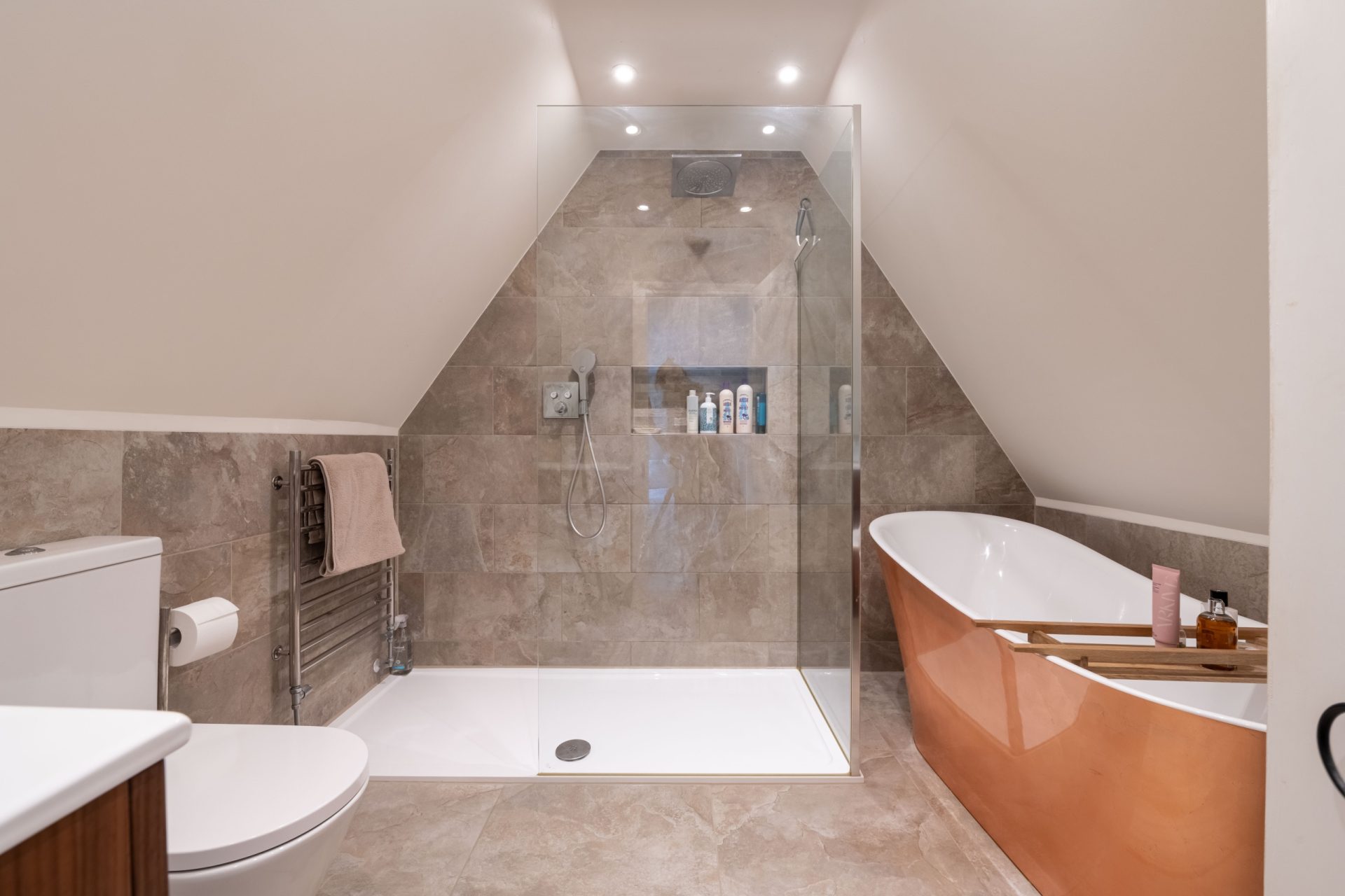 Upstairs, there are five generous bedrooms. The landing is naturally bright thanks to well-placed windows. The principal bedroom is spacious and beautifully presented, with a stylish en suite featuring a freestanding bath, contemporary fittings, and a large walk-in shower.