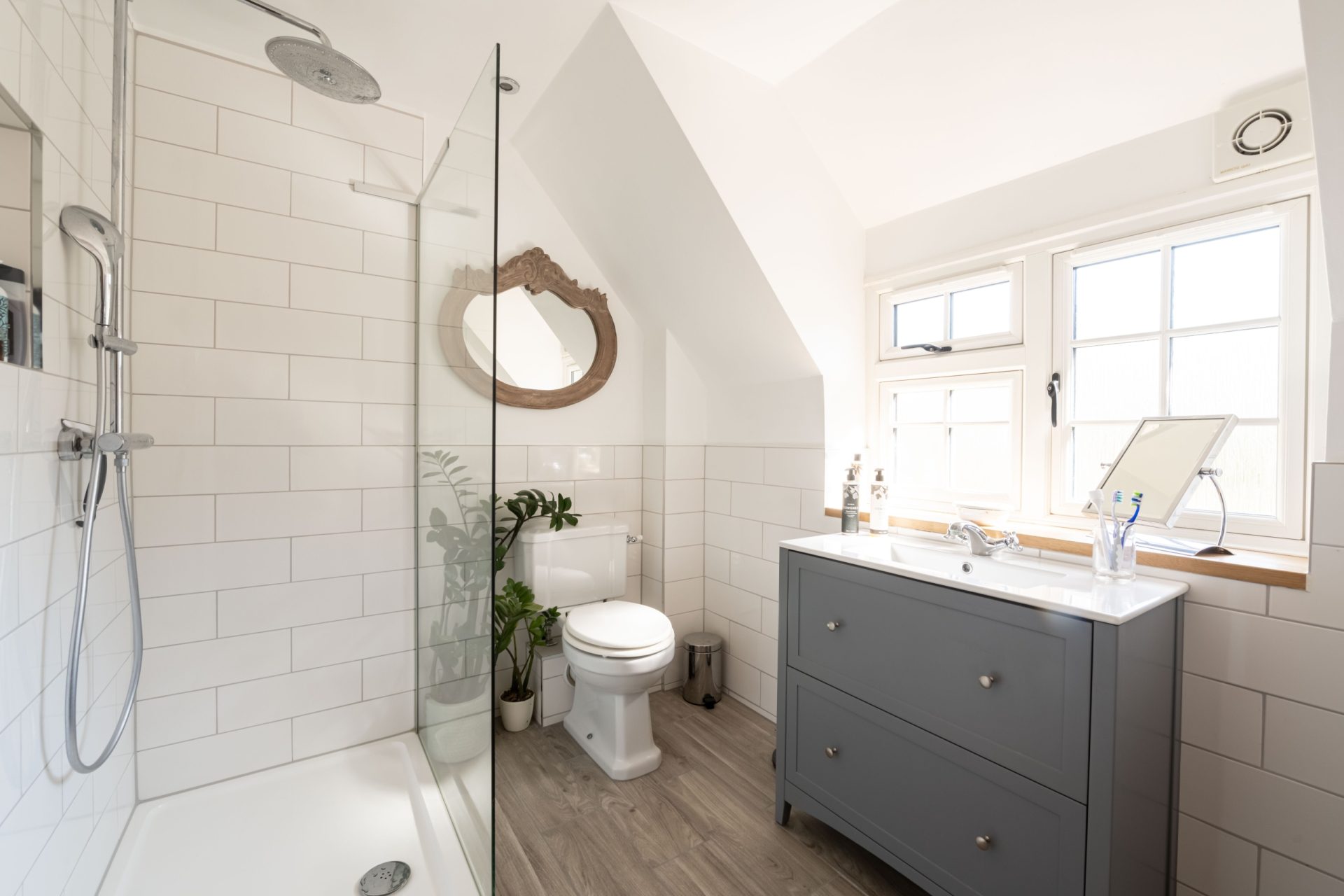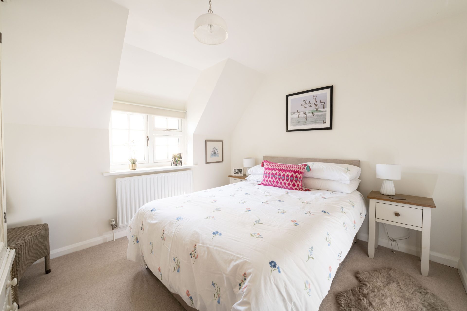 Bedroom Two is located at the opposite end of the home and overlooks the side terrace. Bedrooms Three, Four, and Five are all well-proportioned doubles. Bedroom Five benefits from an adjacent shower room with modern fittings and a walk-in shower. In contrast, the remaining bedrooms are served by a centrally located family bathroom, styled in keeping with the home’s other bathrooms.