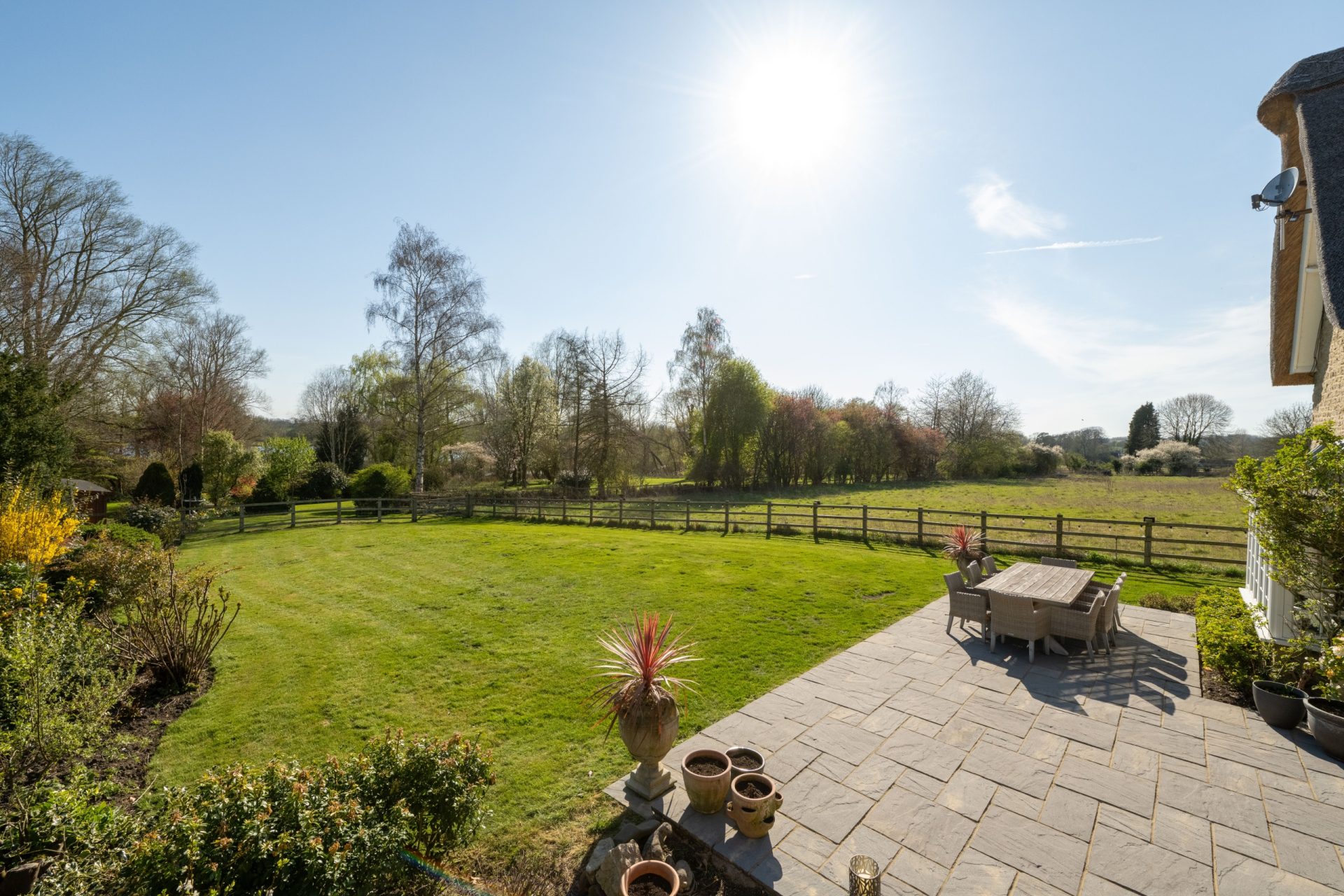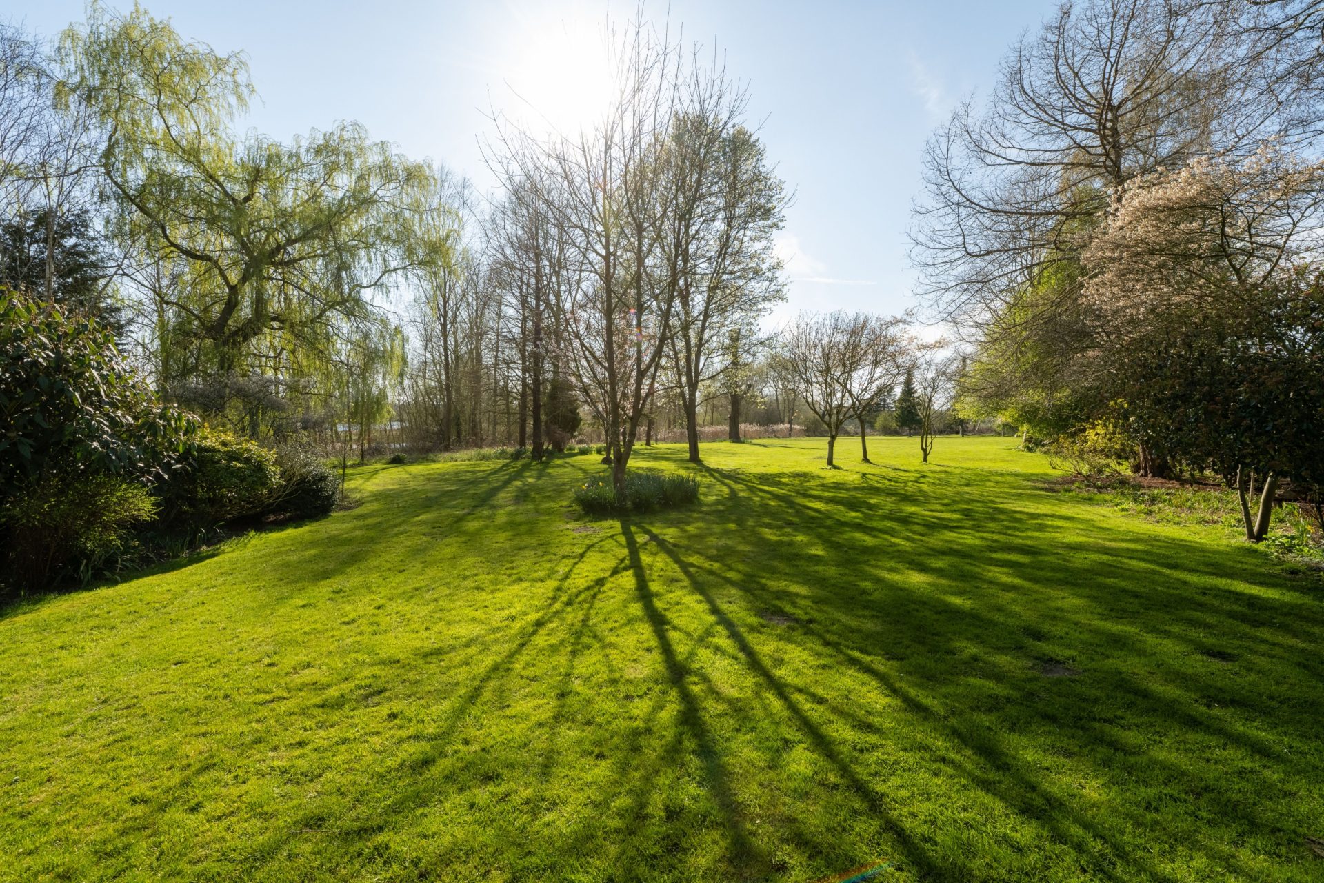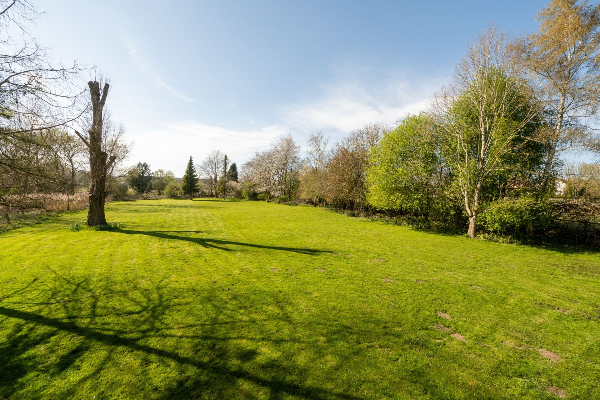 Beyond the formal garden lies a delightful surprise: an expansive meadow-style space extending towards the river and lakes. With large mature trees and naturalistic planting, this area can remain wild for a relaxed, natural setting or be cultivated into an additional formal garden, offering flexibility and privacy in equal measure.