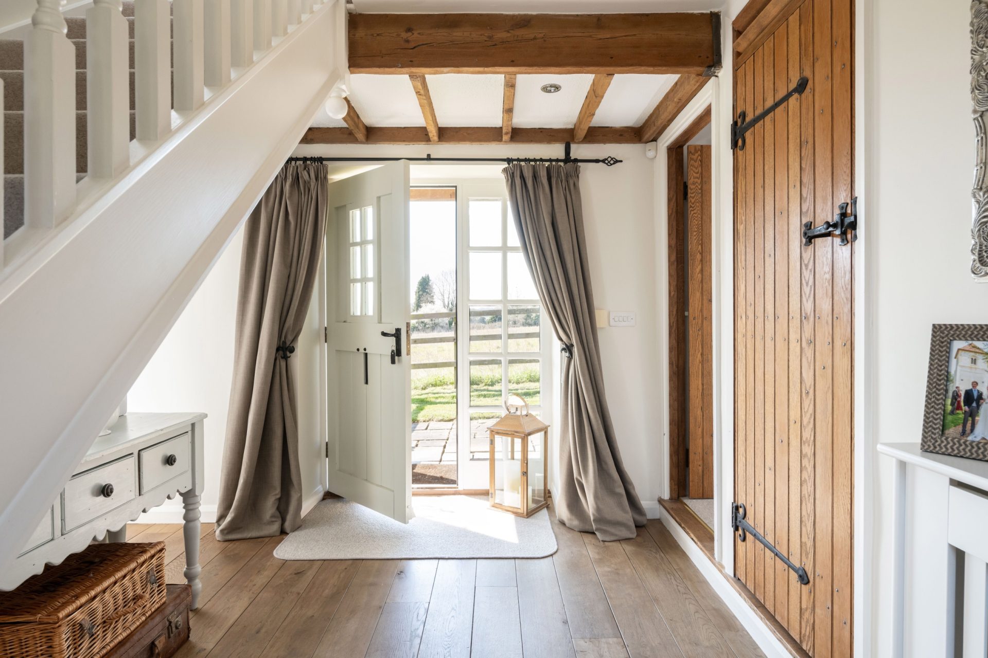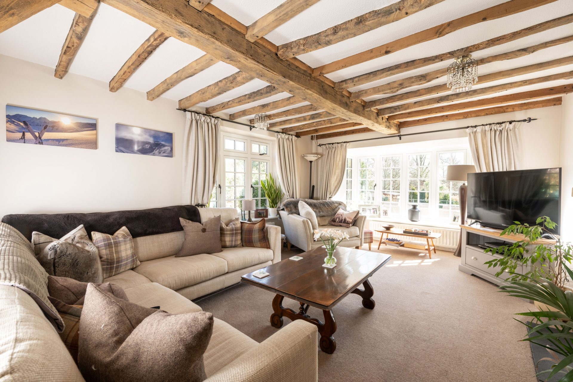 The kitchen leads into a charming snug, complete with exposed oak beams and wall panelling. This room enjoys dual-aspect windows and features a characterful brick fireplace with an electric log burner. From here, a hallway leads to the front door, where the central staircase rises to the first floor and a storage cupboard. Off the hallway is a peaceful study, and at the far end of the home, a stunning sitting room with views across the rear garden. Full of character, this room offers a serene and inviting space to relax.
