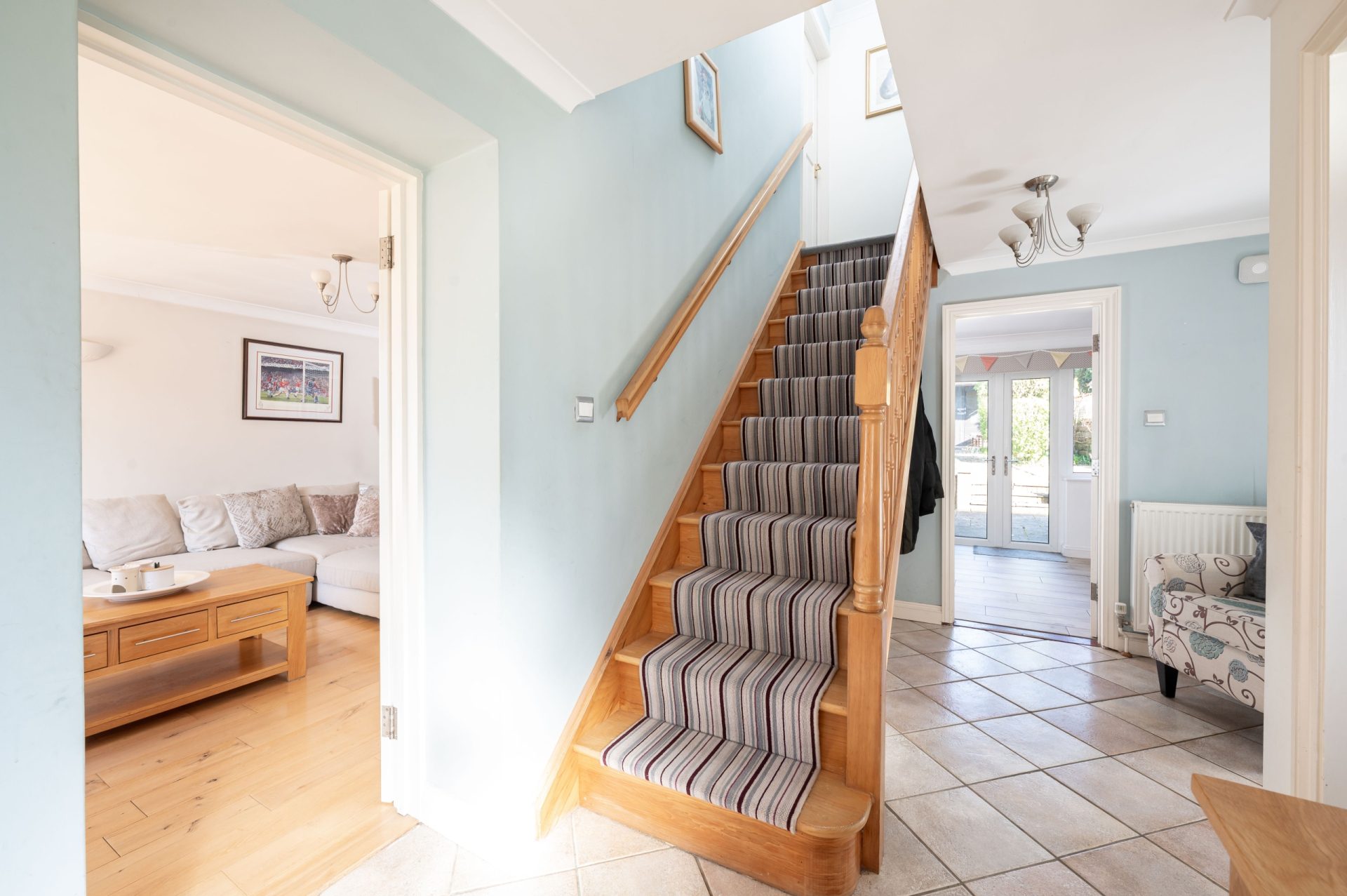 The property is entered via a spacious entrance hall, finished with tiled flooring and centred around a solid timber staircase rising to the first floor. The hall provides access to the principal ground-floor rooms and sets the tone for the space and flow of the house.