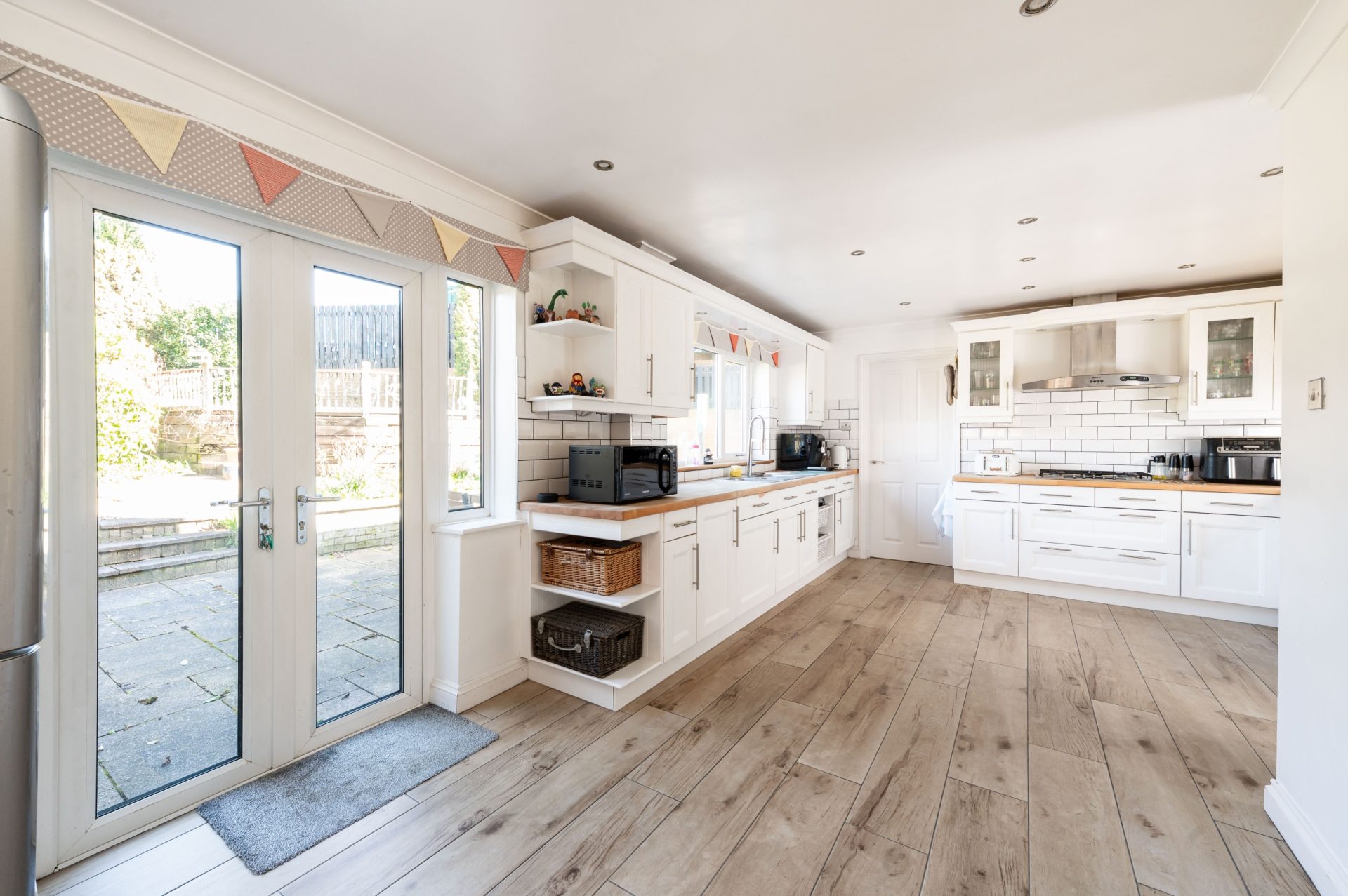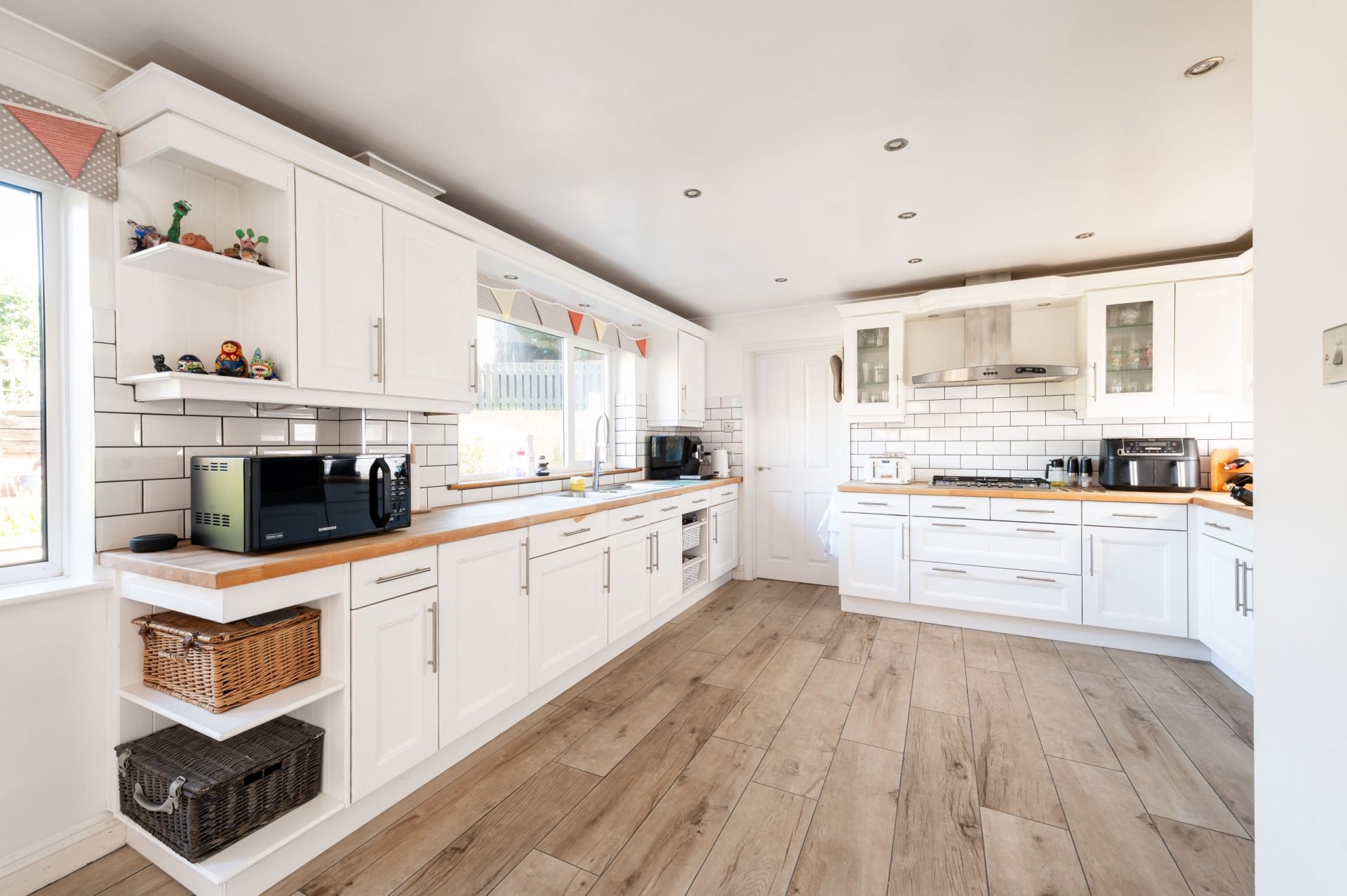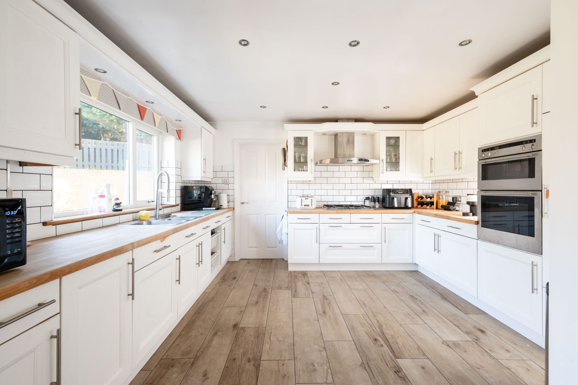 The kitchen is a standout feature of the property, spanning a large footprint with fitted cabinetry and generous worktop space. Finished in a classic shaker style with integrated appliances, the layout provides both functionality and visual appeal. A large window runs along one side, bringing in natural light and overlooking the garden, while recessed ceiling lighting enhances the sense of space. There is also direct access to the side of the property, adding further practicality.