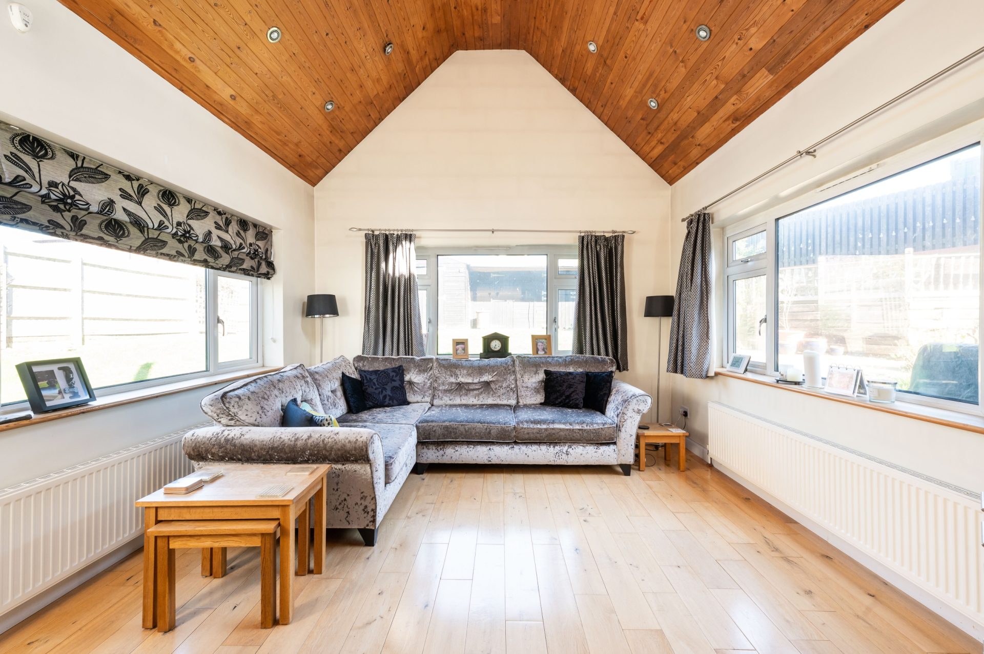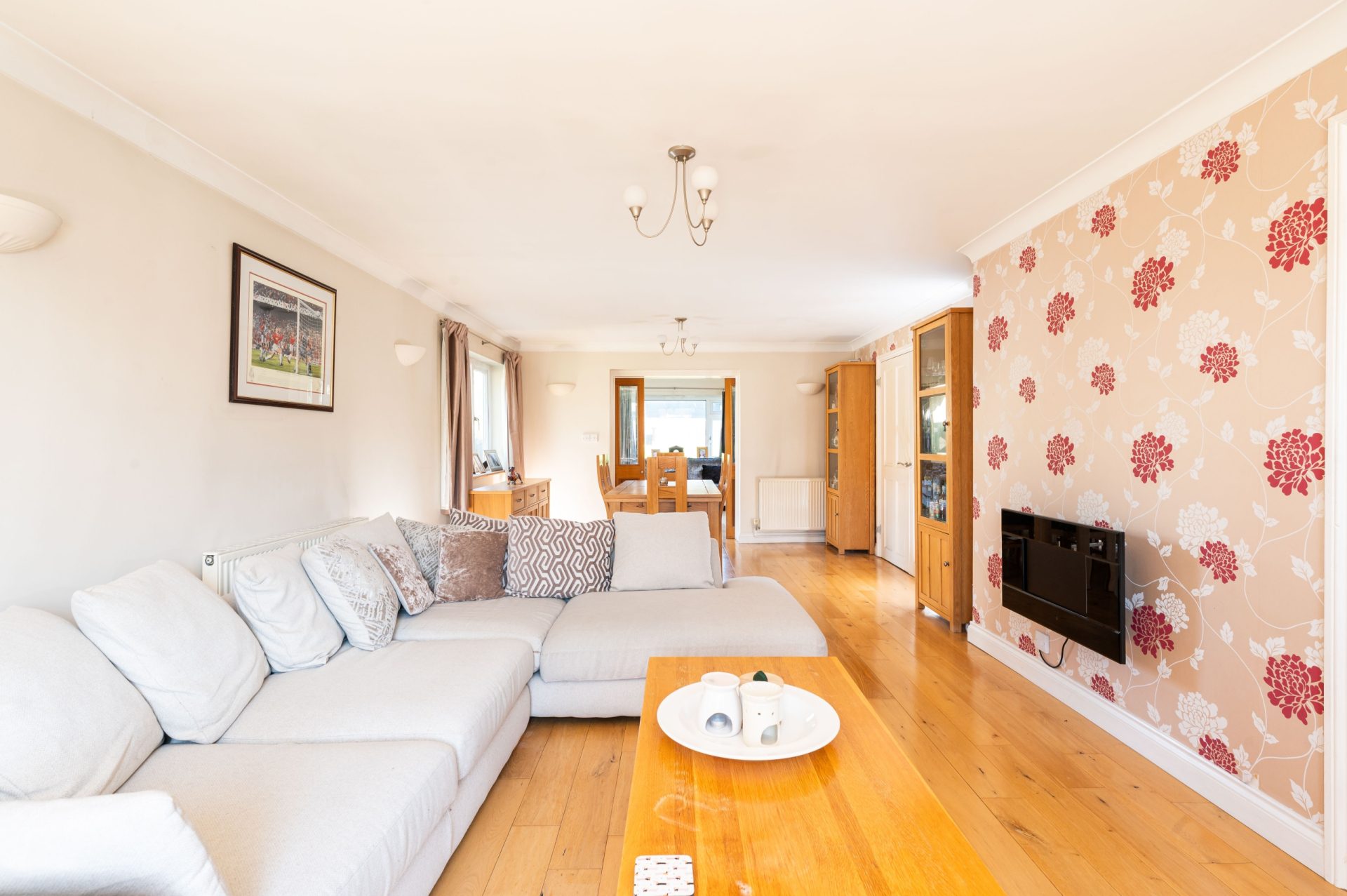 To the front, the main living room is a well-proportioned space, featuring a large window allowing for excellent natural light. The room is centred around a contemporary wall-mounted fireplace and comfortably accommodates a range of seating, making it ideal for everyday use.