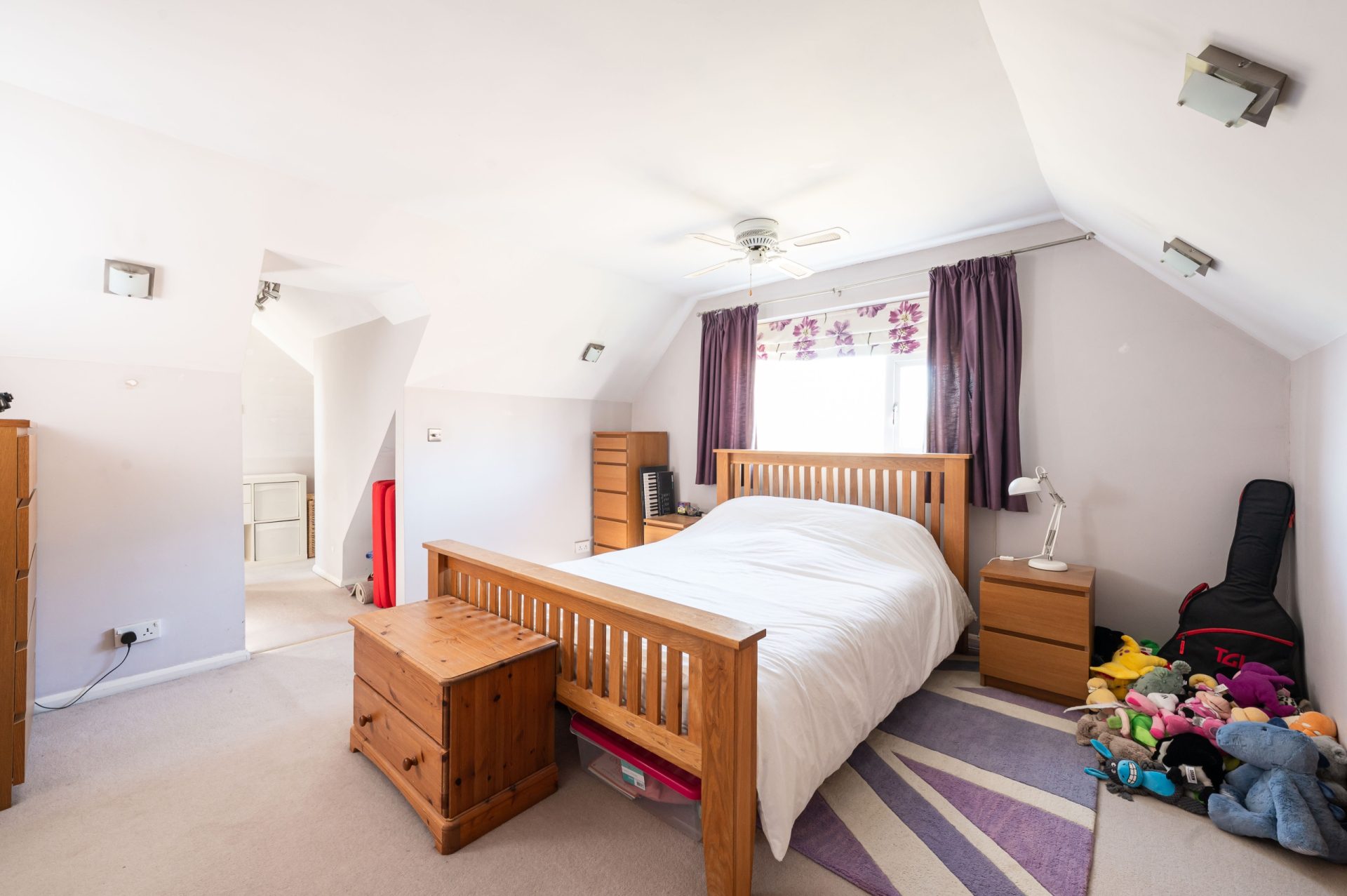 The principal bedroom is a spacious double room. This large loft-style bedroom, characterised by its vaulted ceiling and generous floor space, is further enhanced by a large dressing area that supports an already excellent room.
