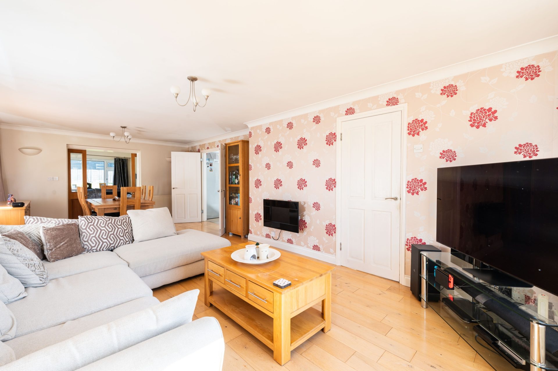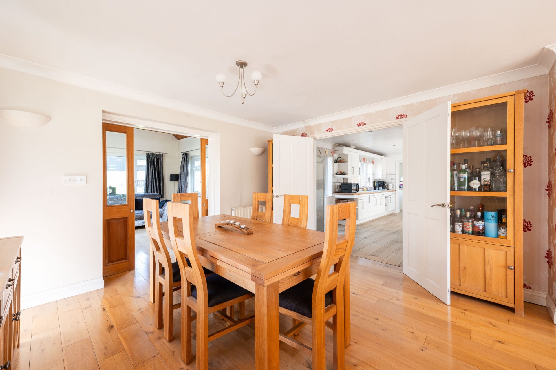 The dining area is generous in scale, with ample space for a large table and chairs. This room also links directly back into the kitchen, reinforcing the practical flow of the ground floor.