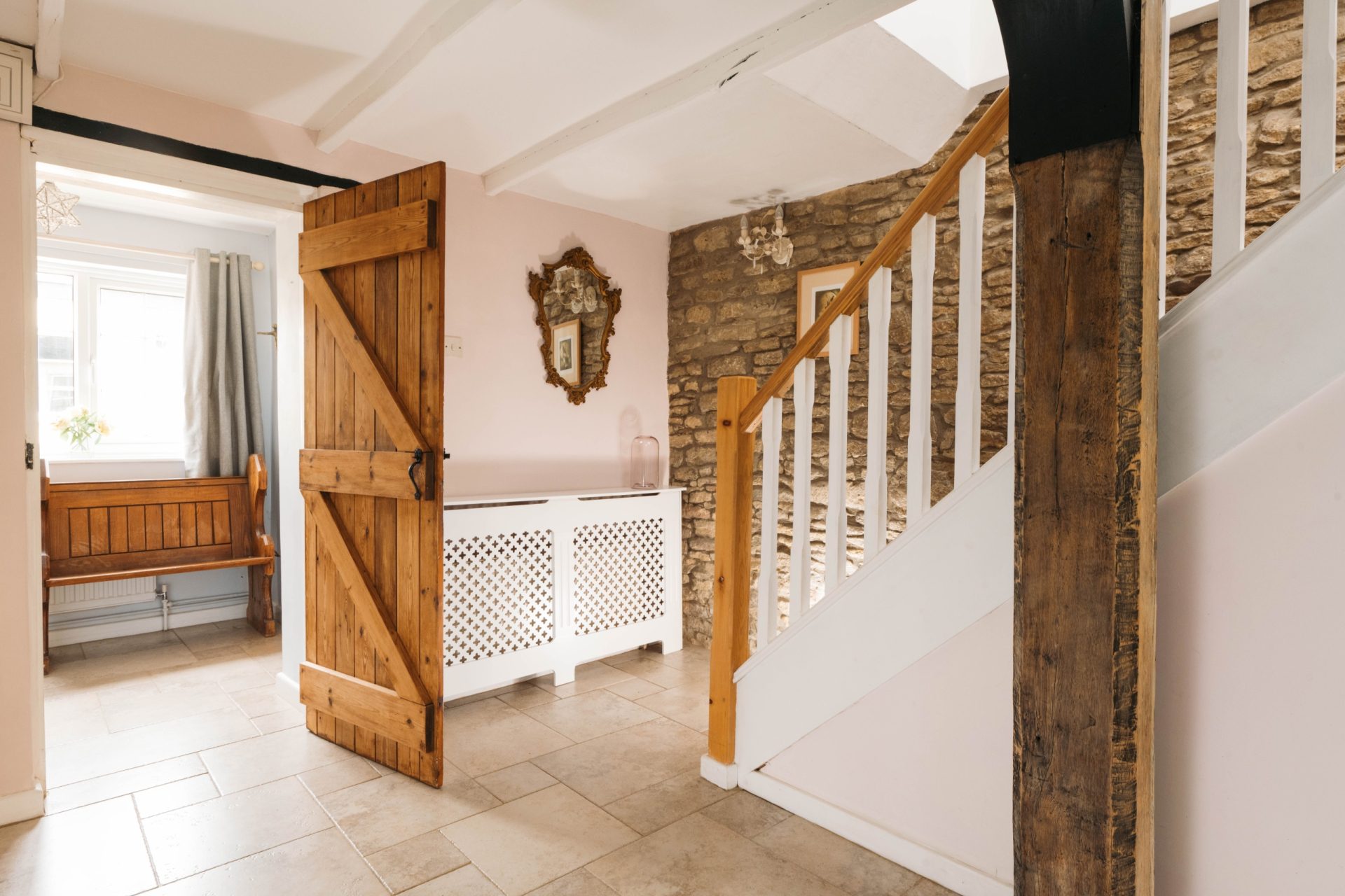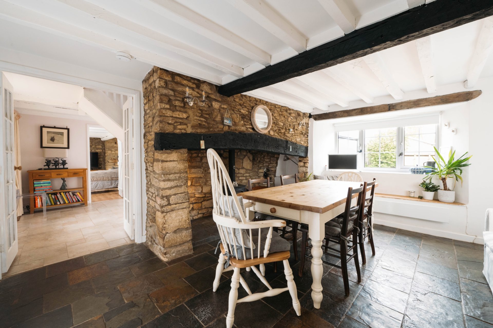 The garden room has had a replacement tiled roof to ensure it is usable all year round. It also has patio doors that lead to the raised deck. The original downstairs rooms have exposed beams, and there is exposed feature stonework throughout the property.