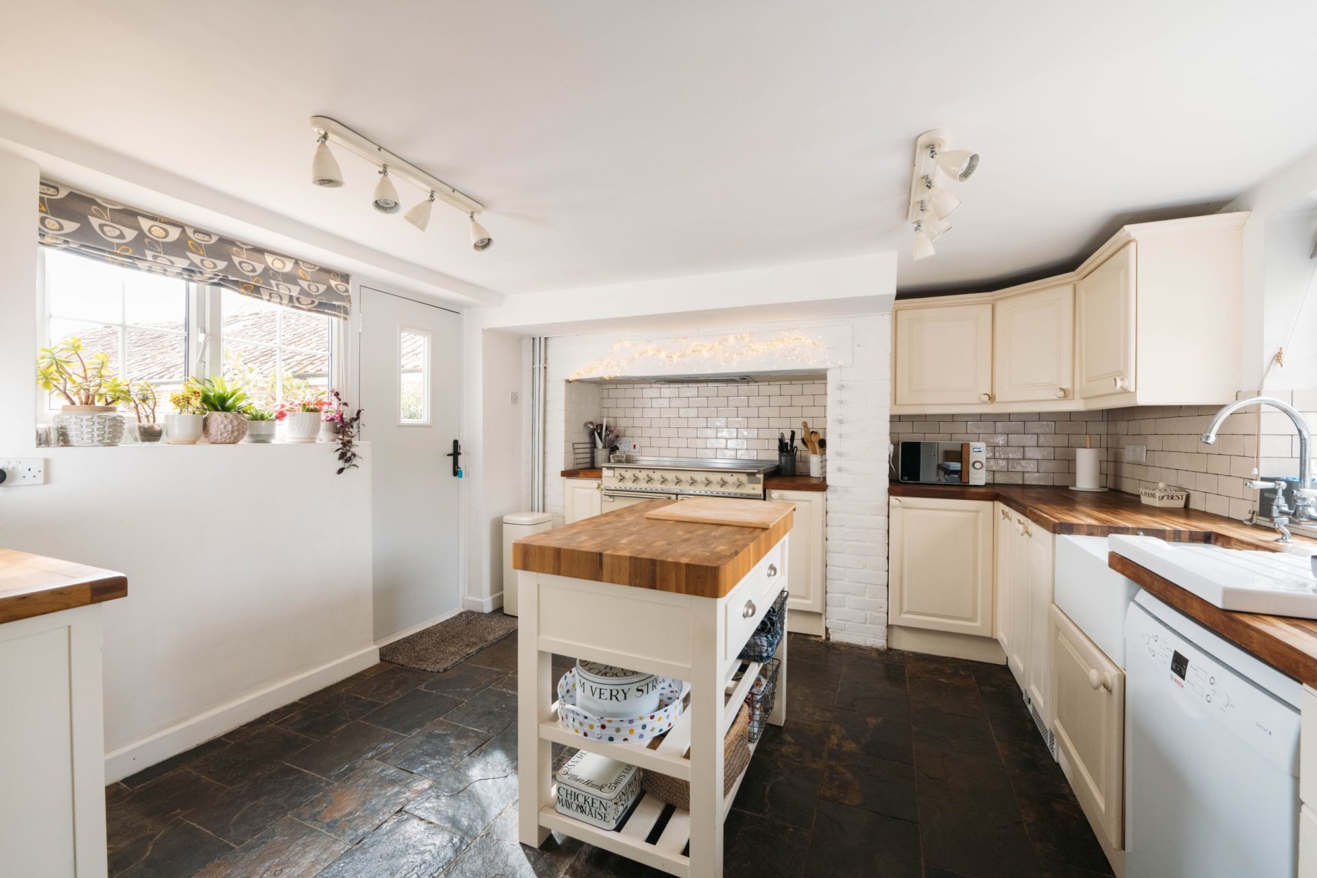 Moving further into the property, the hallway leads to an open-plan kitchen dining room. The kitchen has an excellent range of floor-mounted farmhouse-style units with oak work surfaces, an electric range master cooker with an induction hob, and a butler sink overlooking the front of the property.