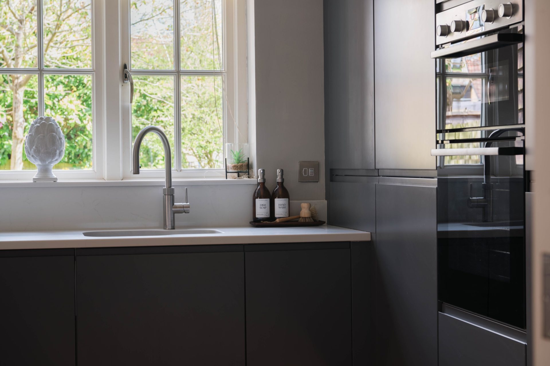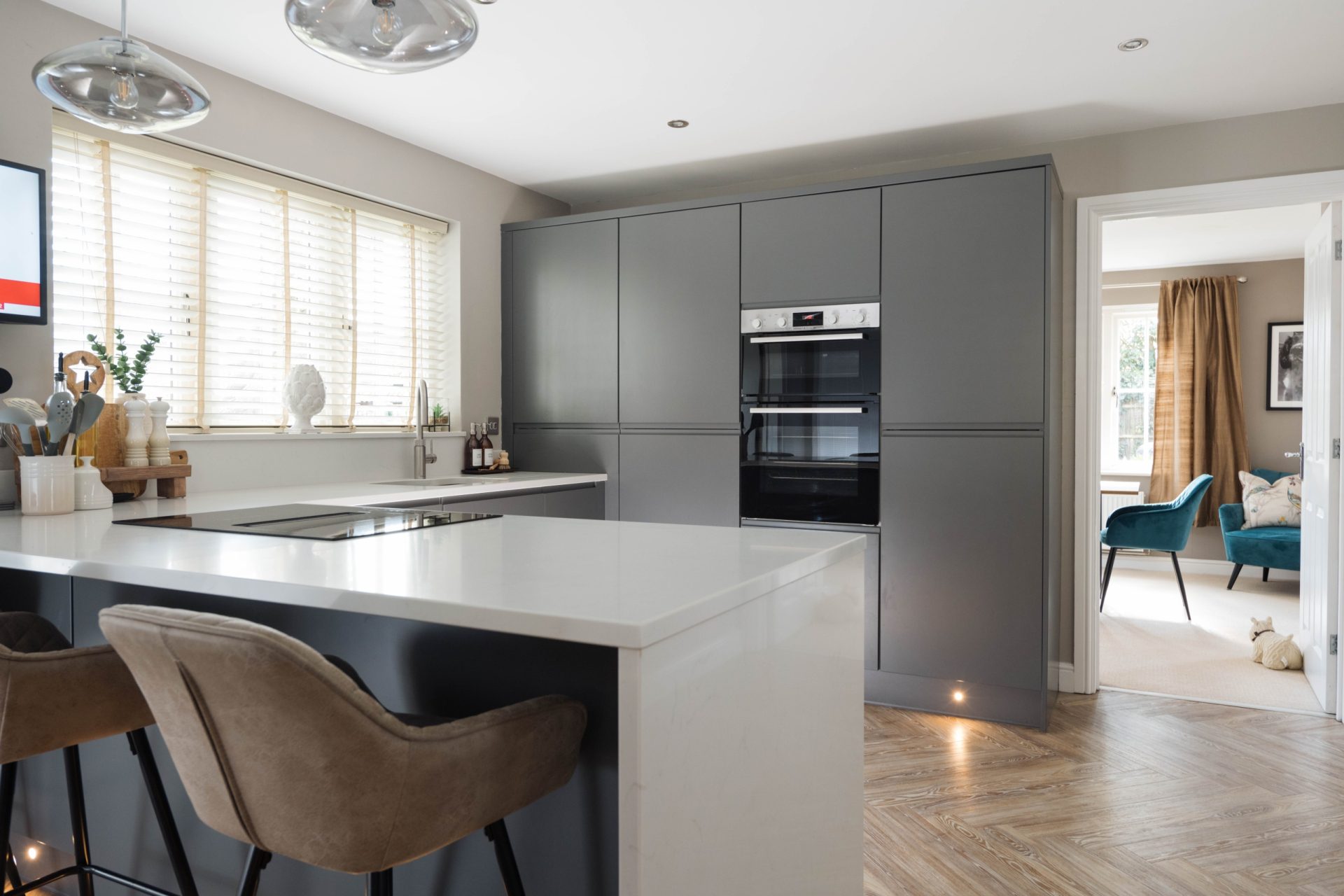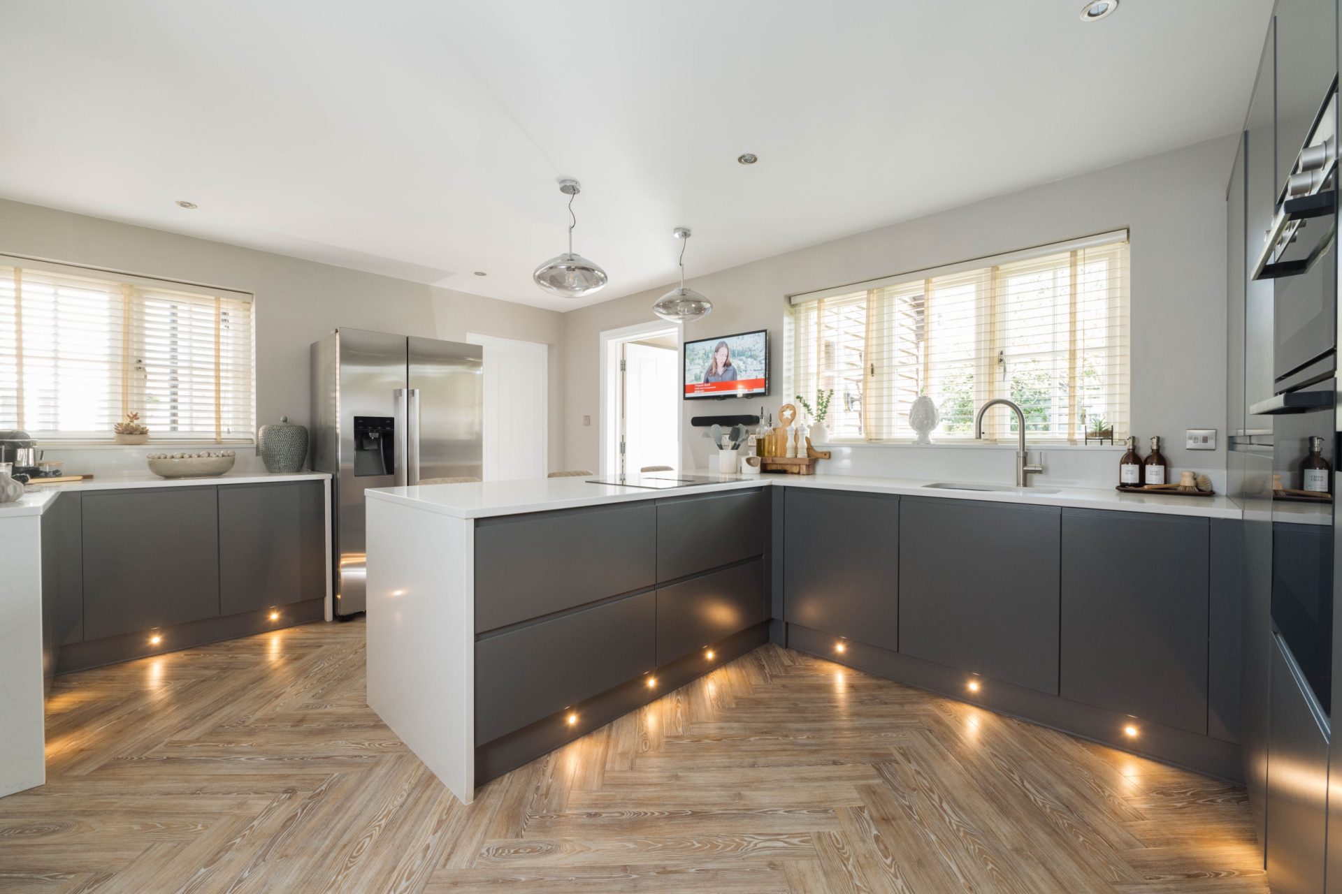 The beautifully finished kitchen has a range of matt cabinets with quartz work surfaces. The upstands have been custom-built to include a sink with Quooker tap, a breakfast bar and integrated appliances such as a double oven, an induction hob with a down draft extractor and a dishwasher. There is also ample space for an American-style fridge/freezer and access to the internal garage.