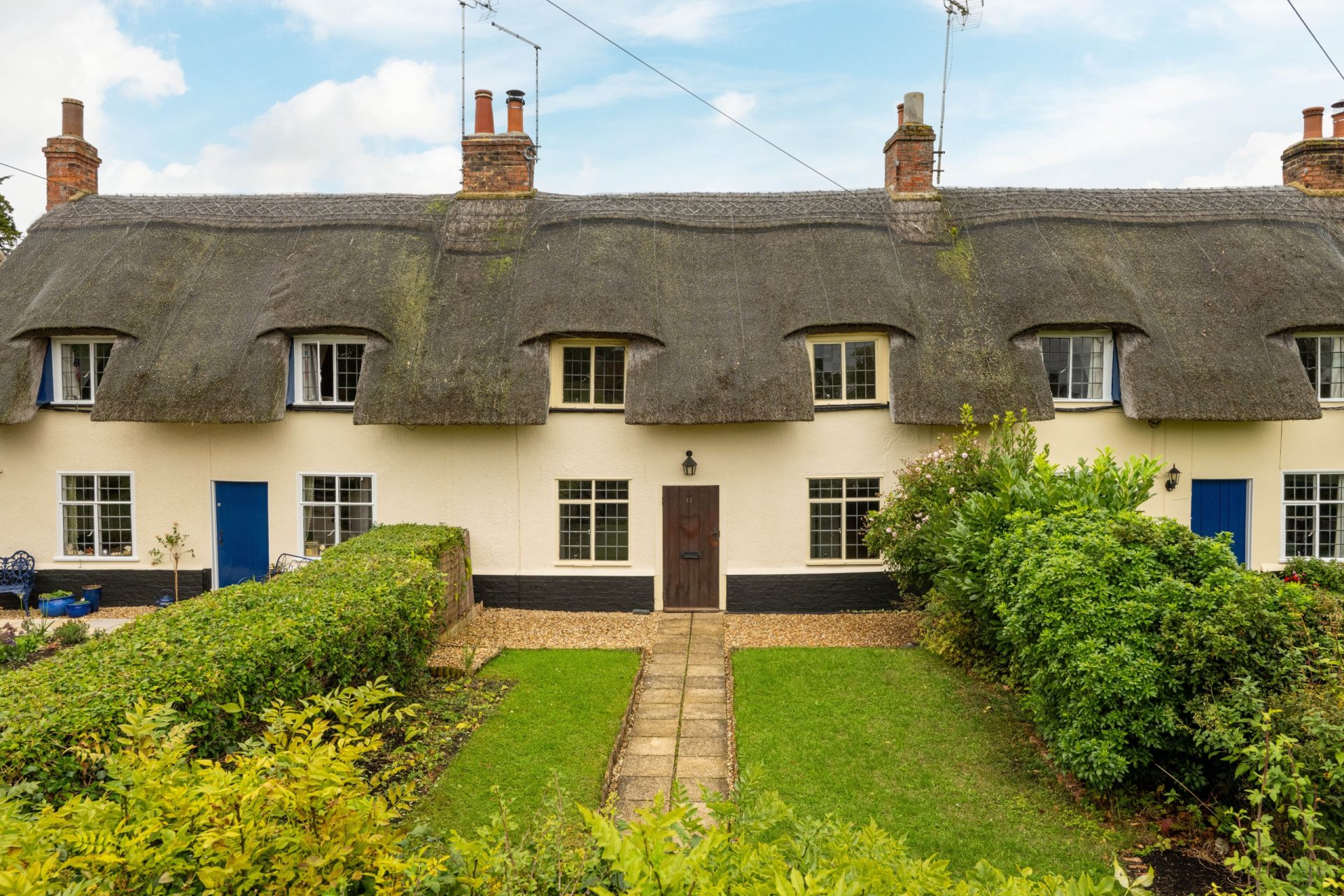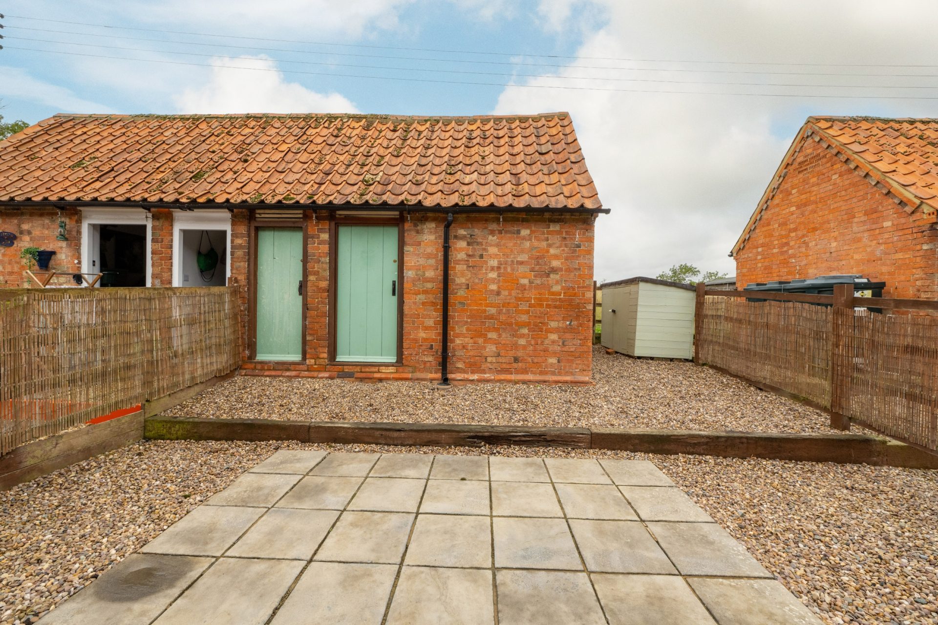 The cottage is approached through a front garden bordered with hedging, with a lawn and central path leading to the entrance. To the rear, a courtyard-style garden with paved and gravel areas provides a low-maintenance outdoor space, with scope for seating and container planting. The red-brick outbuilding housing the office and store completes the setting, while the rear aspect offers a private and secure environment.