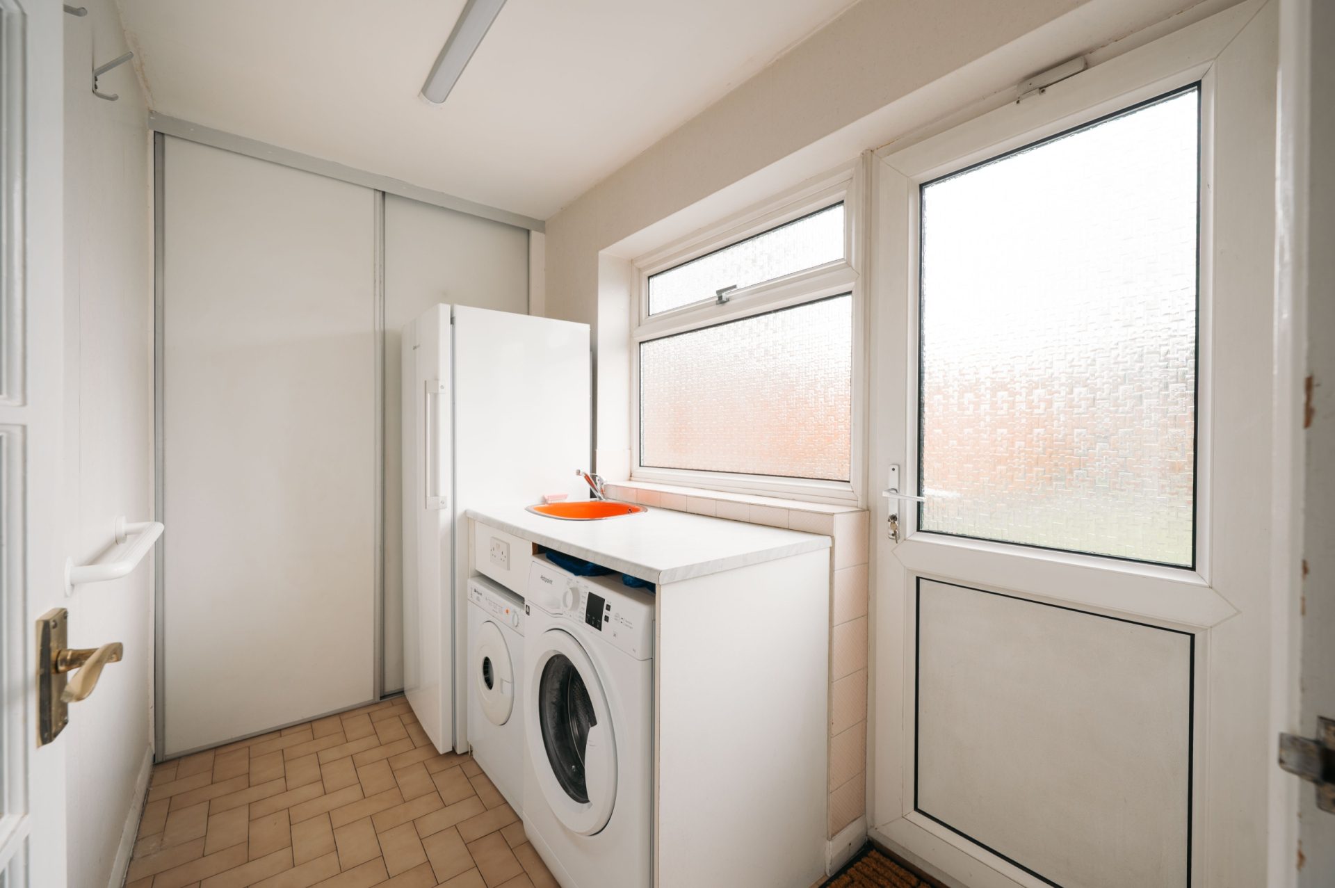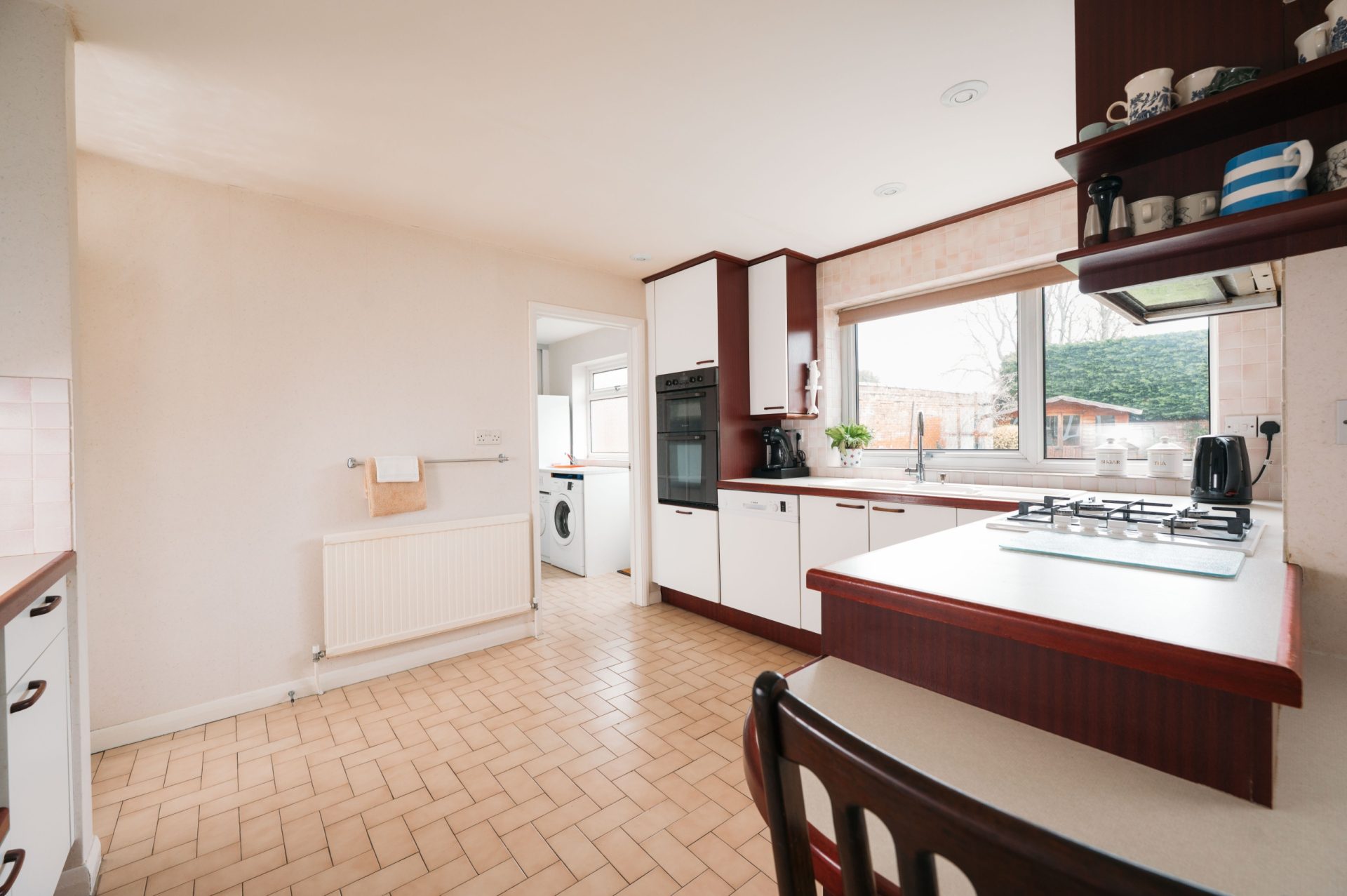 The kitchen/breakfast room is a good size and arranged as a practical family room with extensive fitted cabinetry, integrated ovens, work surface space and room for a breakfast table. The adjoining utility room provides further storage and laundry space, with external access to the side.