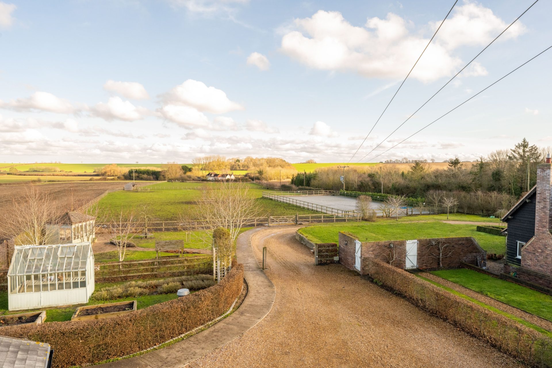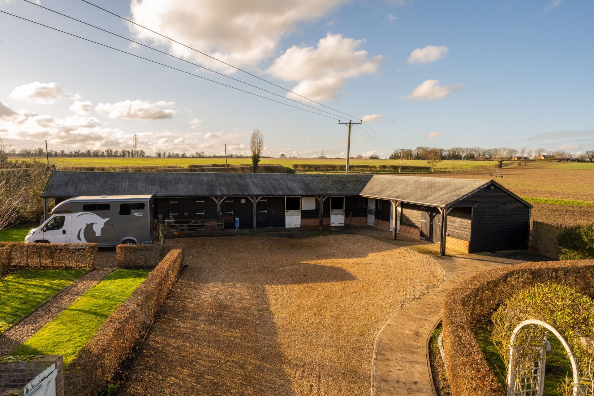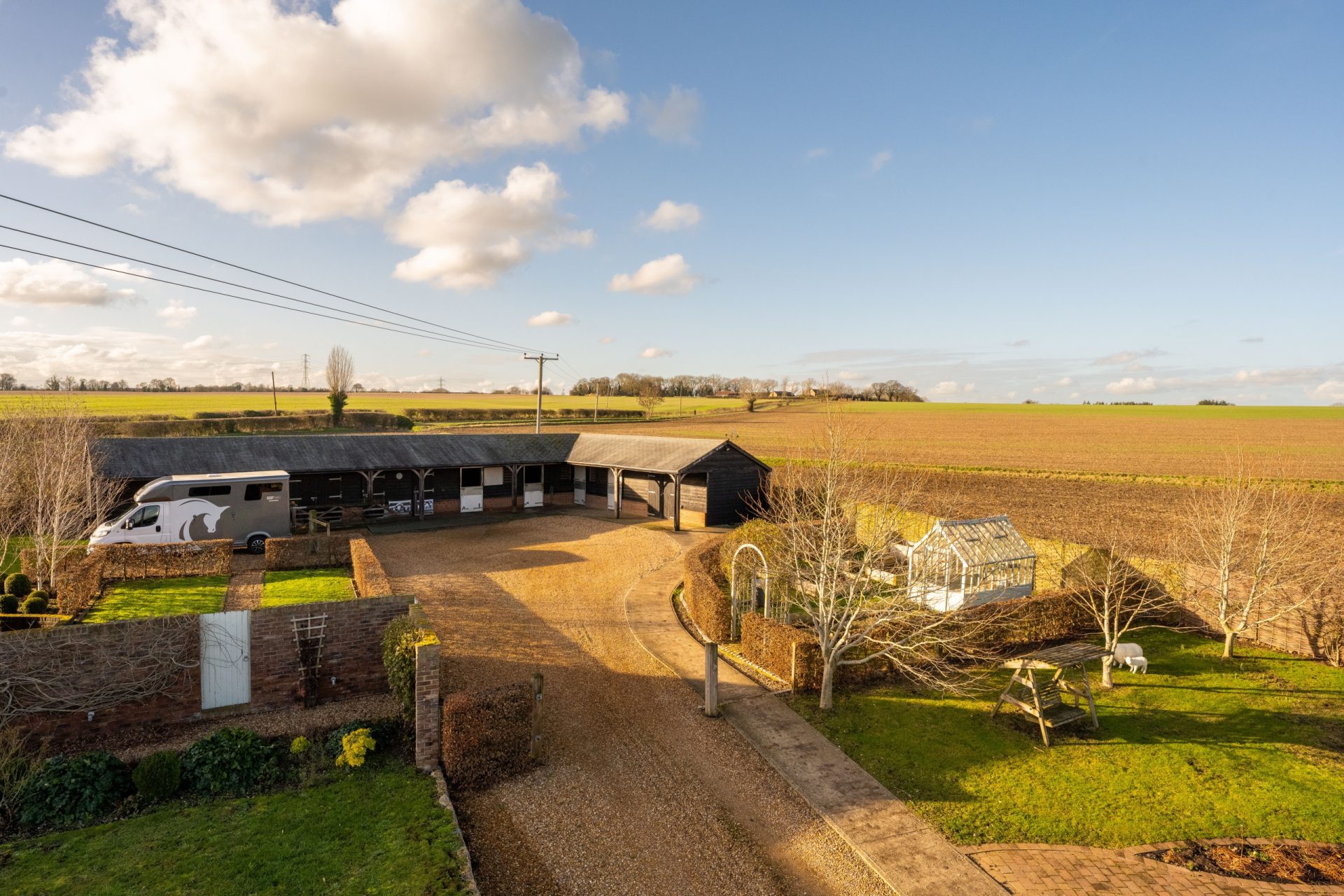 A particular highlight of Nine Ashes is the quality and arrangement of its equestrian facilities, designed to be practical, well organised and easy to manage. The outbuildings are constructed by Ashcroft, with featherboard elevations and a pitched tiled roof, and incorporate four stables, a hay barn, a tack room (with plumbing for a washing machine), a feed store, a gym/store, a workshop, and a carport, creating a comprehensive setup for day-to-day use.