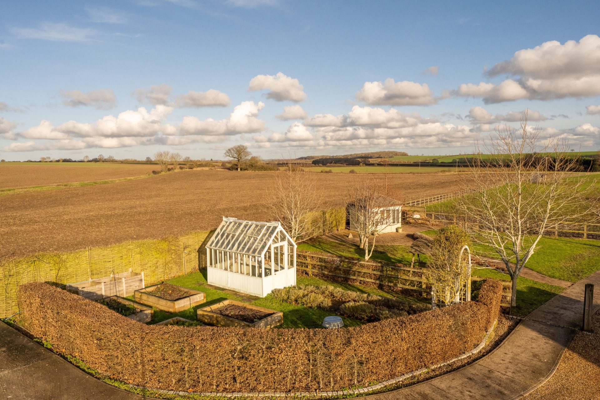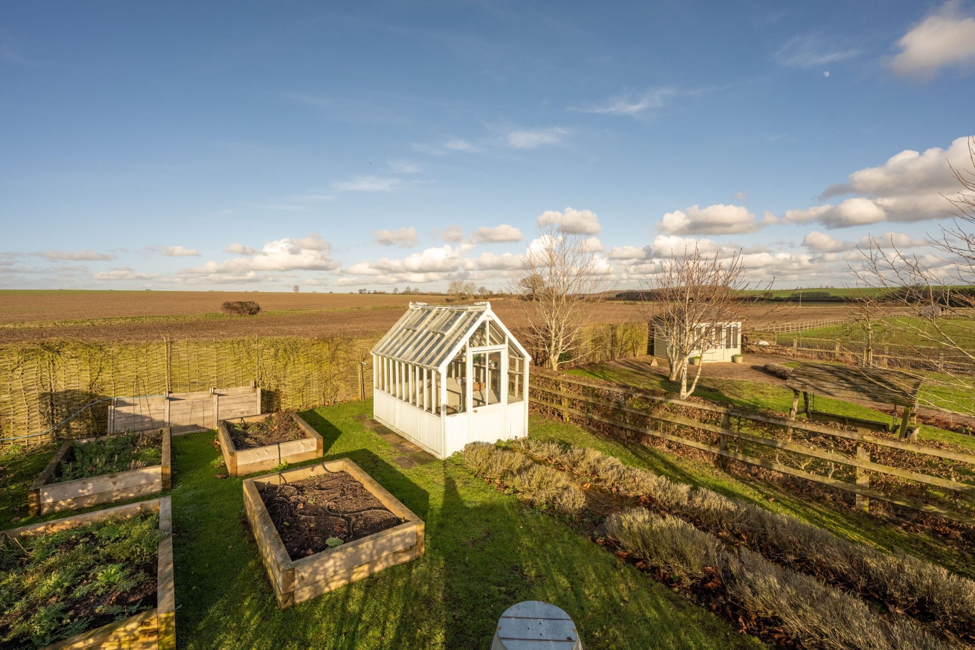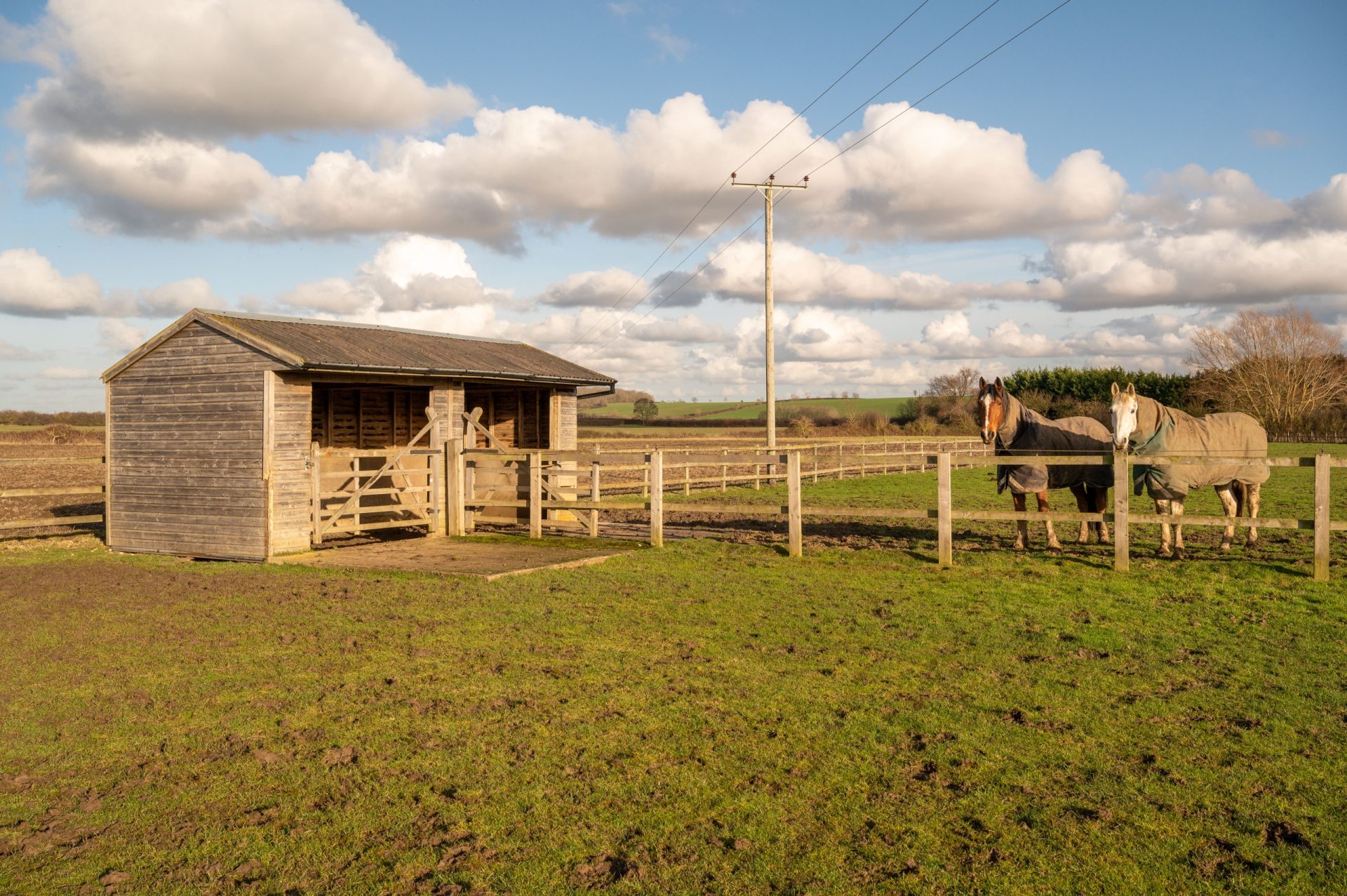 A particular highlight of Nine Ashes is the quality and arrangement of its equestrian facilities, designed to be practical, well organised and easy to manage. The outbuildings are constructed by Ashcroft, with featherboard elevations and a pitched tiled roof, and incorporate four stables, a hay barn, a tack room (with plumbing for a washing machine), a feed store, a gym/store, a workshop, and a carport, creating a comprehensive setup for day-to-day use.