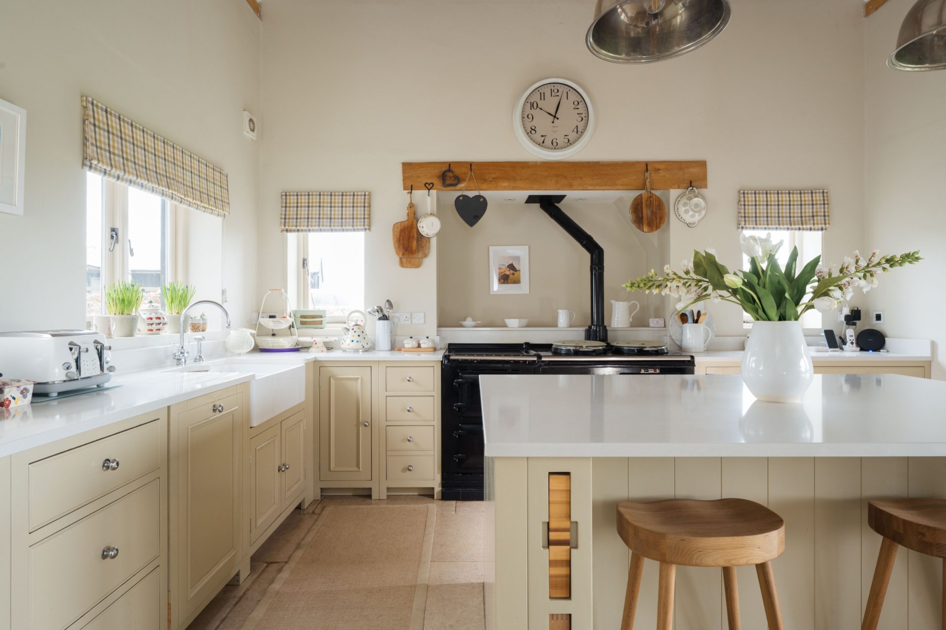 At the heart of the home is the outstanding open-plan kitchen/dining/family room, designed for modern living and entertaining. The kitchen is fitted with a bespoke range of hand-painted Neptune cabinetry, including a central island with breakfast bar and granite work surfaces. Appliances include a two-oven LPG-fired Aga, electric oven, dishwasher and wine chiller.