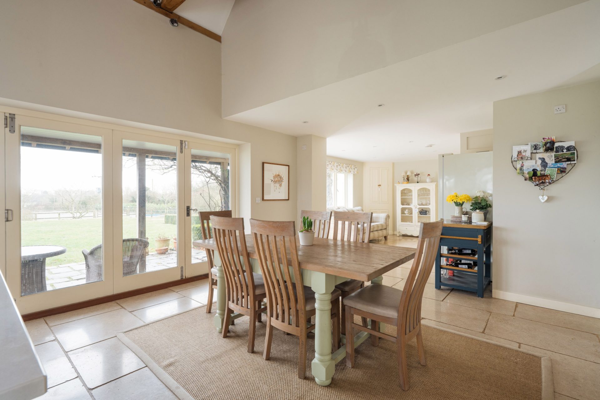 The dining area is particularly striking, featuring a vaulted ceiling with exposed beams and timbers, enhanced by feature lighting that highlights the architecture of the room. Bi-fold doors open to the front, creating an easy connection to the outside space. The family area provides a comfortable everyday seating zone and benefits from a bespoke range of fitted storage cupboards, adding both style and practicality.