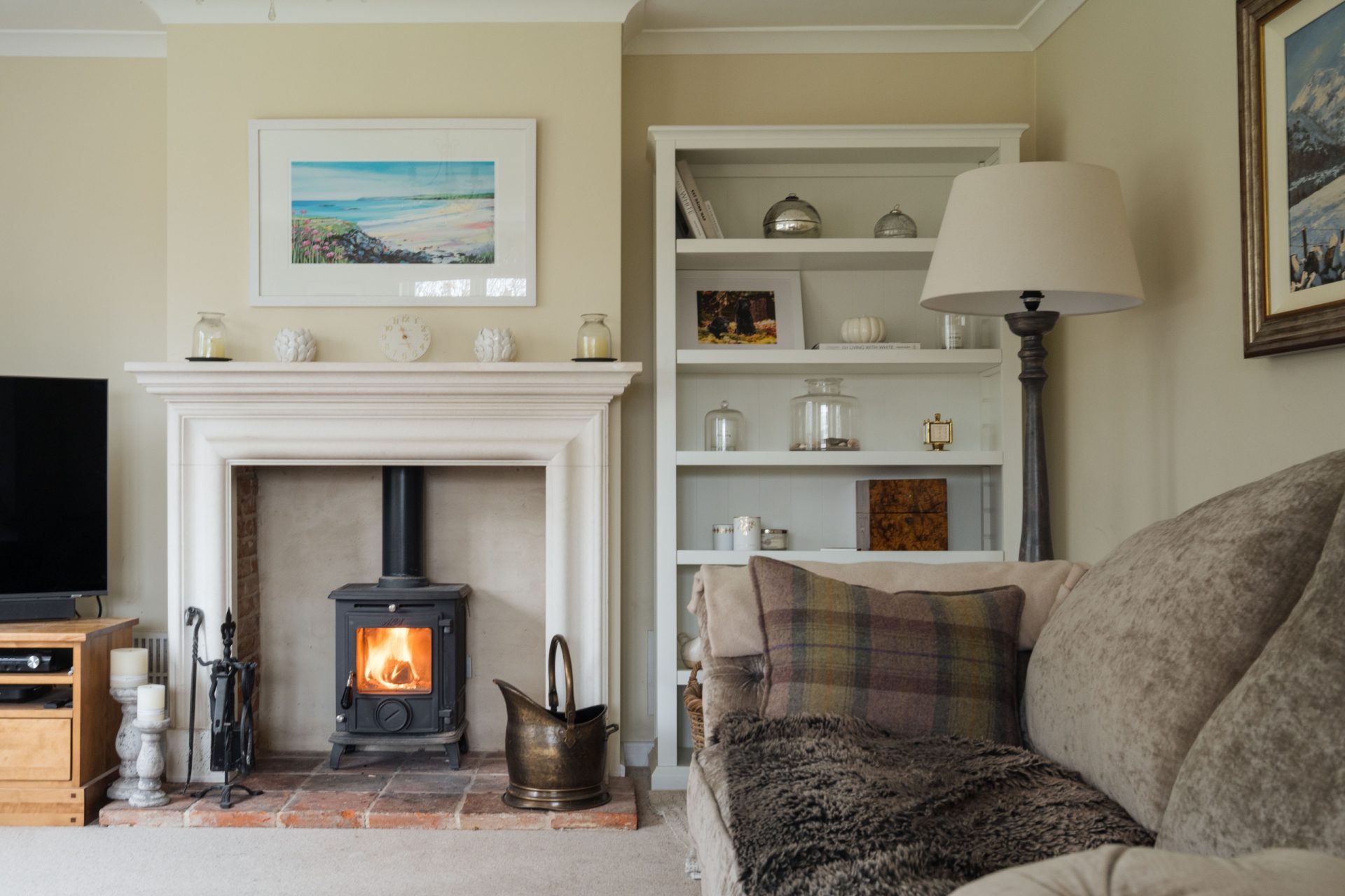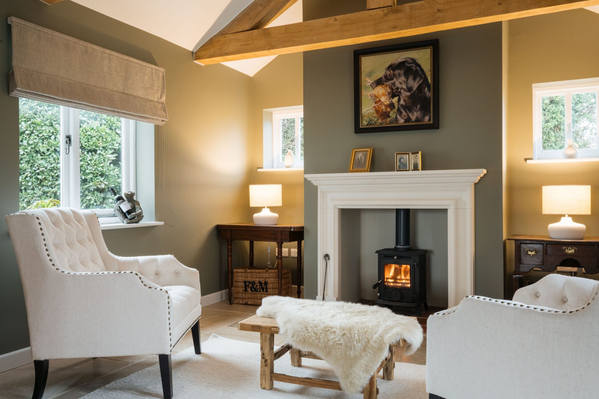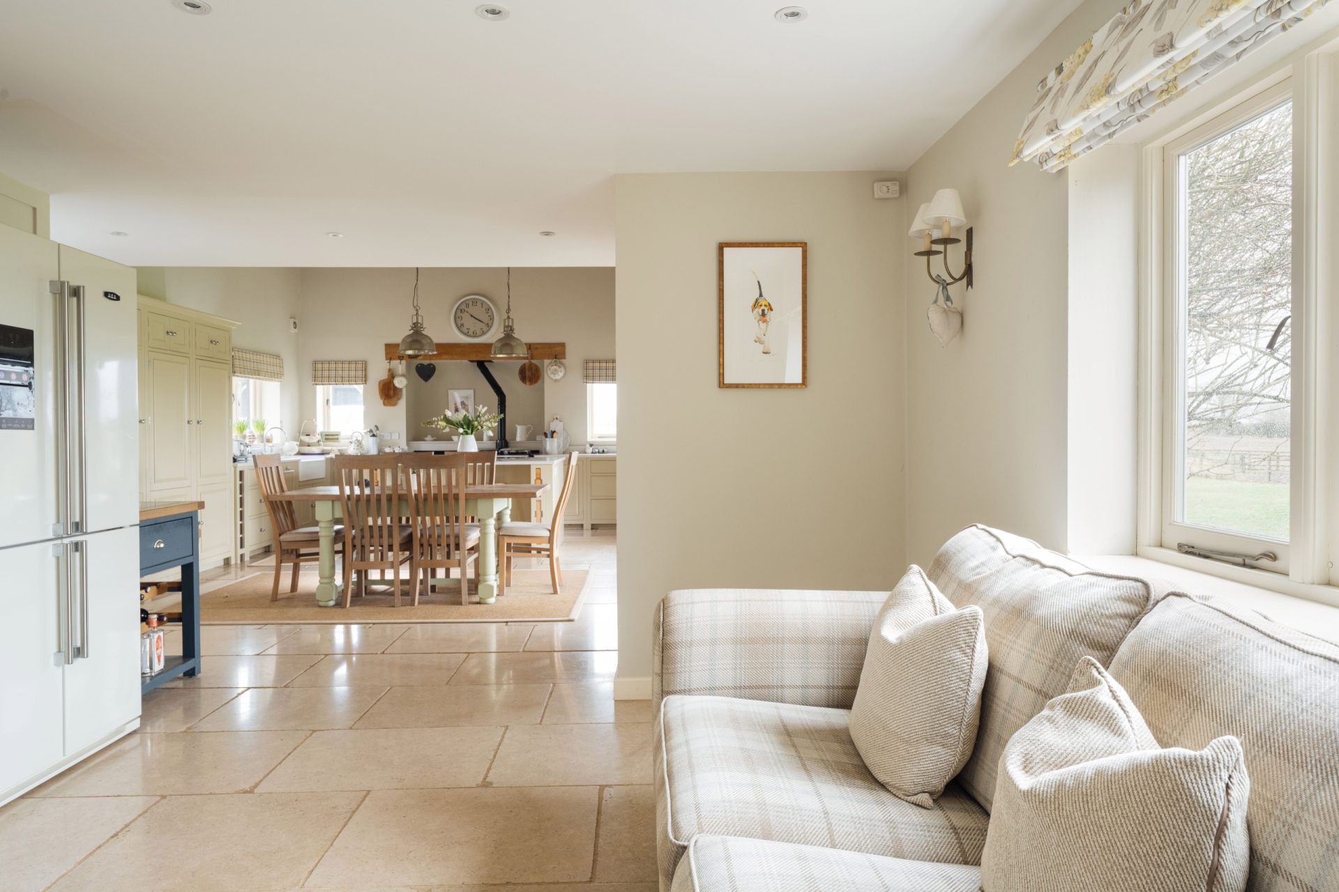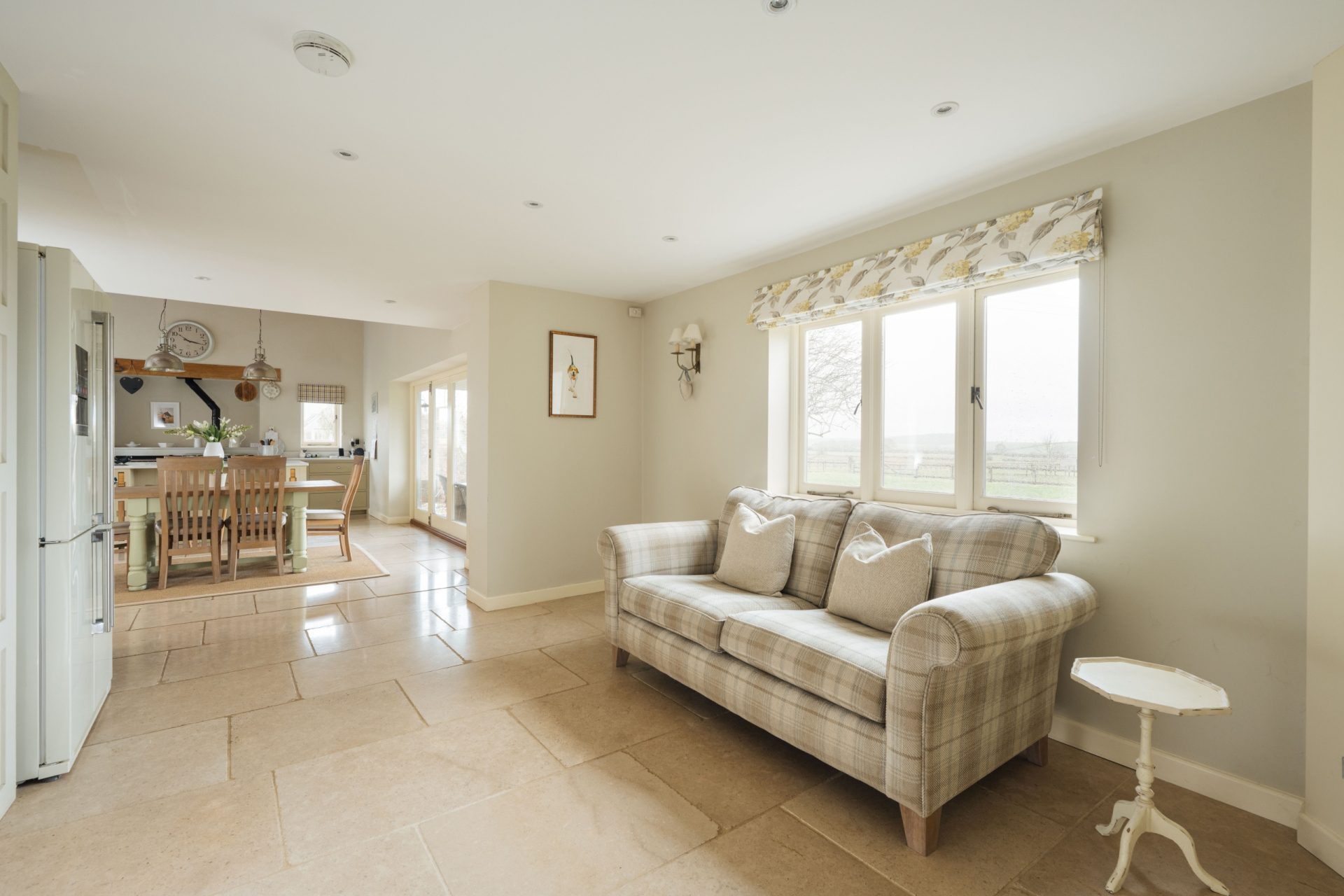 The main living spaces are arranged to provide both comfort and flexibility. The sitting room is a generous reception room, centred around a limestone fireplace with log burning stove, creating a warm and inviting atmosphere. A further reception room, currently used as a snug/home office, offers a more relaxed everyday space and also features a limestone fireplace with log burner, complemented by glazed double doors opening to the side.