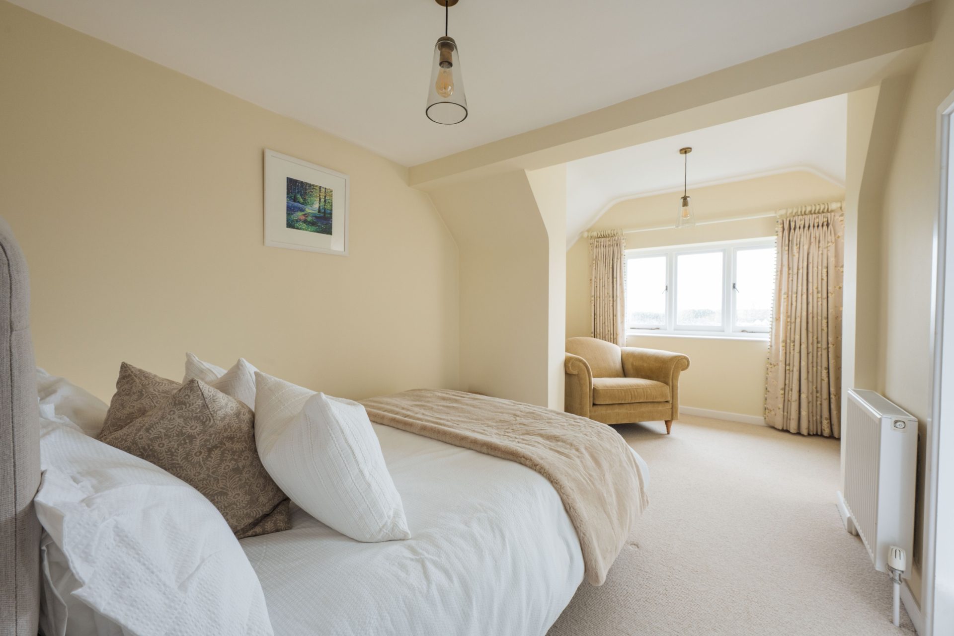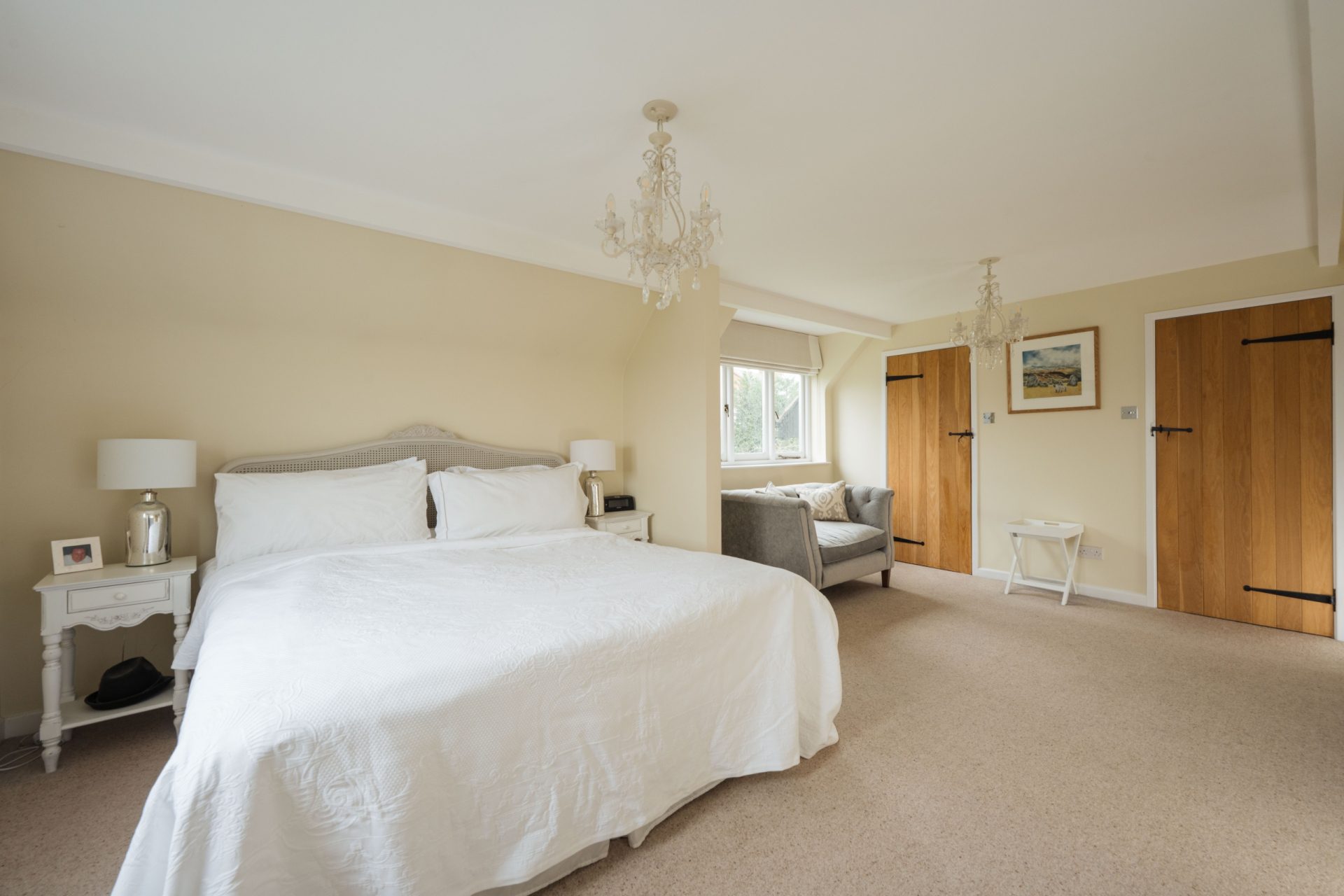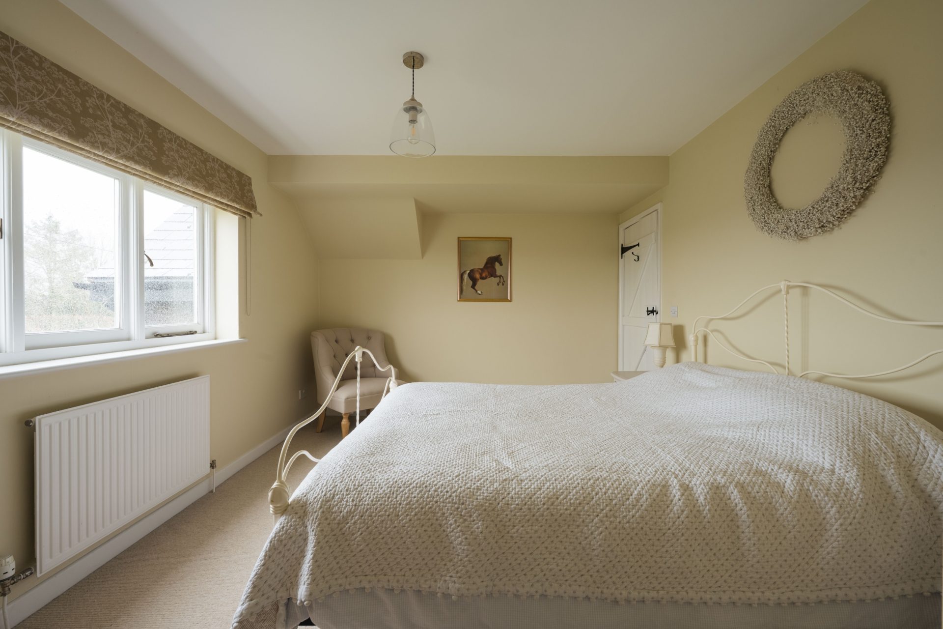 The principal bedroom is a particularly impressive room, generous in scale and enjoying a dual aspect with attractive views across the gardens and paddocks. It offers ample space for freestanding furniture and creates a calm, private retreat, served by a stylishly refitted en-suite shower room.