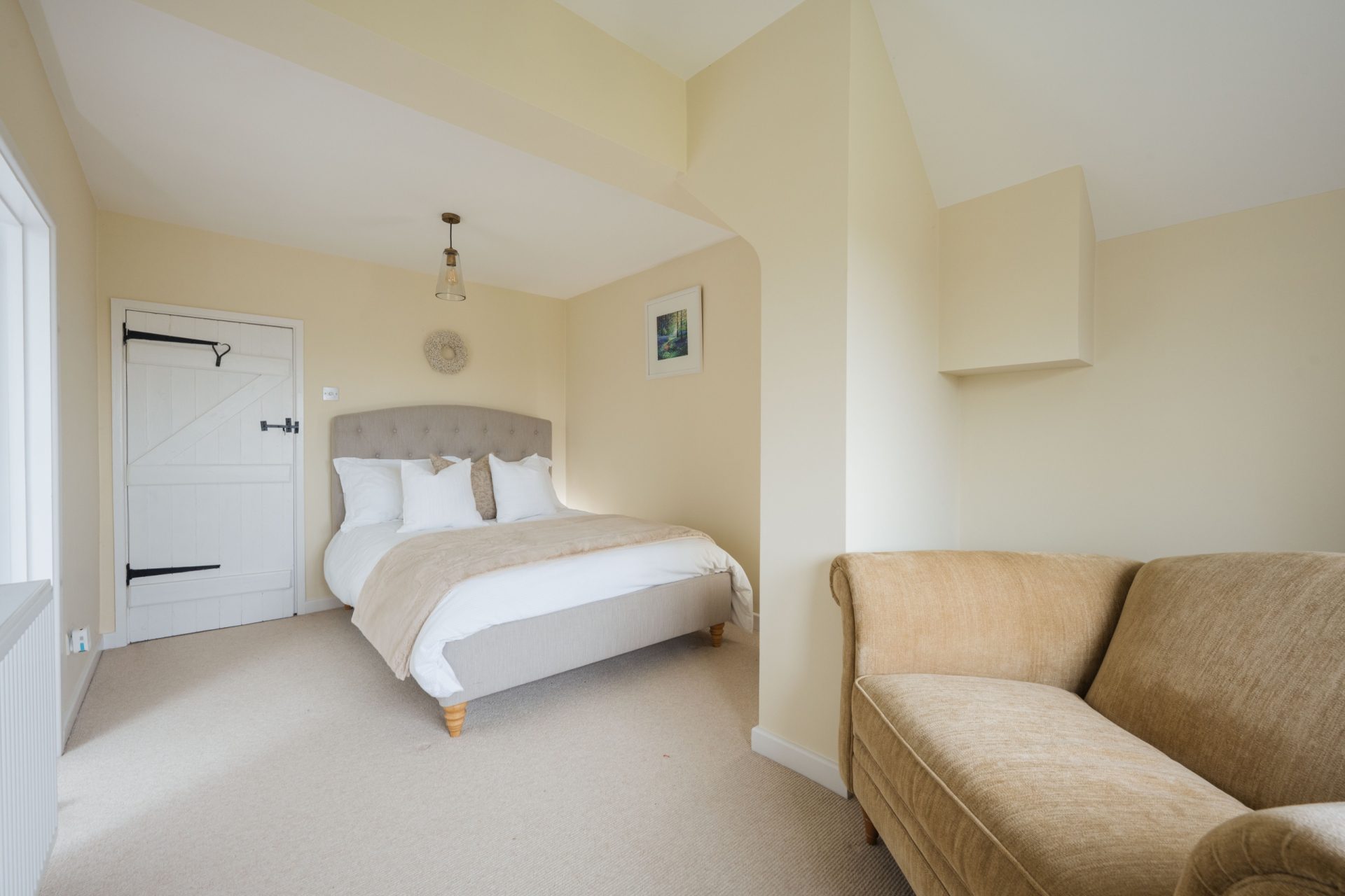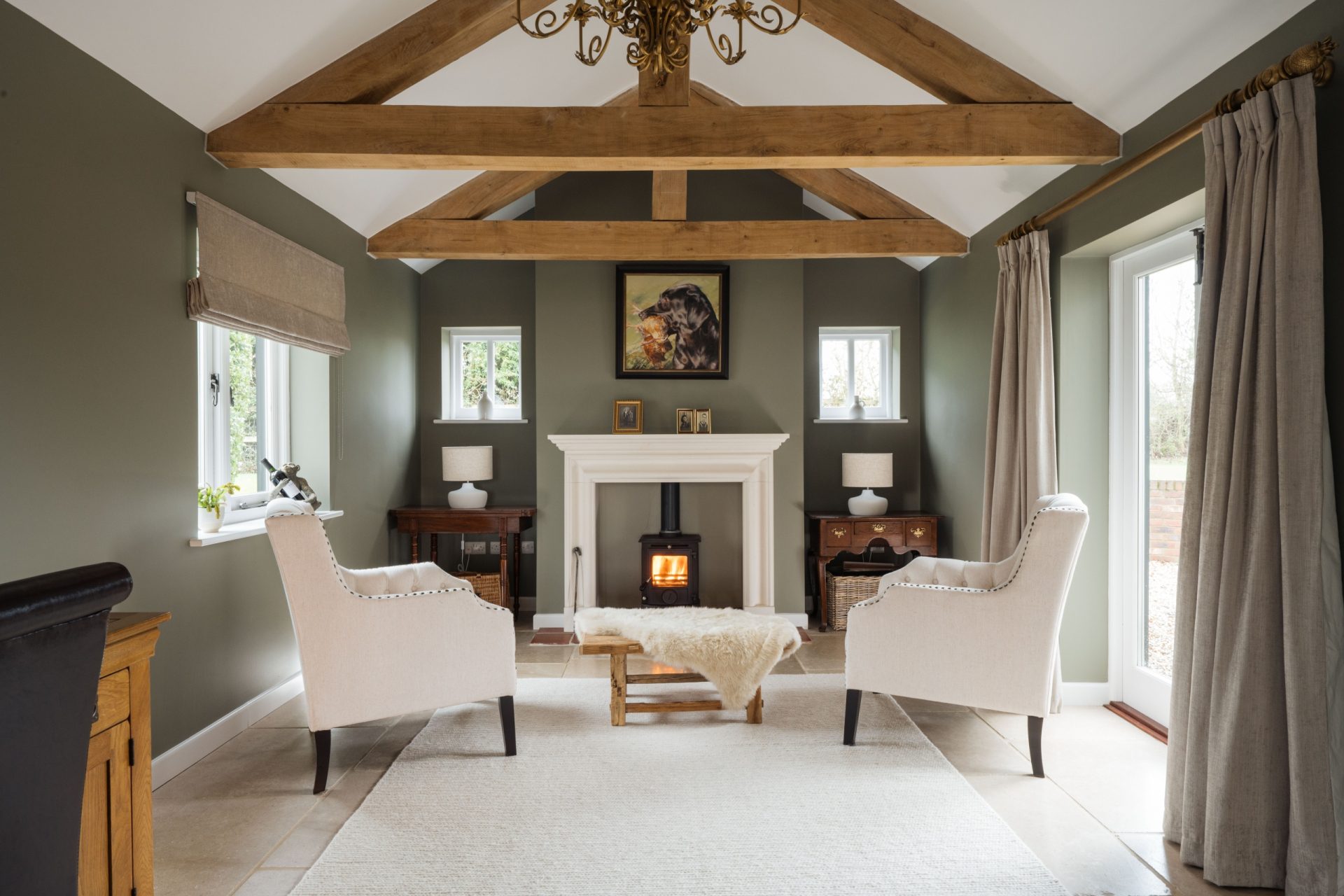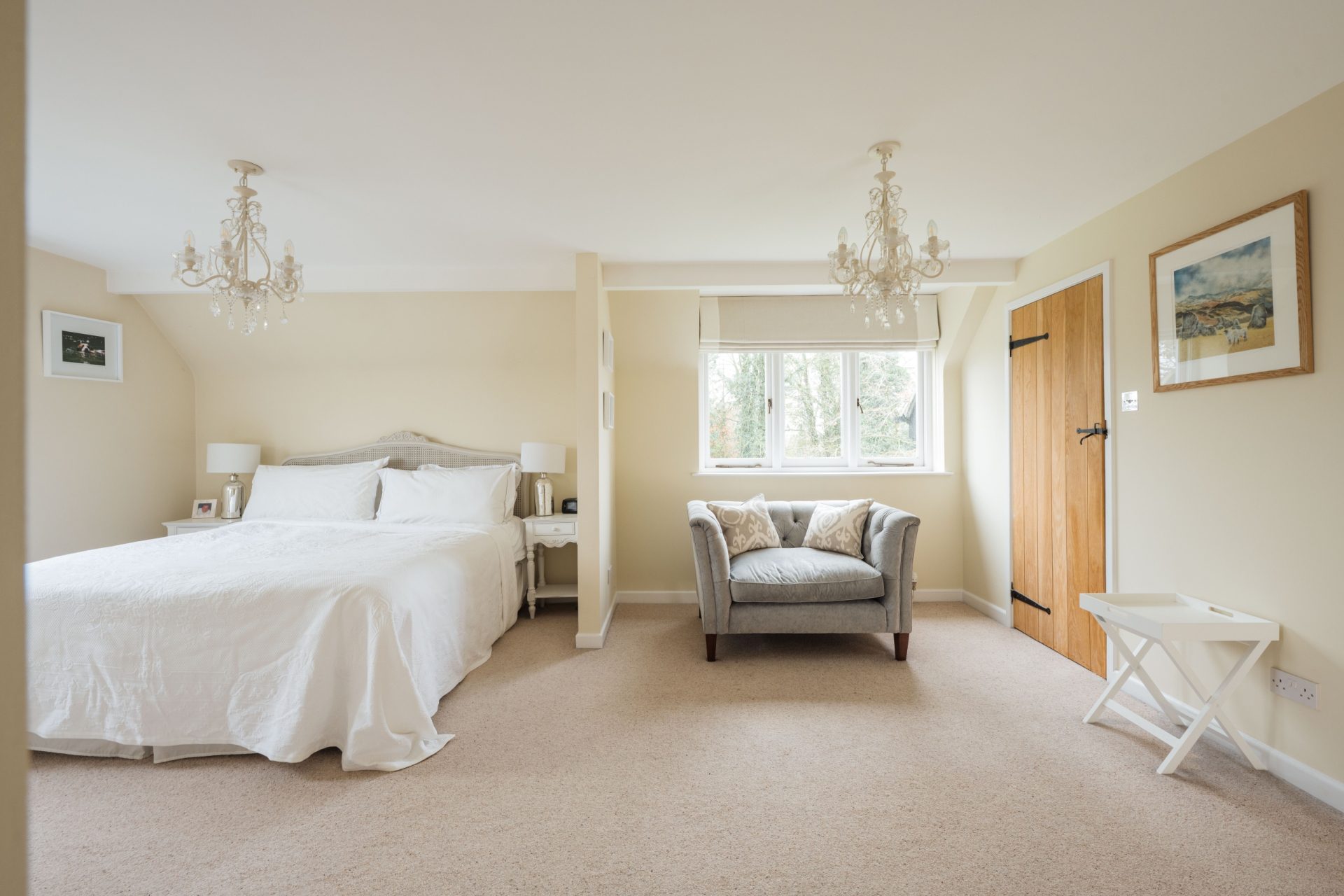 The principal bedroom is a particularly impressive room, generous in scale and enjoying a dual aspect with attractive views across the gardens and paddocks. It offers ample space for freestanding furniture and creates a calm, private retreat, served by a stylishly refitted en-suite shower room.
