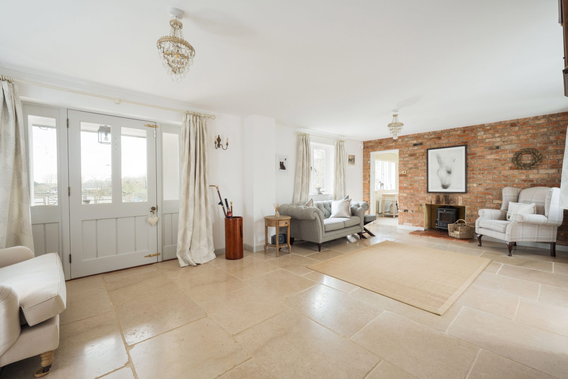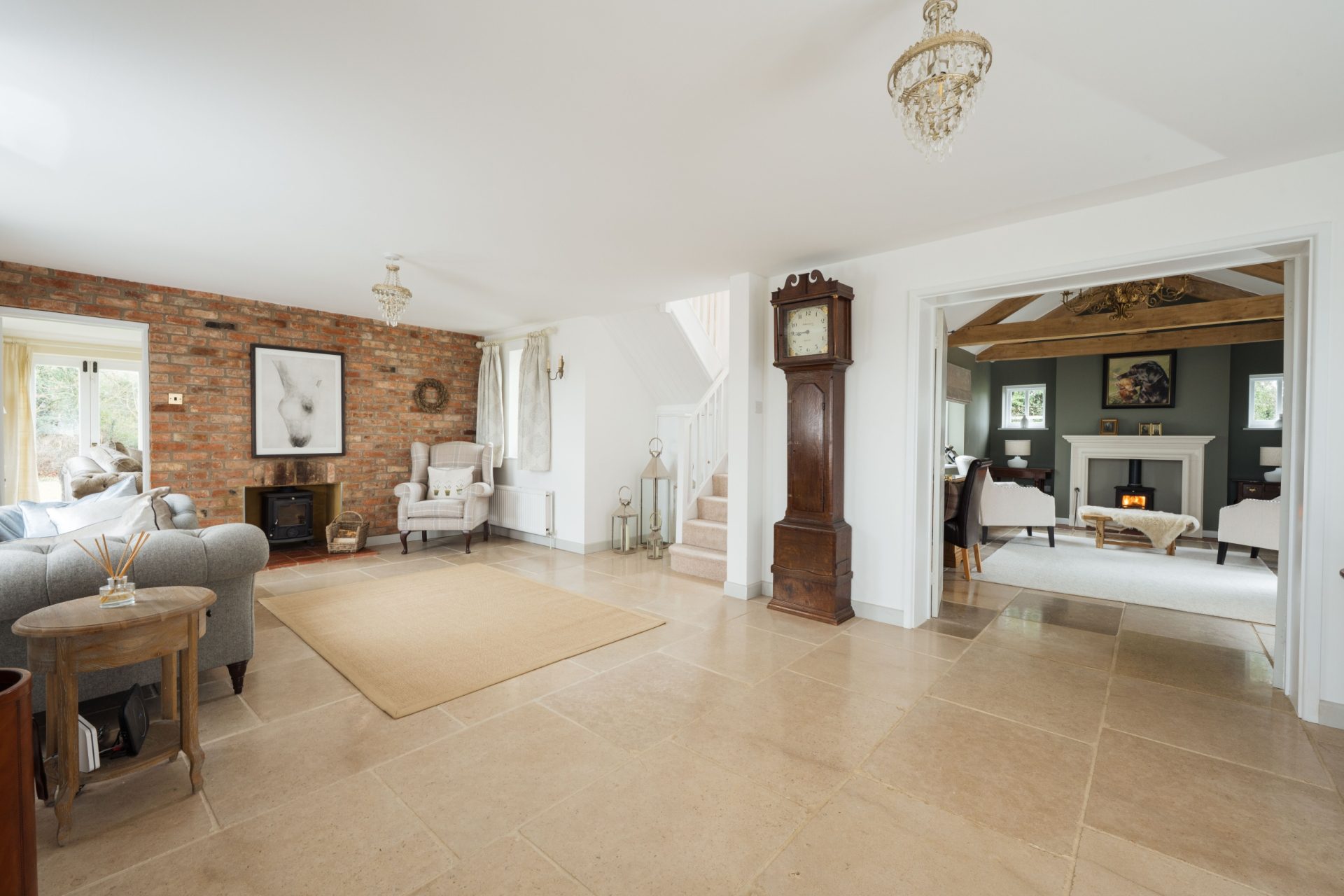 The house is entered via an impressive reception hall, setting the tone immediately with a feature fireplace housing a log burning stove and a limestone tiled floor with underfloor heating, which continues throughout the ground floor.