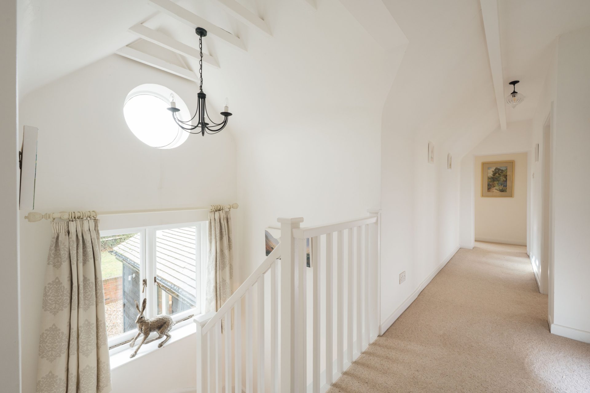 Stairs rise to a spacious first-floor landing, which immediately feels bright and open, with a part-vaulted ceiling, a distinctive porthole window, and a useful linen cupboard. The landing also creates a natural separation between the principal bedroom suite and the remaining accommodation, helping the first floor feel well-balanced and practical for family living.