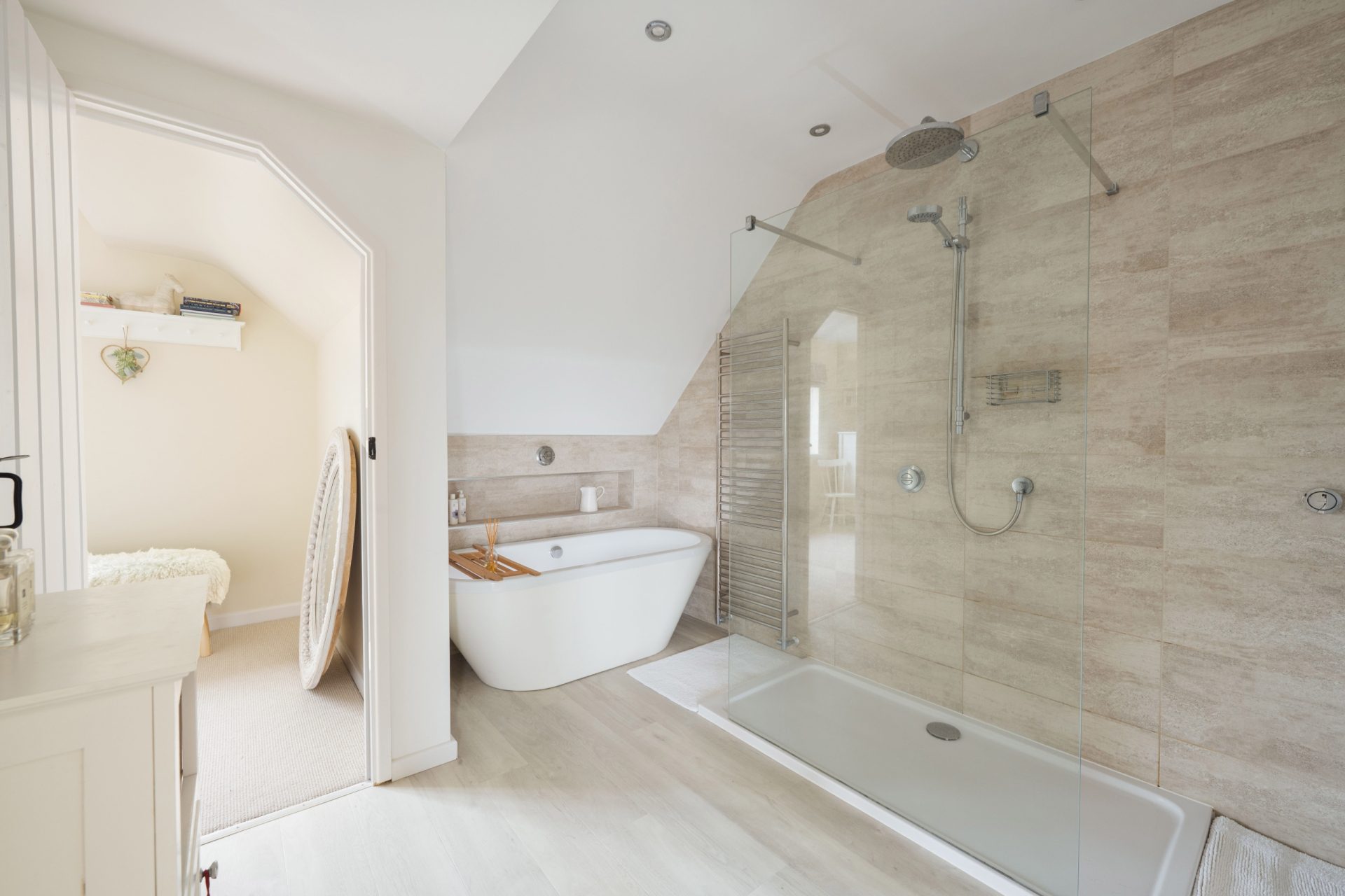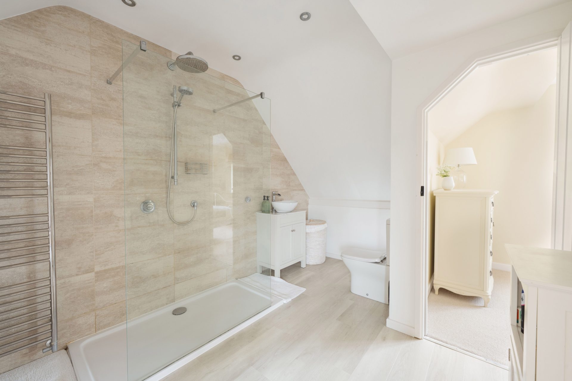 There are two further double bedrooms, both well-proportioned and served by a smart Jack-and-Jill en suite, finished in a modern style and ideal for everyday family use. The arrangement works particularly well for those requiring multiple bedrooms on one level, and the consistent standard of presentation throughout the first floor reflects the care and attention that has gone into the home’s refurbishment.