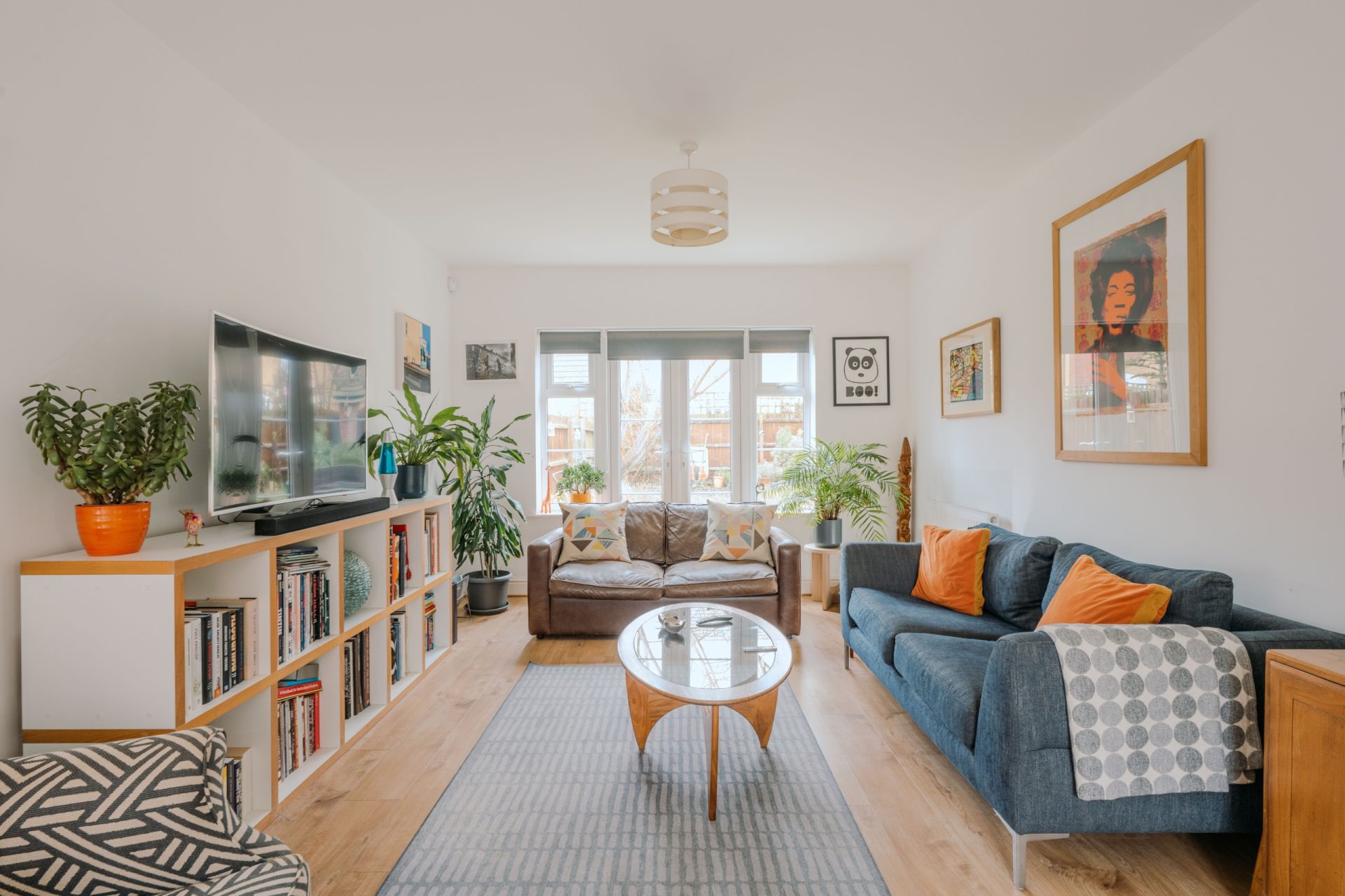 The sitting room is a generous and comfortable everyday living space, finished with wood-effect flooring and enjoying good natural light. French doors open directly to the rear garden, providing an excellent connection between the main reception room and the outdoor seating area.
