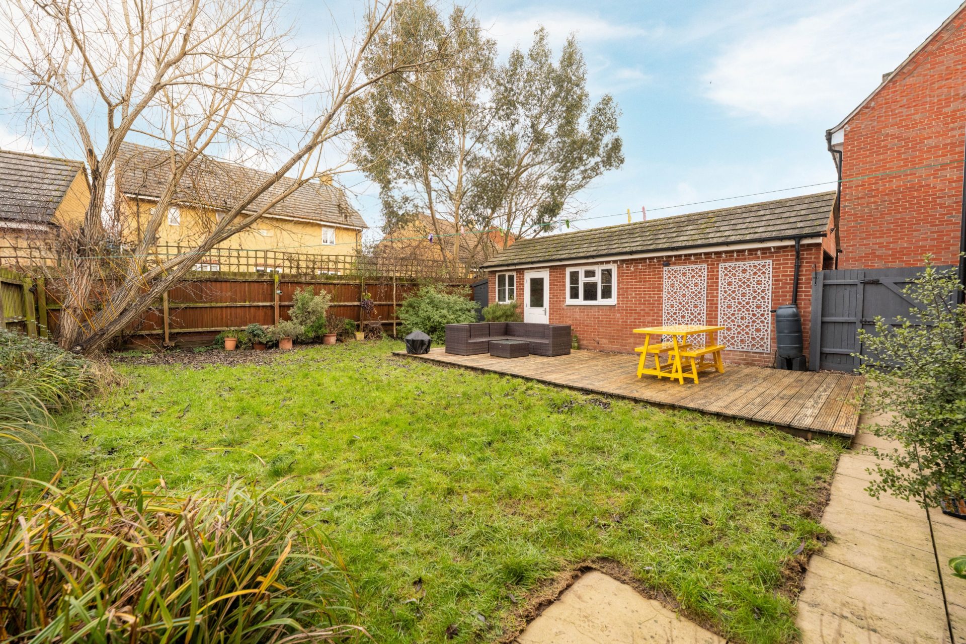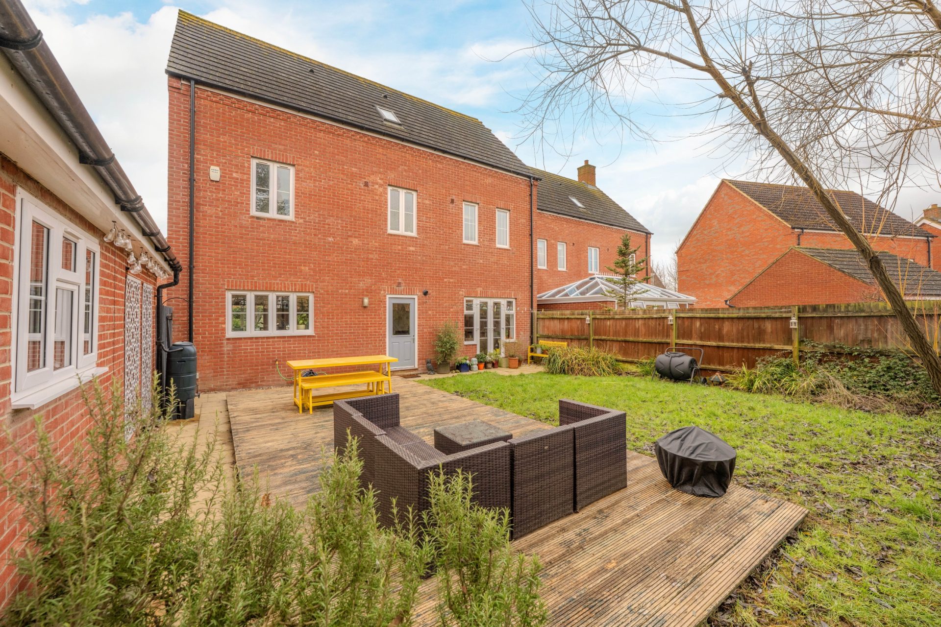 To the rear, the garden is enclosed and arranged with a generous decked seating area, ideal for outdoor dining and entertaining. The remainder is mainly laid to lawn, providing a good balance of usable outdoor space and low-maintenance areas.