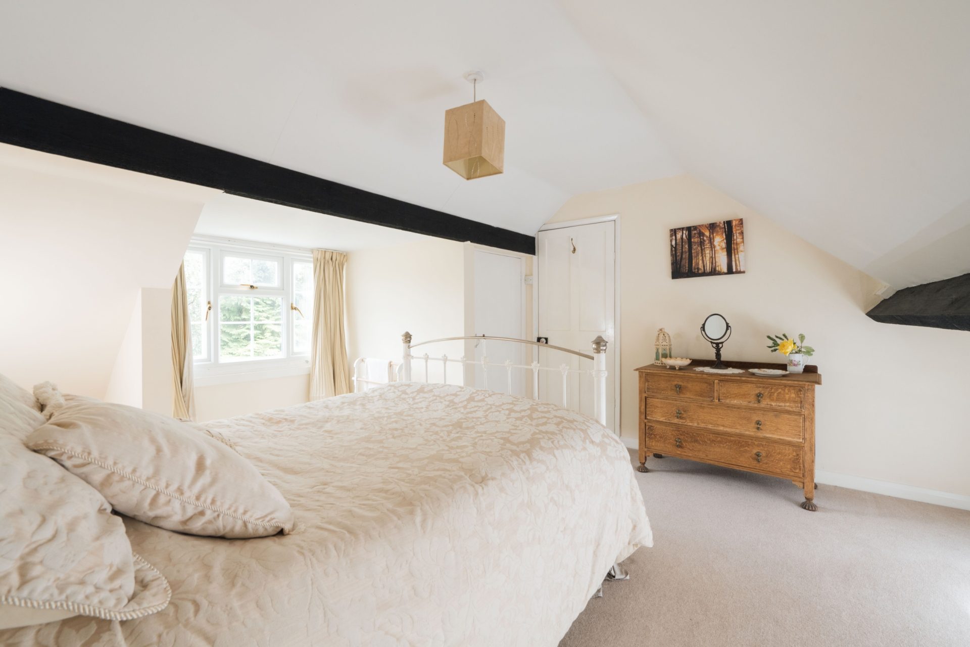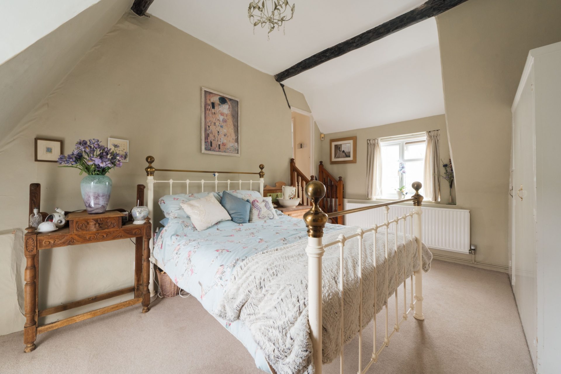 Bedroom Two is accessed via the staircase from the dining room. It features eaves storage, exposed beams, a storage cupboard, and views over the front garden. Bedroom Four is next to Bedroom Three and has two built-in wardrobes.