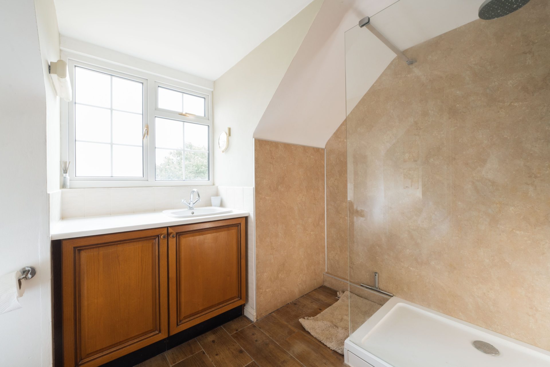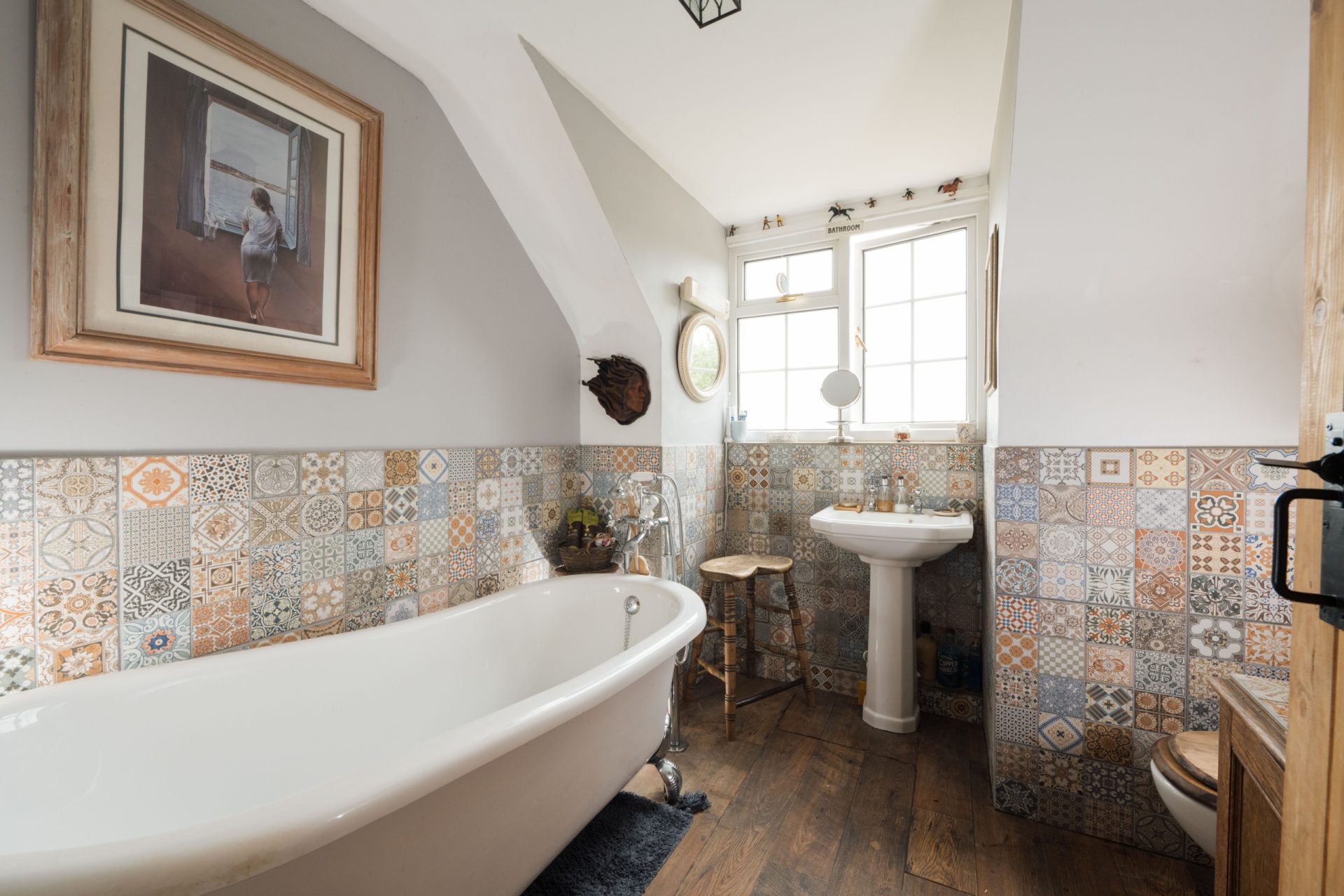 There are two bathrooms. The first bathroom, serving Bedroom One, has a beautiful roll-top bath, detailed tiling, and contemporary sanitary ware. The second bathroom has a large walk-in shower and contemporary sanitary ware.