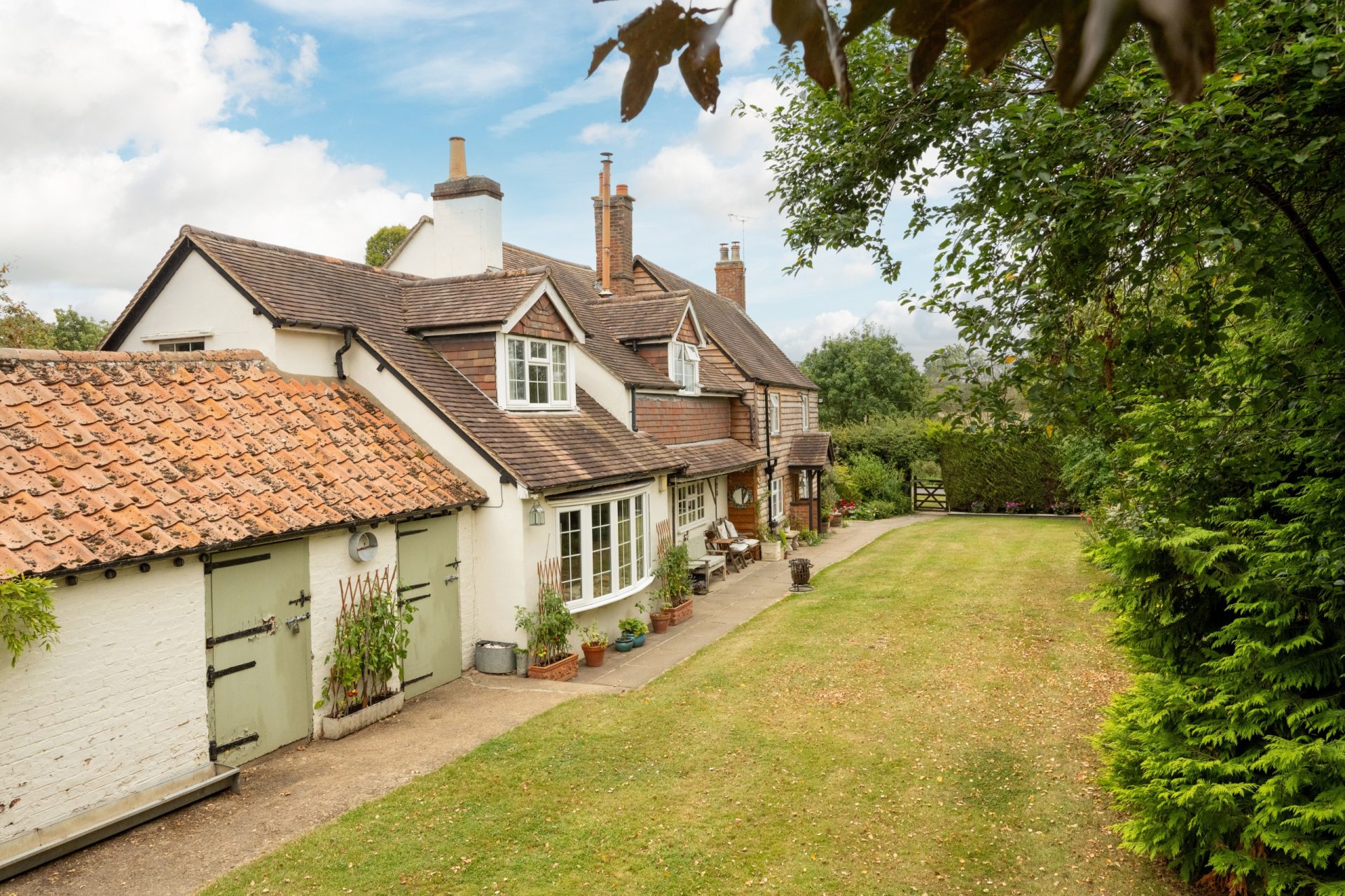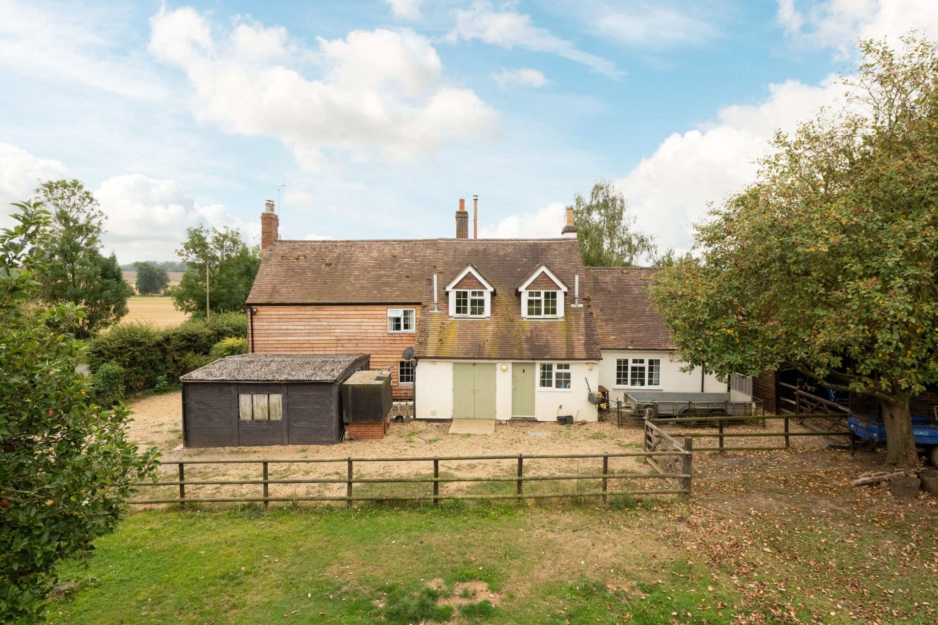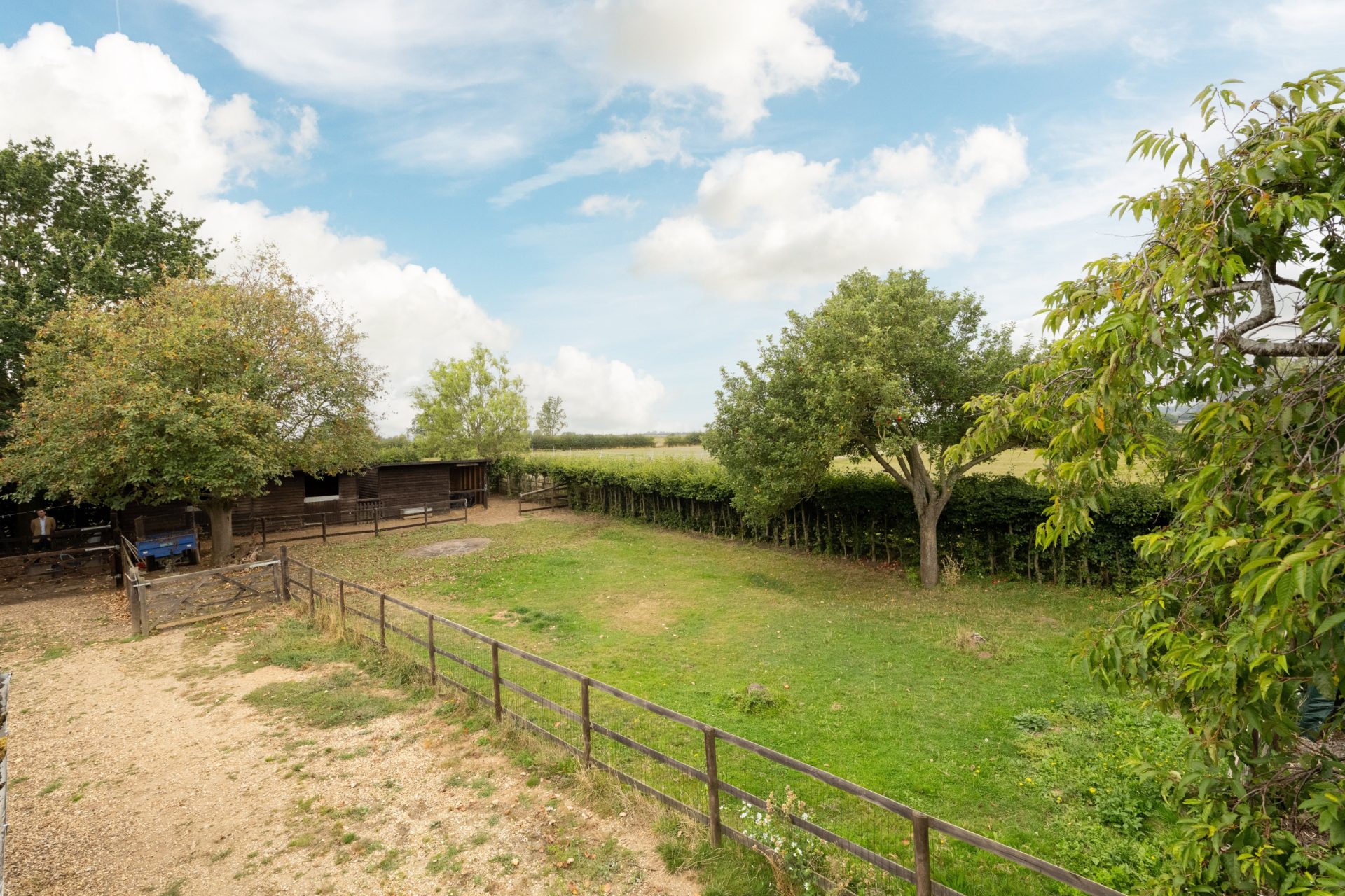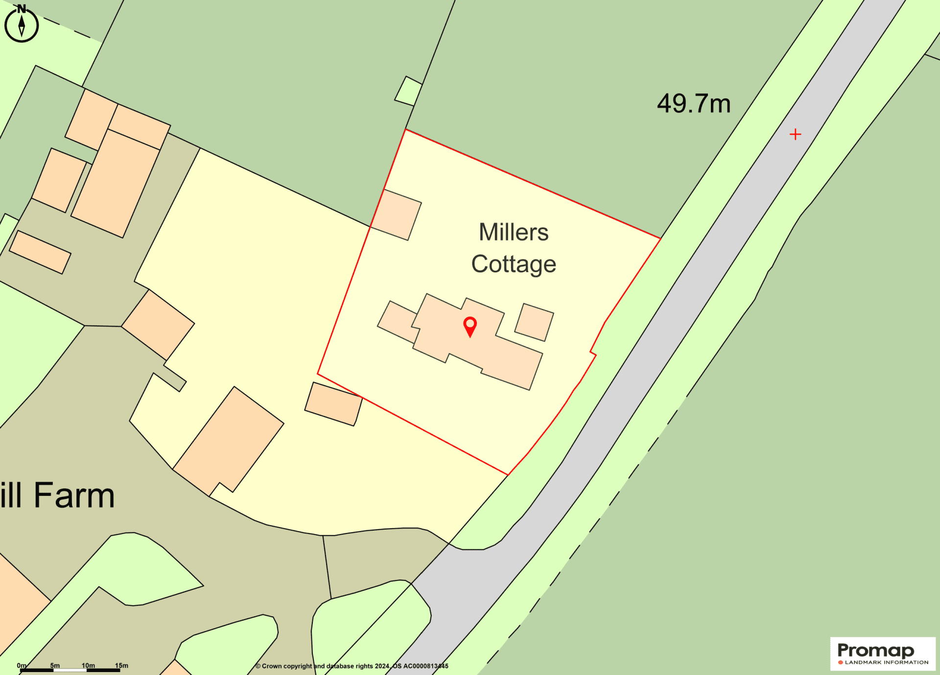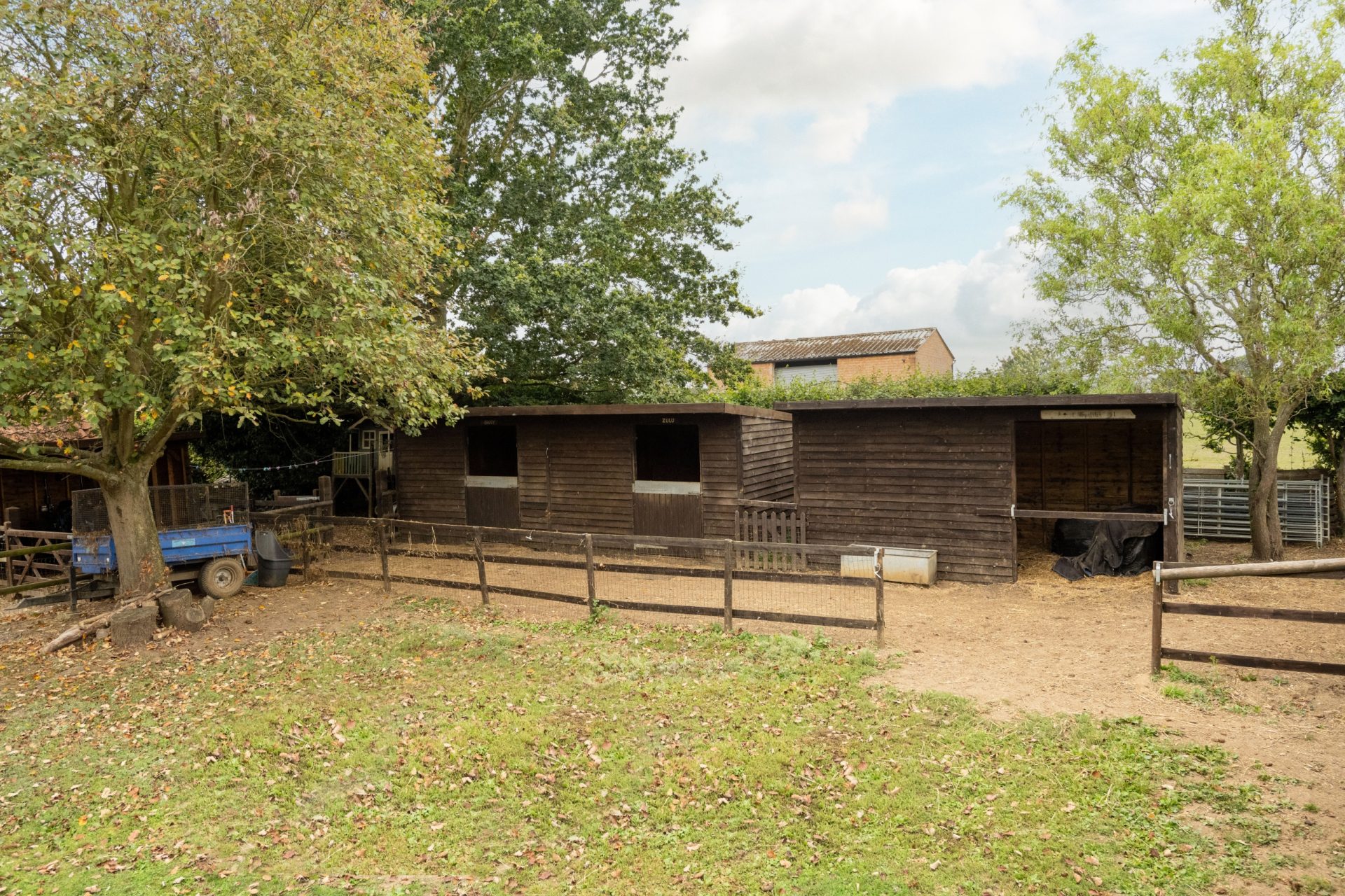Millers Cottage is centrally located on its plot. It features a formal garden with mature shrubs and borders on one side, as well as a large lawned area and a path encircling the property. Towards the back of the home, there is another lawned area currently used for grazing, along with two stables and a pony shelter. A spacious parking area and a double garage with an up-and-over door are also present. The property includes an attached outbuilding that could potentially be converted into living accommodation, subject to planning approval.
